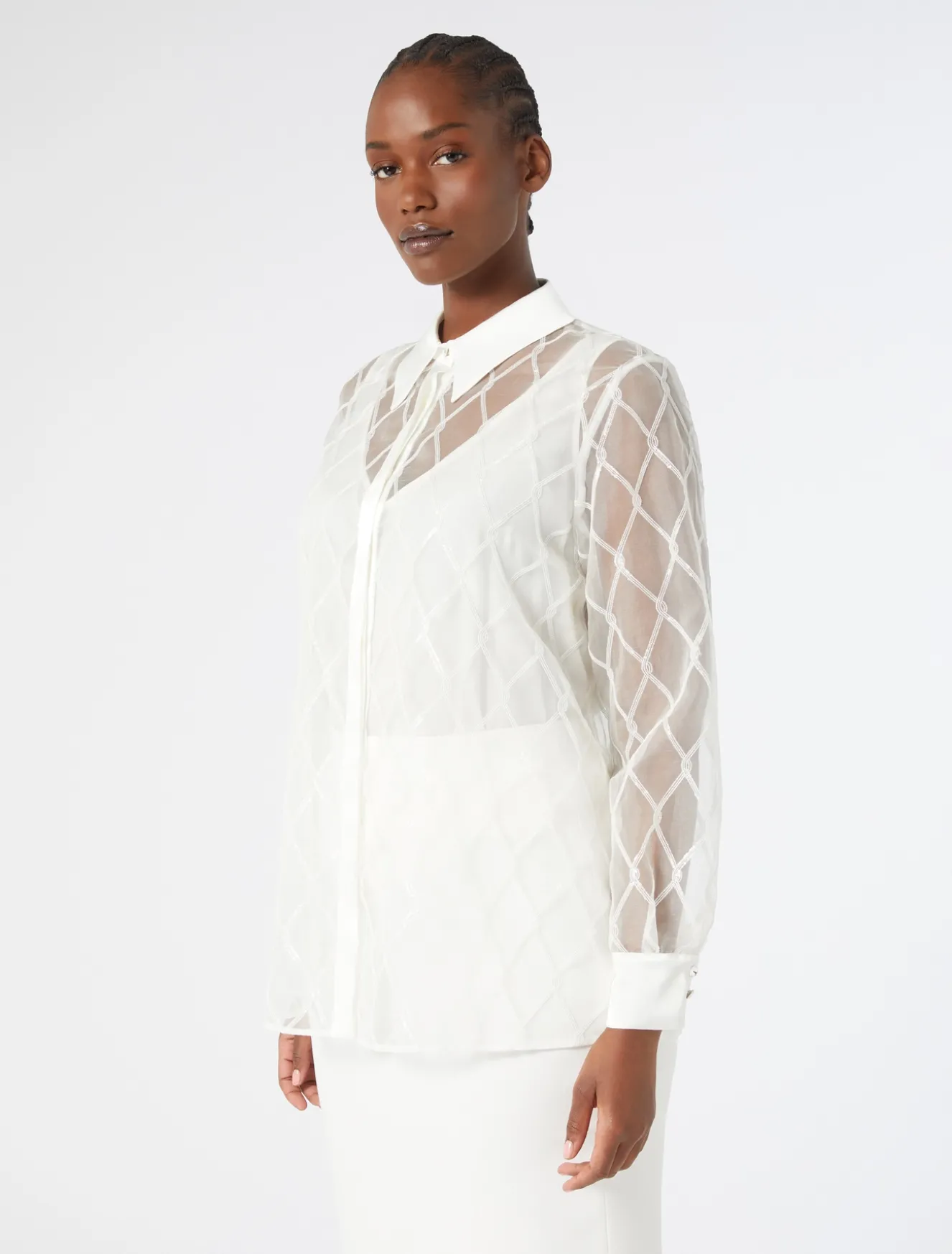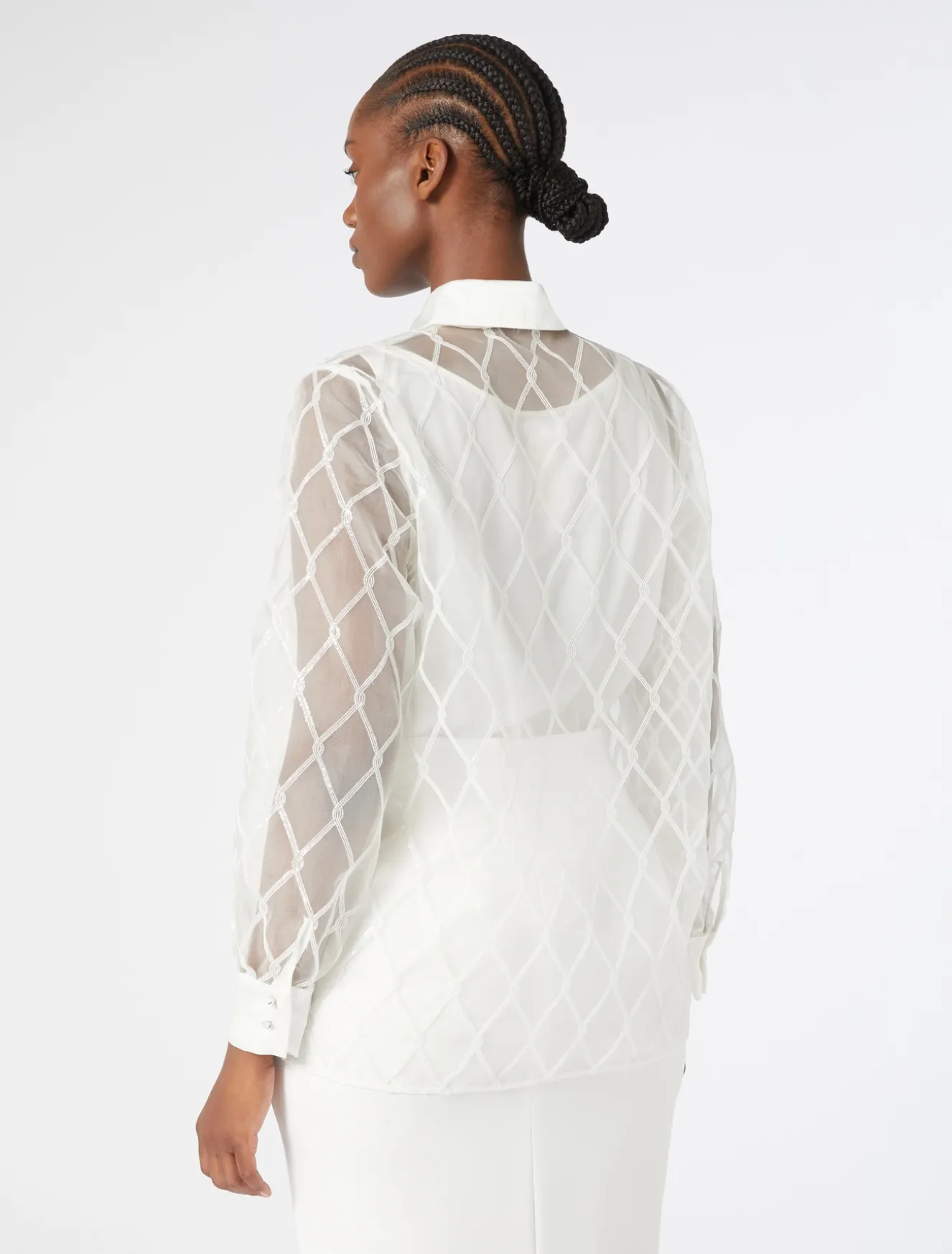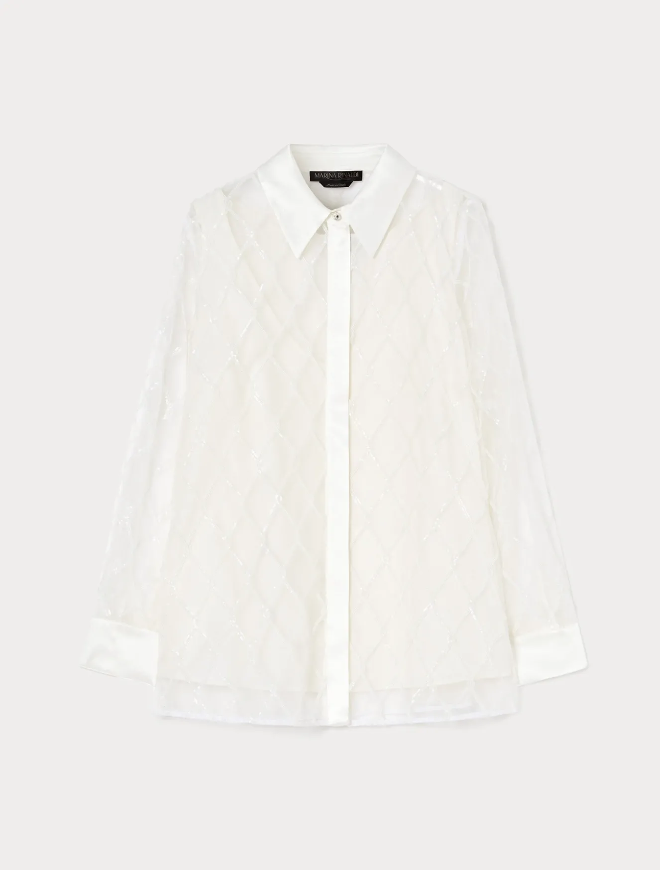 Ein Paillettengeflecht mit Satineinsätzen macht diese bestickte Hemdbluse aus reinem Seidenorganza einzigartig. Die perfekte Wahl, um Ihre Hochzeits-Outfits zu vervollständigen.