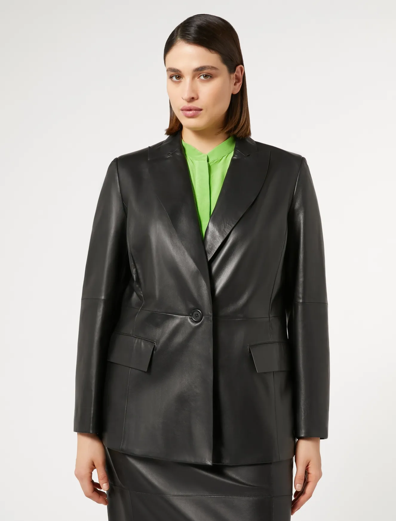 Blazerjacke aus Nappaleder mit Teilungsnähten vorne und hinten für eine gelungene Couture-Optik. Der Kragen, das Revers und die Patten sind allesamt mit handgefärbten Rippen versehen. Ein luxuriöses Piece, das jeden Style modern macht.Dieses Modell gehört zur Hauptkollektion von Marina Rinaldi.