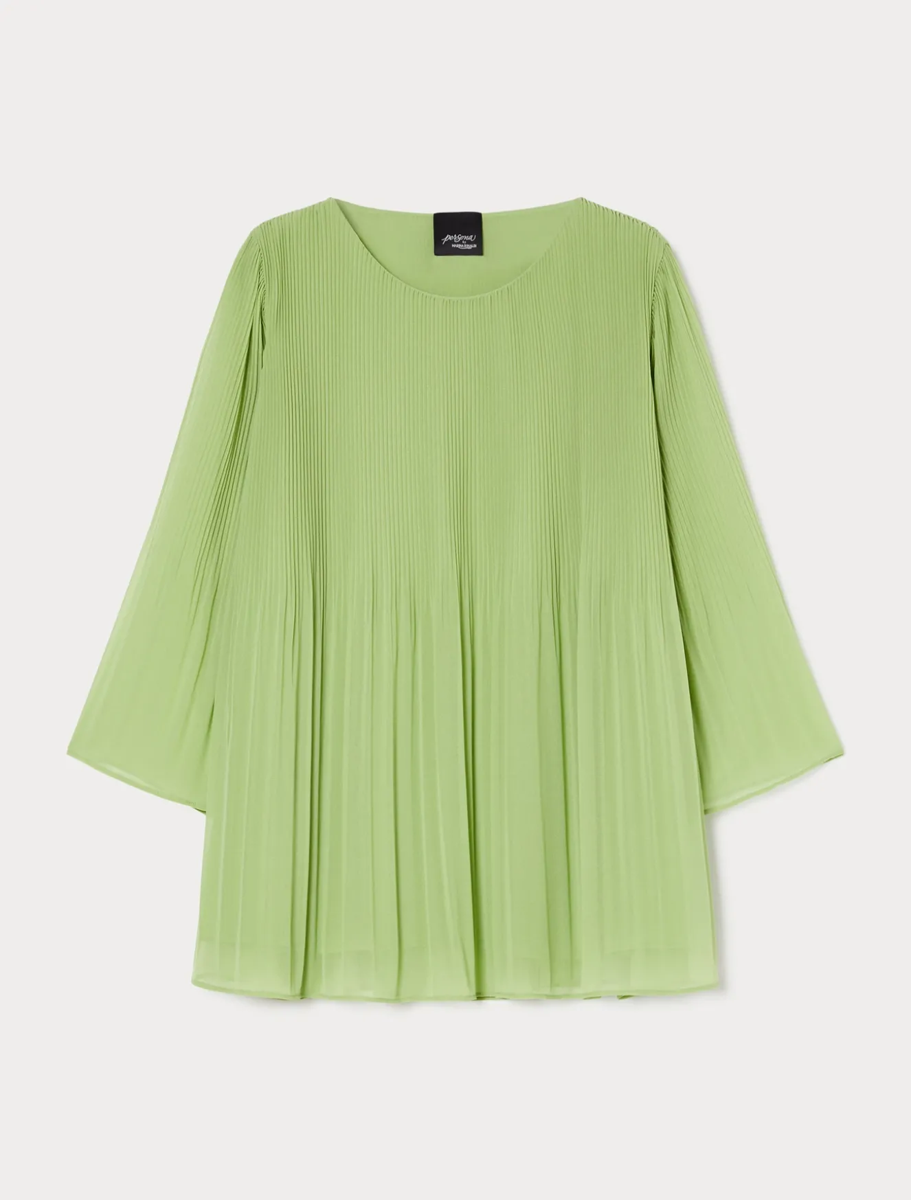 Die plissierte Bluse aus Georgette mit Degradé-Optik und ausgestellter Silhouette zieht alle Blicke auf sich. Ideal, wenn Sie Ihrem Outfit eine grafische und feminine Note verleihen möchten.