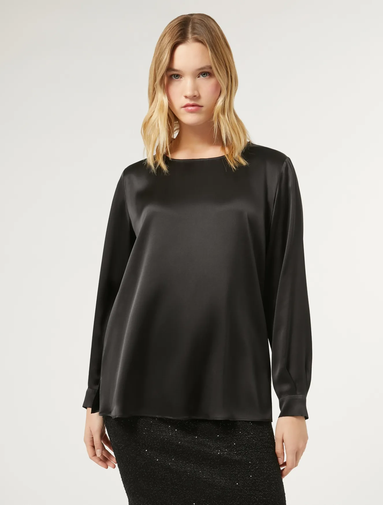 Schlichte Eleganz zeichnet diese gerade geschnittene Bluse aus gewaschenem Seidensatin aus. Das Modell eignet sich perfekt, um sowohl Tages- als auch Abendlooks einen raffinierten und modernen Touch zu verleihen.Das Kleidungsstück ist Teil der Kollektion „Voyage“.