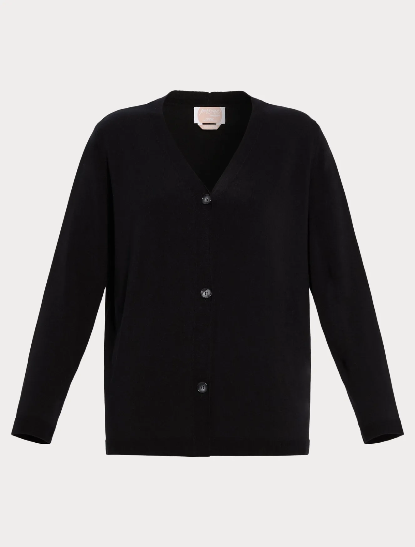 Dieser langärmlige Cardigan aus Viskosestretch mit V-Ausschnitt ist bequem und modisch. Die Glattrechts-Verarbeitung definiert die Struktur des Kleidungsstücks.Das Kleidungsstück ist Teil der N.O.W.