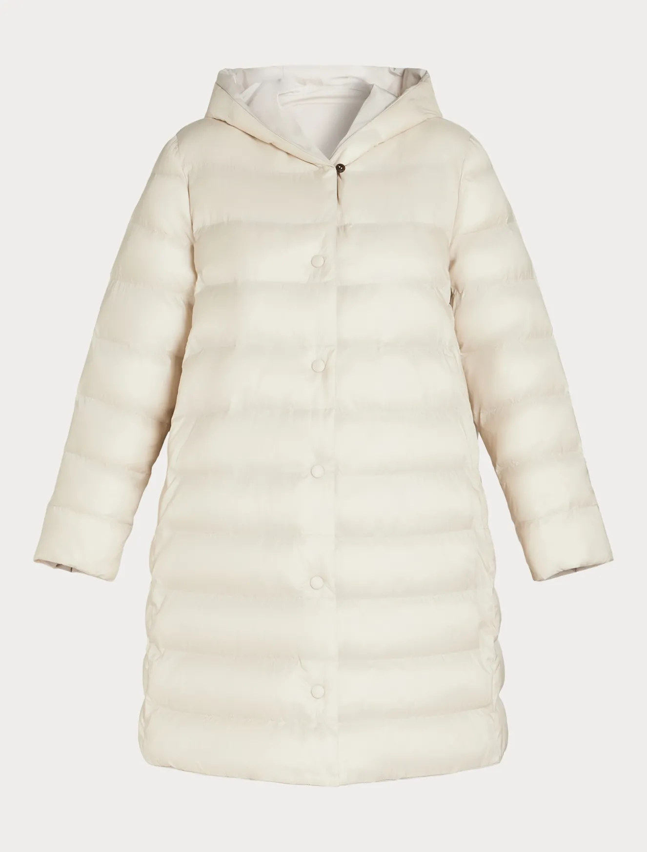 Diese wattierte Jacke aus Taft und wasserabweisendem Nylon-Canvas mit Druckknopfverschluss lässt sich vielseitig kombinieren.Das Kleidungsstück ist Teil der Kollektion Persona by Marina Rinaldi.– Taft, wasserabweisender Nylon-Canvas– Gerader Schnitt– Kragen mit Kapuze– Lange Ärmel– Druckknopfverschluss im selben Farbton– In die Teilungsnähte eingelassene Eingrifftaschen mit Reißverschluss