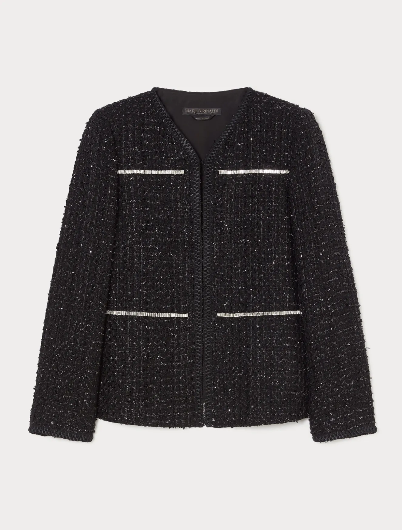 Die garngefärbte Jacke mit Lurex-Band fällt auf und wird vorne und an den Bündchen mit einem Besatz in Origami-Optik im selben Farbton abgerundet. Darüber hinaus ist sie vorne mit handgefertigten Baguette-Besätzen und Strasssteinen aus Zirkonia besetzt.