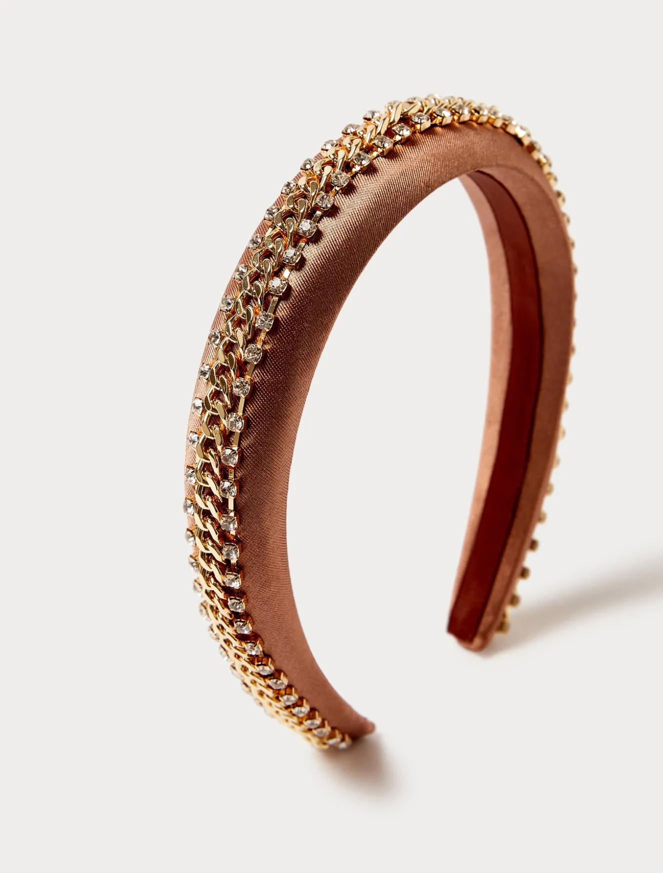 Dieser gepolsterte Satin-Haarreifen ist mit einer durchgehenden Metallkette und Strasssteinen verziert. Um besonderen Anlässen mit Stil zu begegnen.