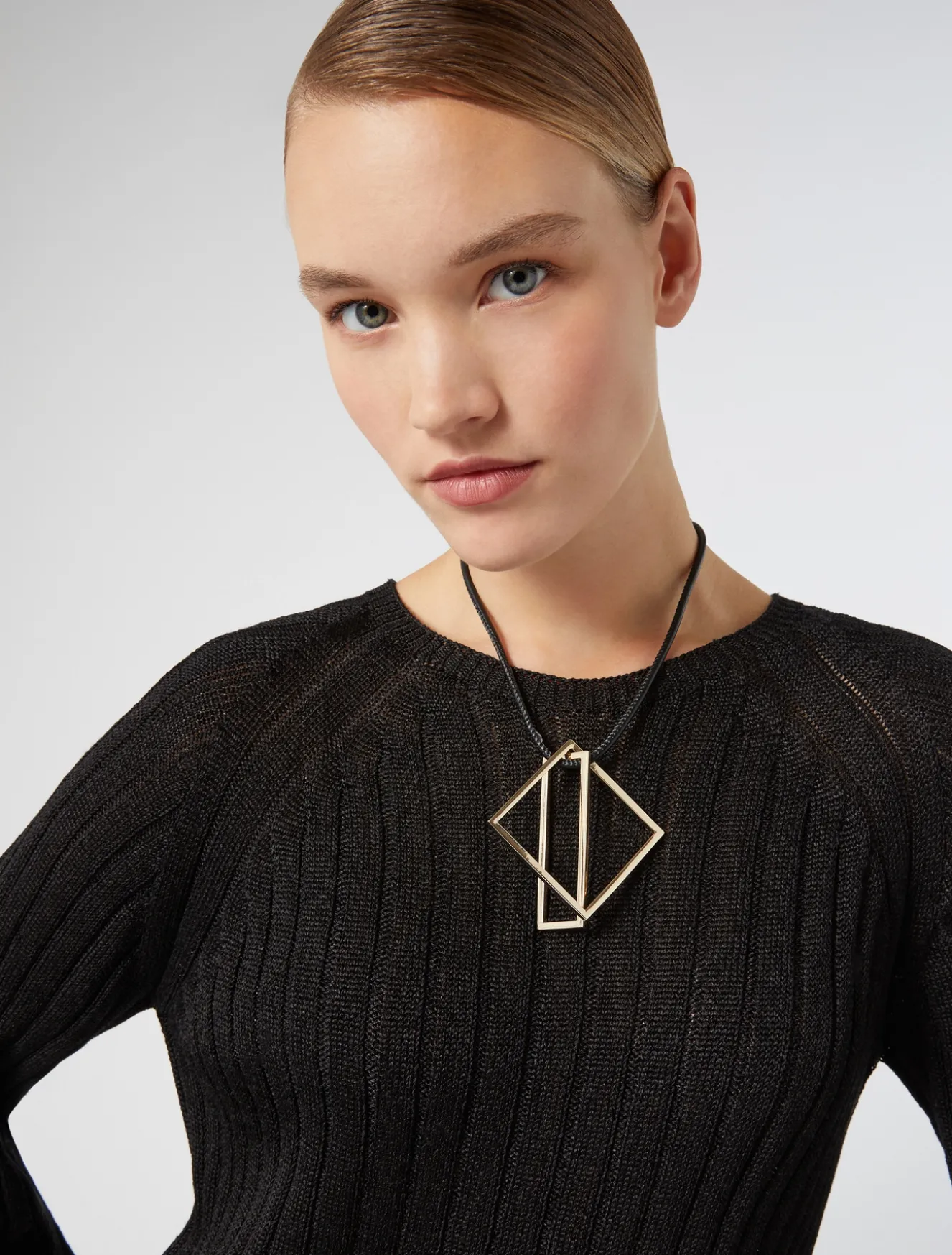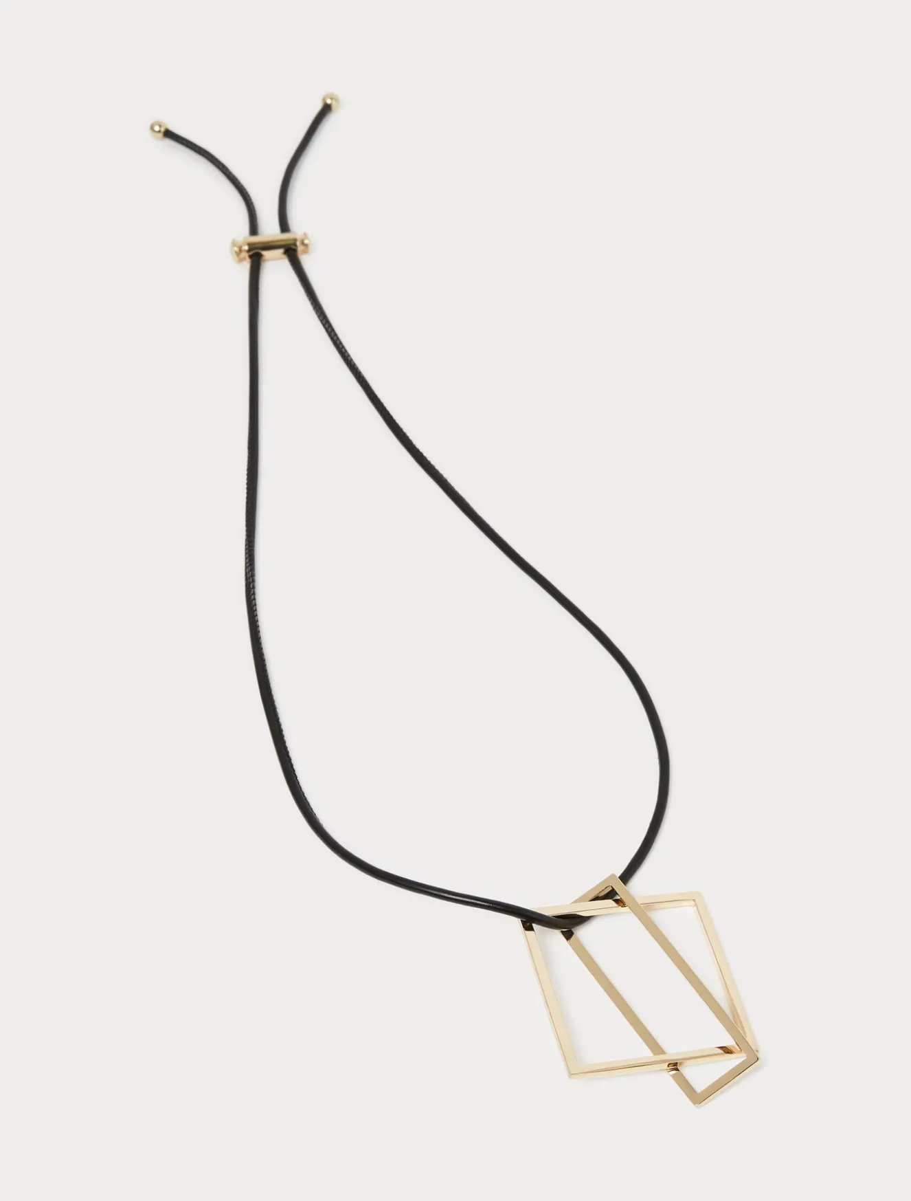 Diese lange Halskette aus beschichtetem Seil in Stoffoptik mit geometrischen Anhängern lässt sich nach Belieben verstellen. Für sich selbst oder zum Verschenken.