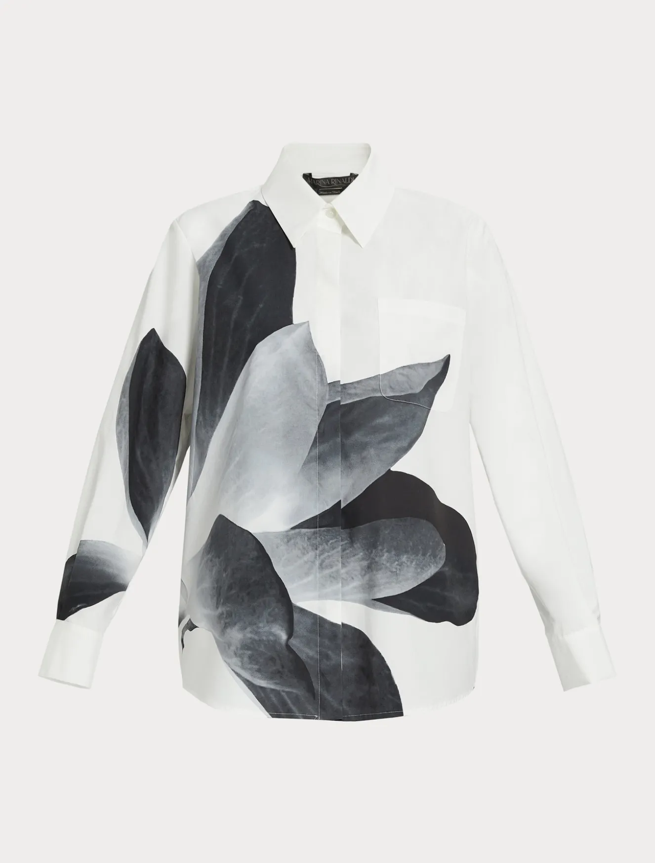 Hemd aus reiner Baumwollpopeline mit aufgesetzter Tasche und asymmetrischem Fotoblumen-Print. Ein szenografisches Modell, das deinem Stil eine noch nie dagewesene Anziehungskraft verleiht. Dieses Modell gehört zur Hauptkollektion von Marina Rinaldi.