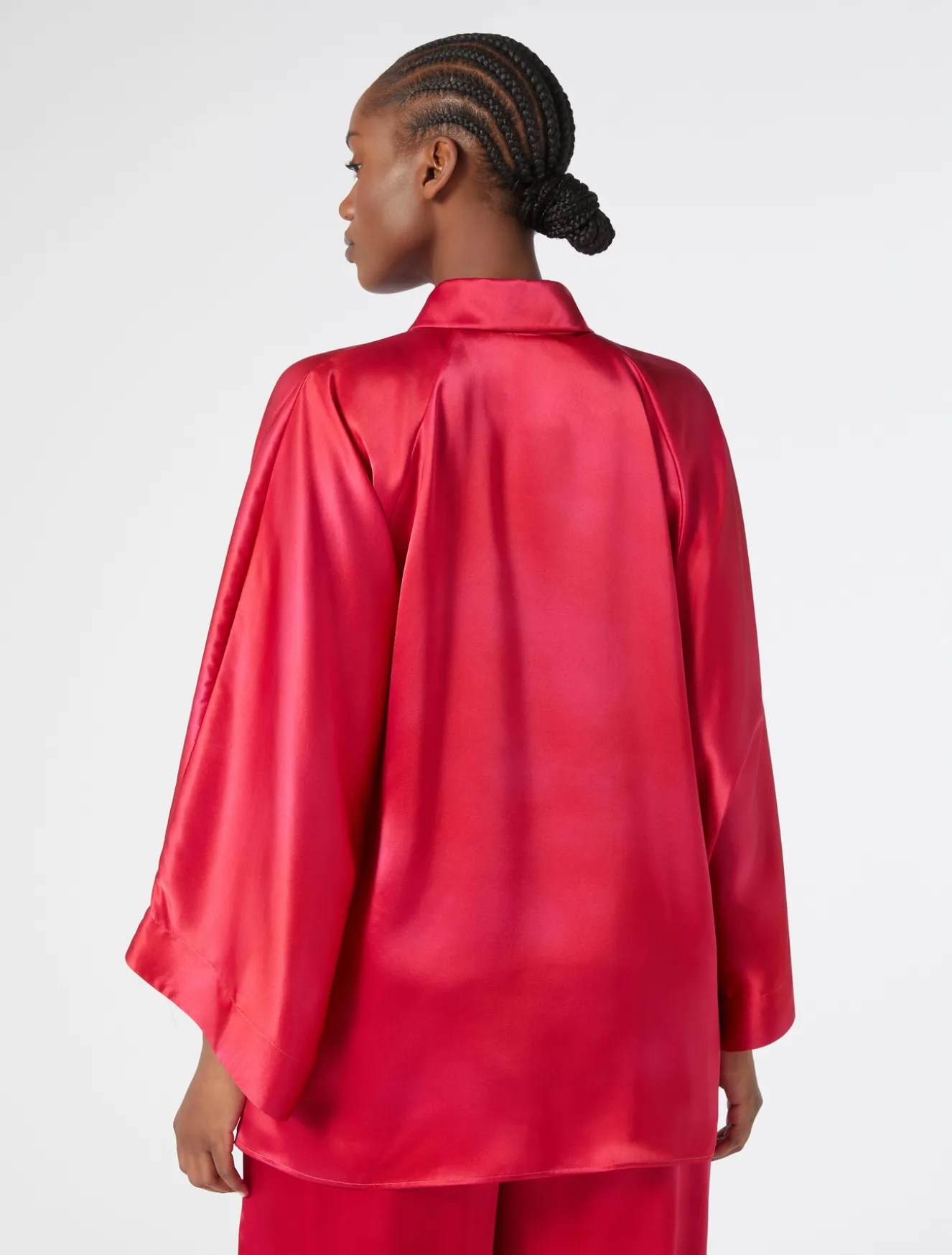 Ein raffinierter Orchideen-Print ziert diese Hemdbluse aus reinem Seidensatin. Ein grafischer Touch für einen edlen Stil. Das Design ist Teil der Kollektion Elegante.