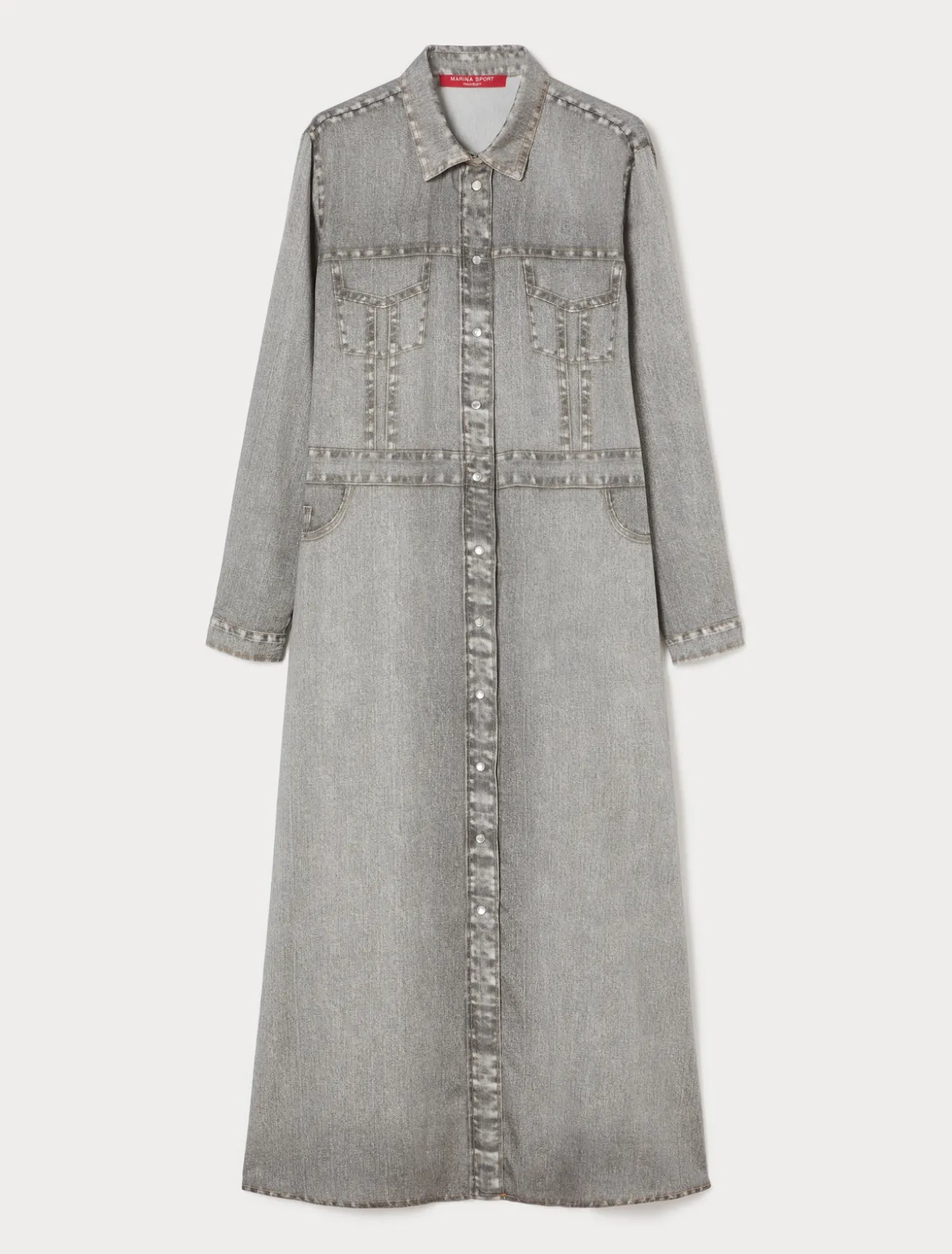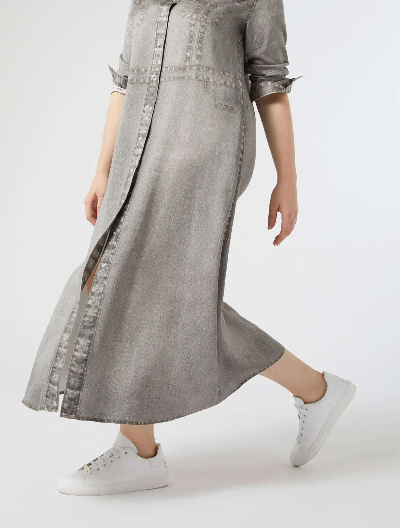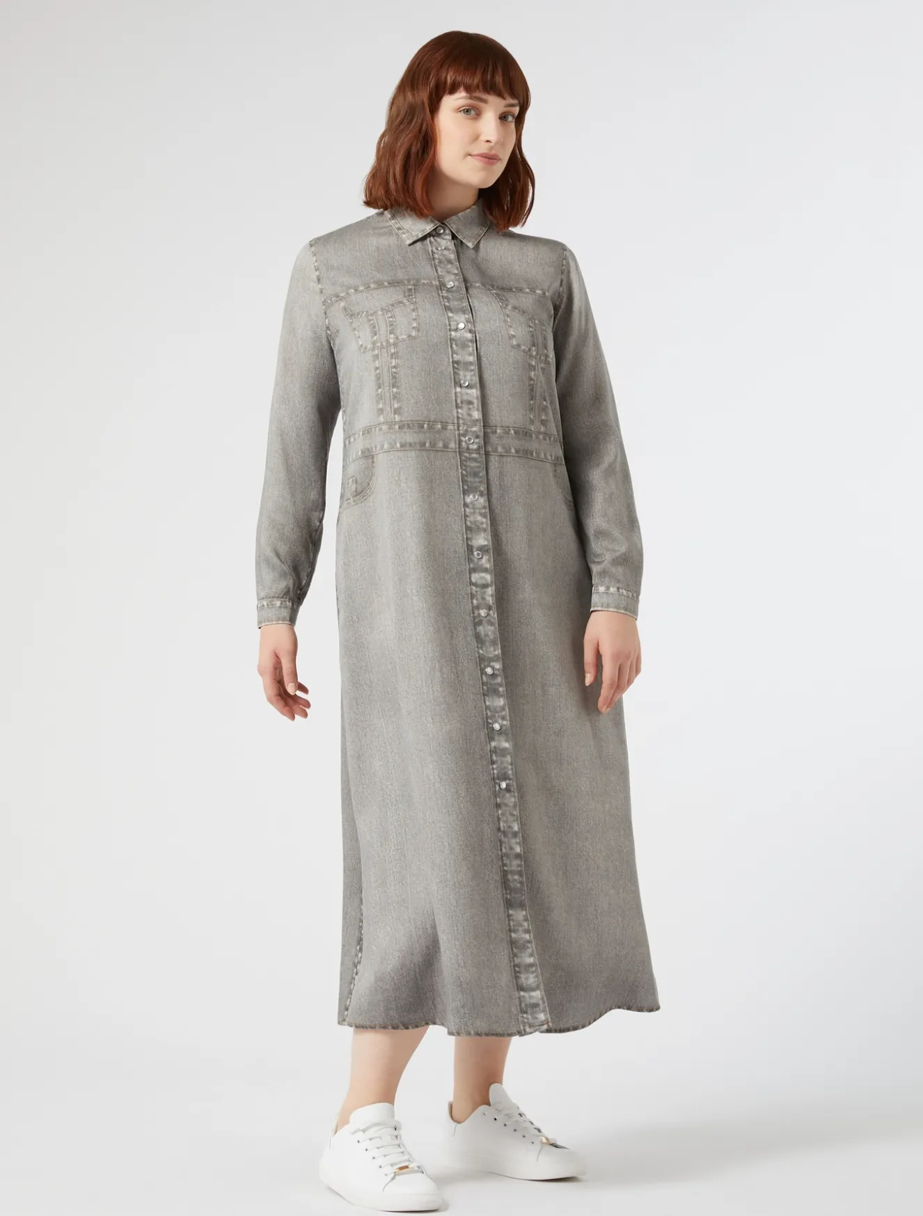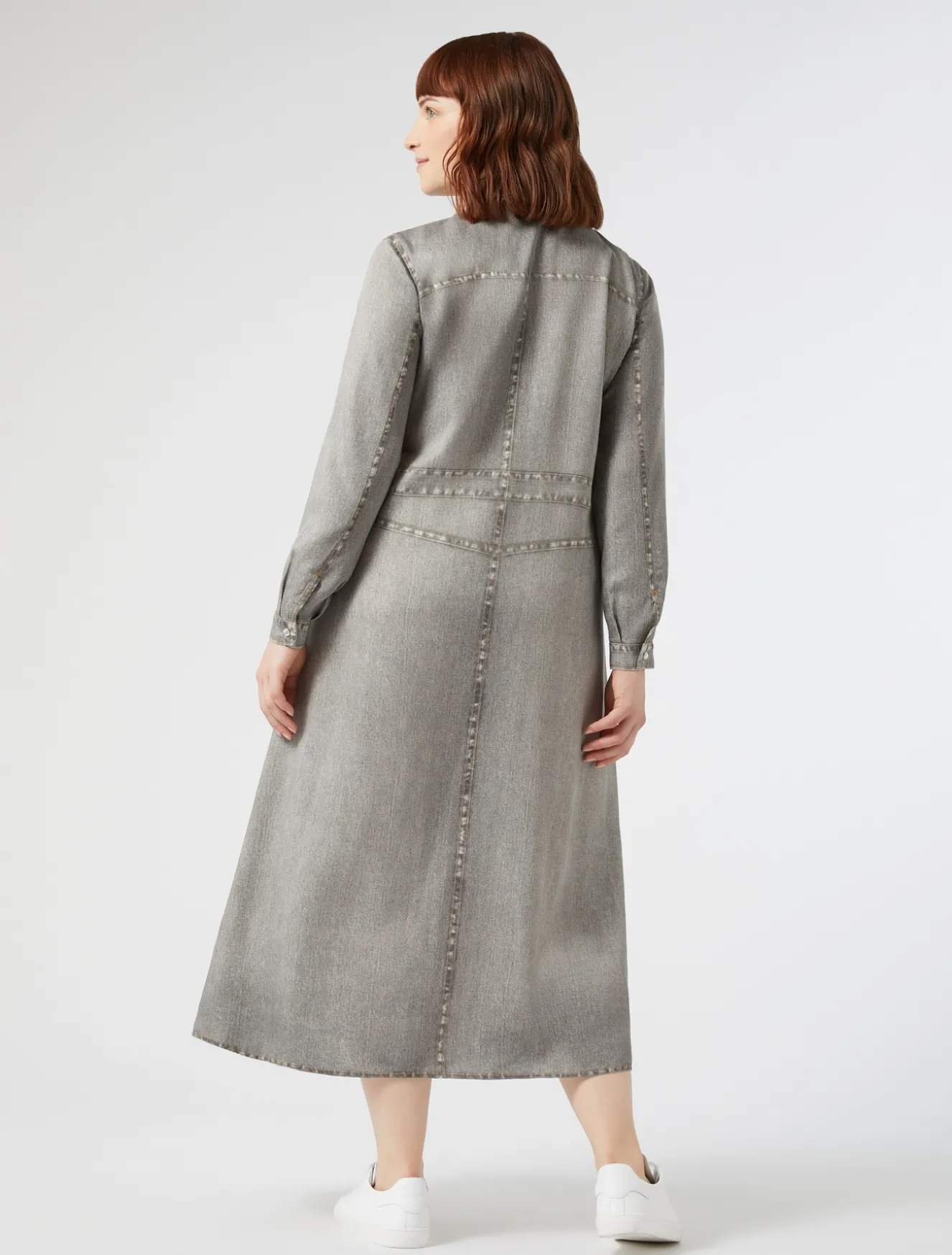 Dieses Hemdblusenkleid aus glattem Lyocell-Satin mit Print in Denim-Optik erinnert an die für Jeans typischen Taschen und Schulterpasse vorne und hinten. Raffiniertes Material und einzigartiges Design für auffällige Looks.