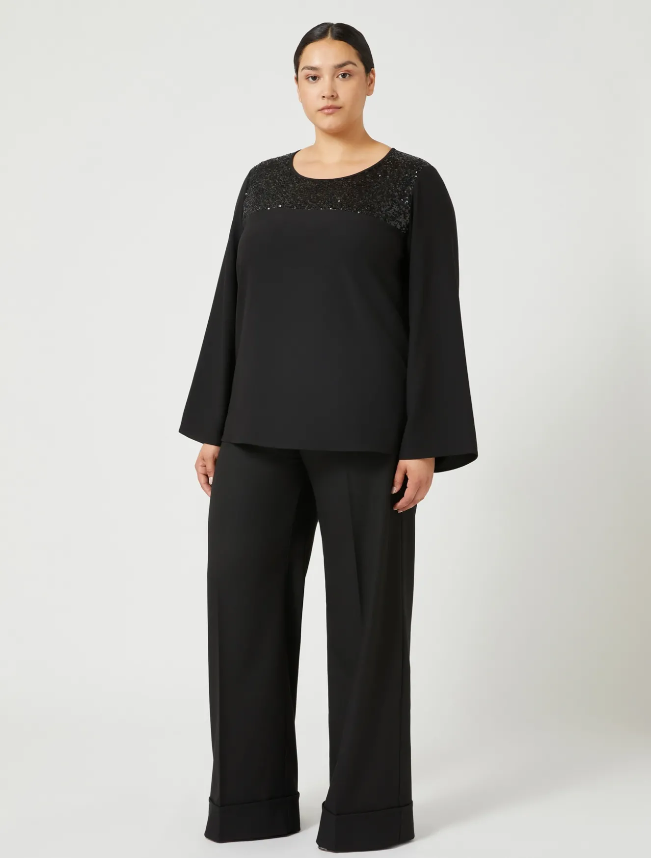 Bequeme Hose aus garngefärbtem Viskosestoff mit breitem Bein und Elastikeinsatz hinten für einen bequemen Sitz.Das Kleidungsstück ist Teil der Kollektion Persona by Marina Rinaldi.– Garngefärbtes Viskosegewebe– Weiter Schnitt– Reißverschluss und Knopf– Elastikband hinten am Bund– Bügelfalte in der Mitte– Umschlagsaum
