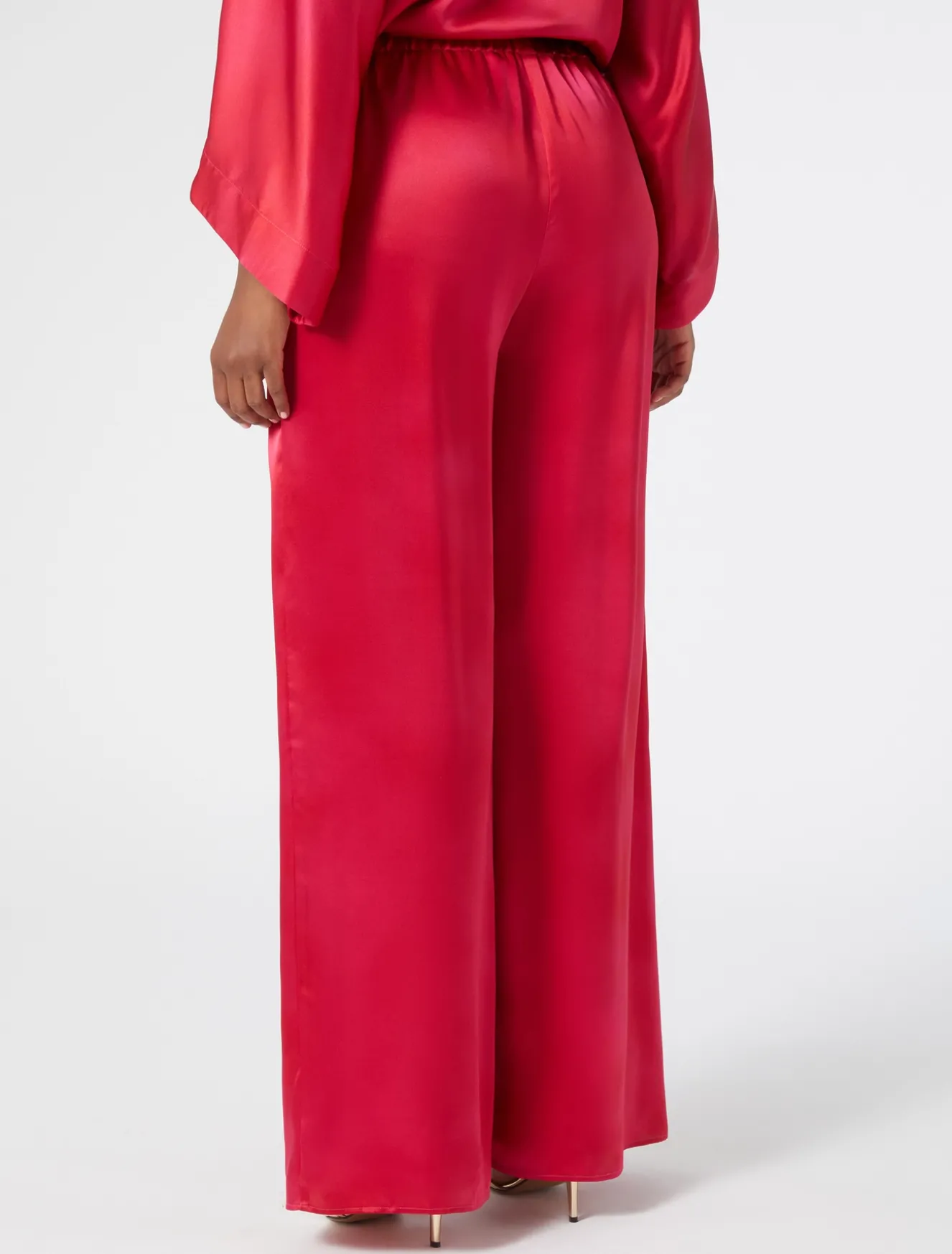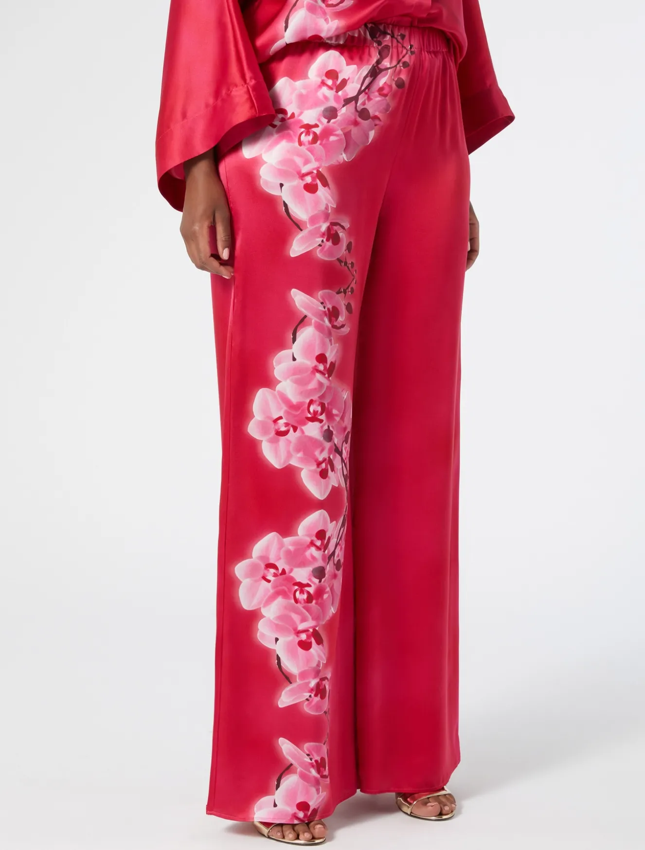Weite Hose aus reinem Seidensatin mit platziertem Kirschzweig-Print. Sie verleiht Ihrem Look bei besonderen Anlässen einen grafischen und raffinierten Touch, und das auch in Kombination mit dem dazu passenden Hemd.