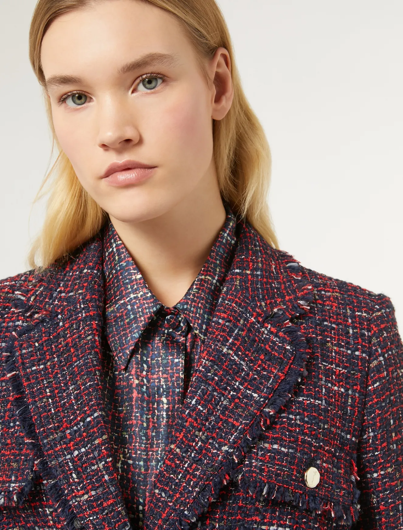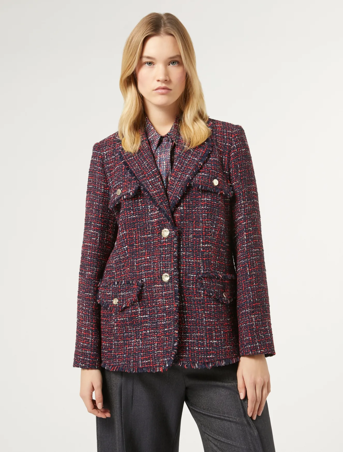 Diese Jacke aus garngefärbtem Stoff mit Bouclé-Effekt ist mit ausgefransten Kanten versehen. Die Vorder- und Rückenschlitze sorgen für einen unerwartet formellen Look. Wird am besten im Set mit der dazu passenden Hose getragen. Dieses Modell gehört zur Hauptkollektion von Marina Rinaldi.