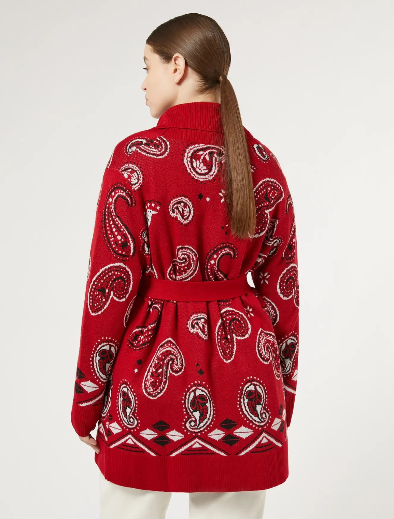 Grafischer Cardigan aus einem Wollmischstrick mit Piqué-Jacquard und gerippter Bordüre. Ein dazu passender Gürtel erlaubt, die Taille zu betonen und den Cardigan vorne zu schließen.Das Kleidungsstück ist Teil der Kollektion Marina Sport.