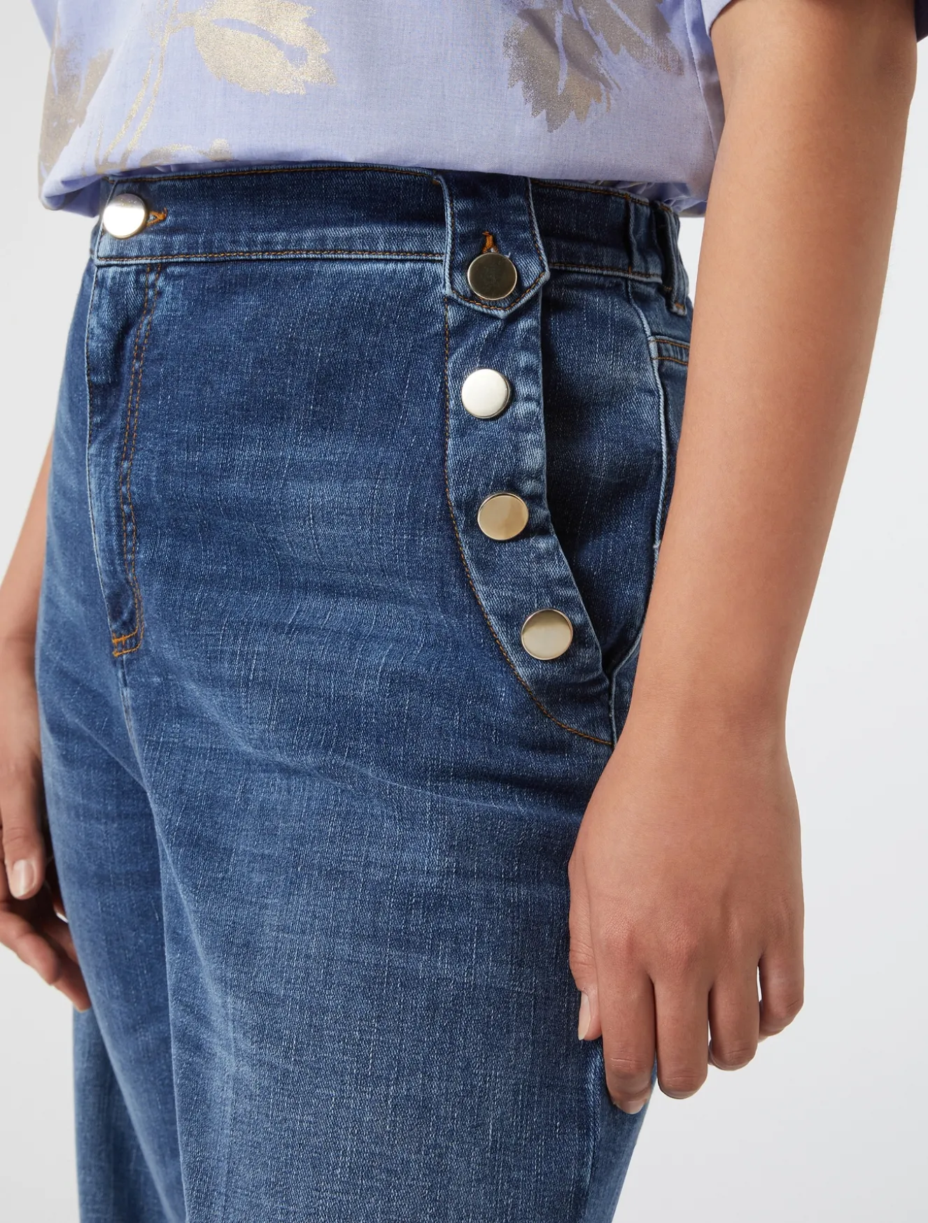 Hose aus stückbehandeltem, monoelastischem Baumwoll-Denim im Matrosen-Stil. Ein Modell, das den stilistischen Mittelpunkt bilden wird.