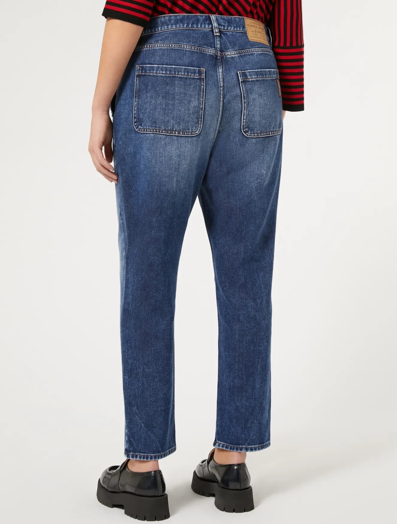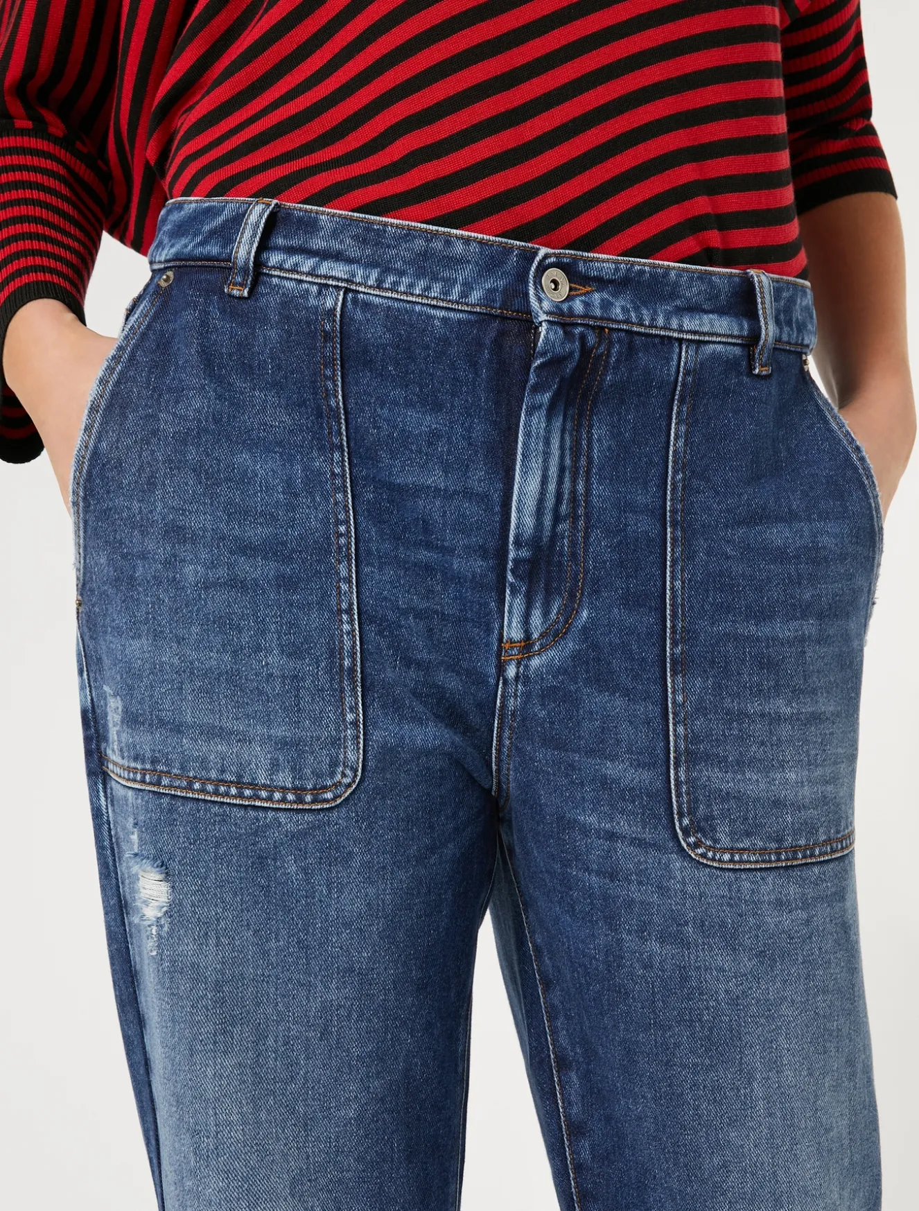 Boyfriend-Jeans aus angenehme weichem, fließendem Baumwoll-Lyocell-Denim mit einer lässigen und modernen Passform. Leicht niedriger Bund und tiefer Schritt. Dazu wird sie von handgefertigten Rissen und Whiskern geziert.Das Kleidungsstück ist Teil der Kollektion Marina Sport.