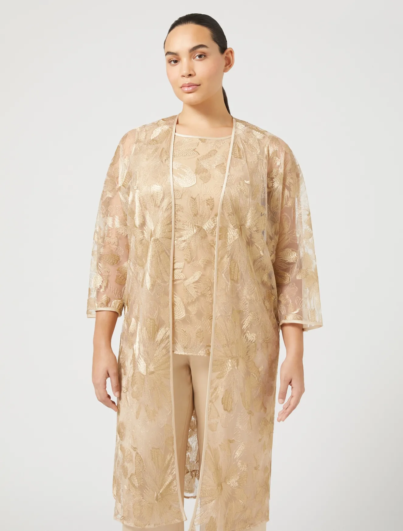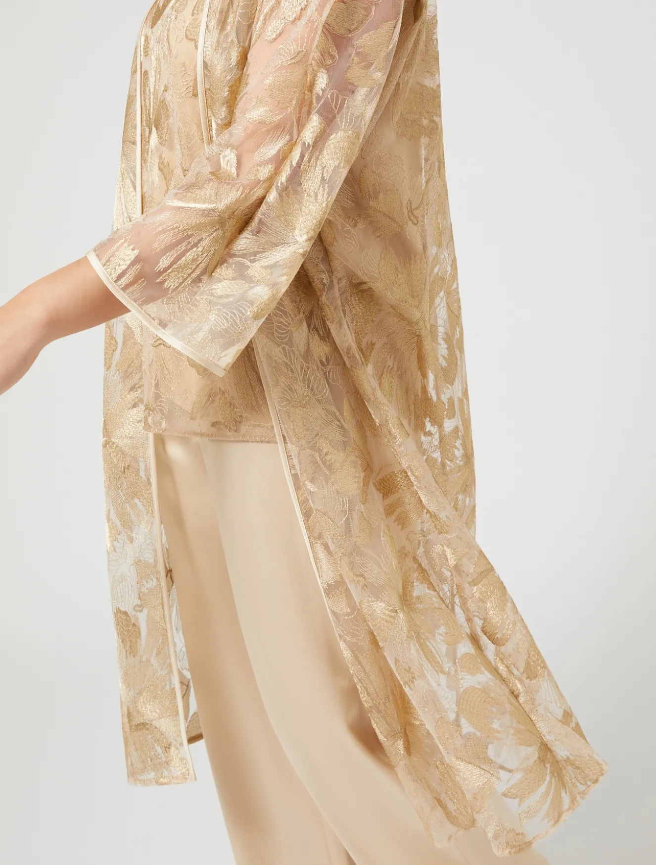 Kasack aus Tüll mit Kimonoärmeln, Paspelierung mit farblich abgestimmtem Ripsbandbesatz und charakteristischem Blumenmuster. Ein wertvolles und aktuelles Modell, das jedes Outfit für jeden Anlass aufwertet. Das Kleidungsstück ist Teil der Kollektion Elegante.
