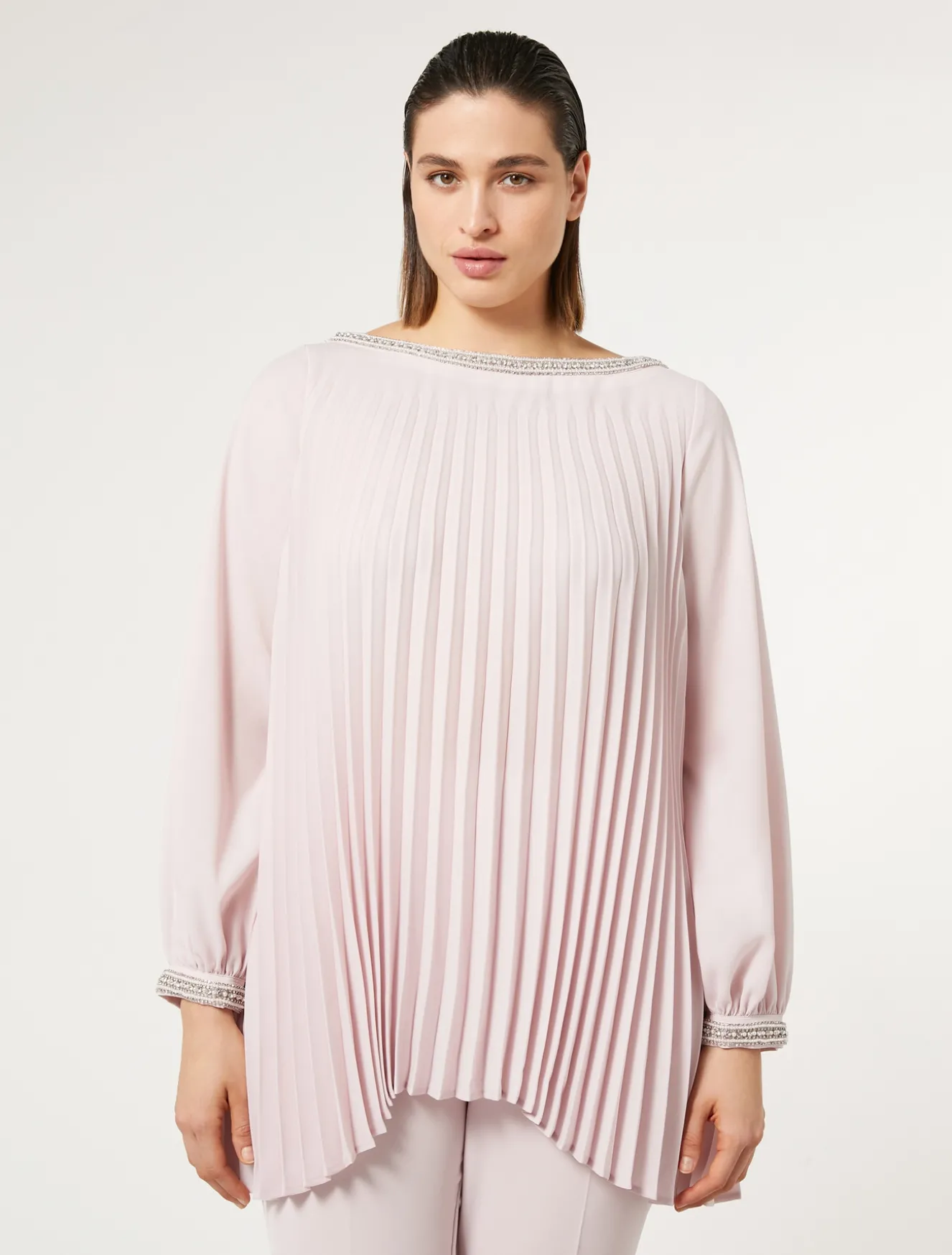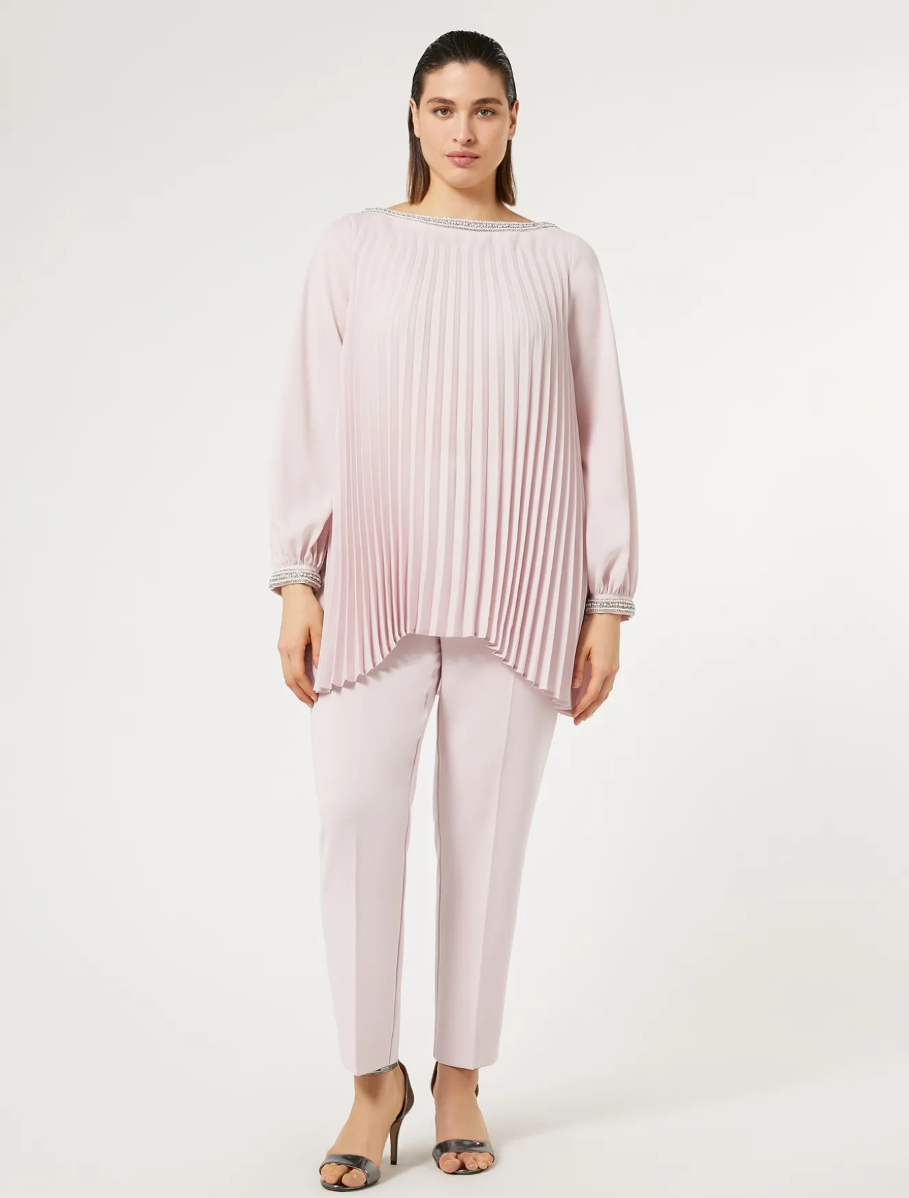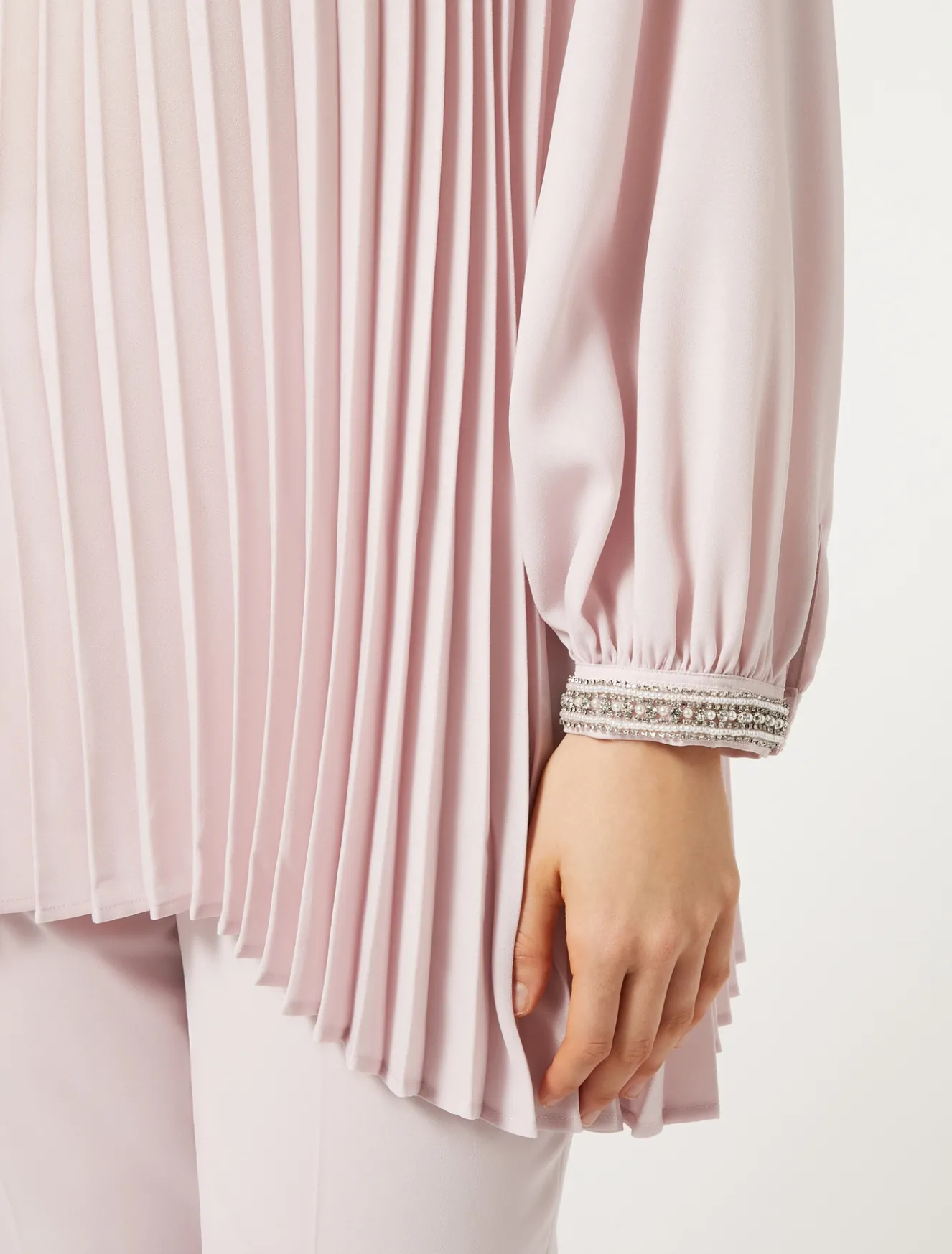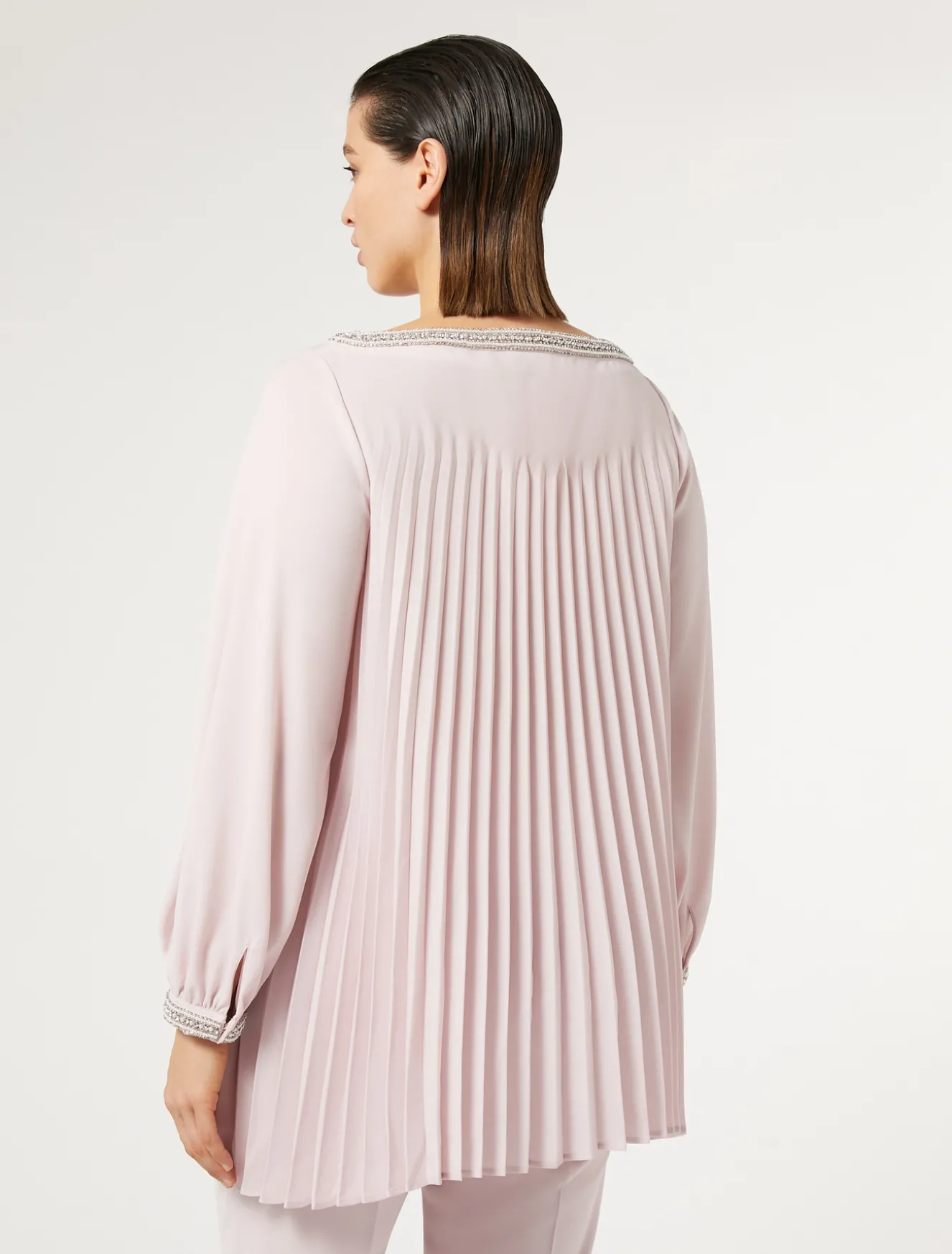 Der Kasack aus leichtem Crêpe mit Plissee-Solei ist an Kragen und Bündchen mit handgestickten Perlen und Strasssteinen verziert. Ein edles Modell für wichtige Veranstaltungen.Das Kleidungsstück ist Teil der Kollektion Elegante.