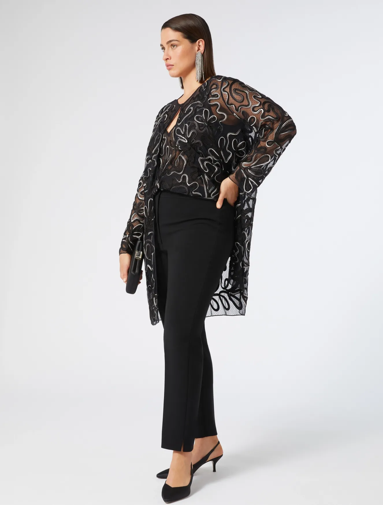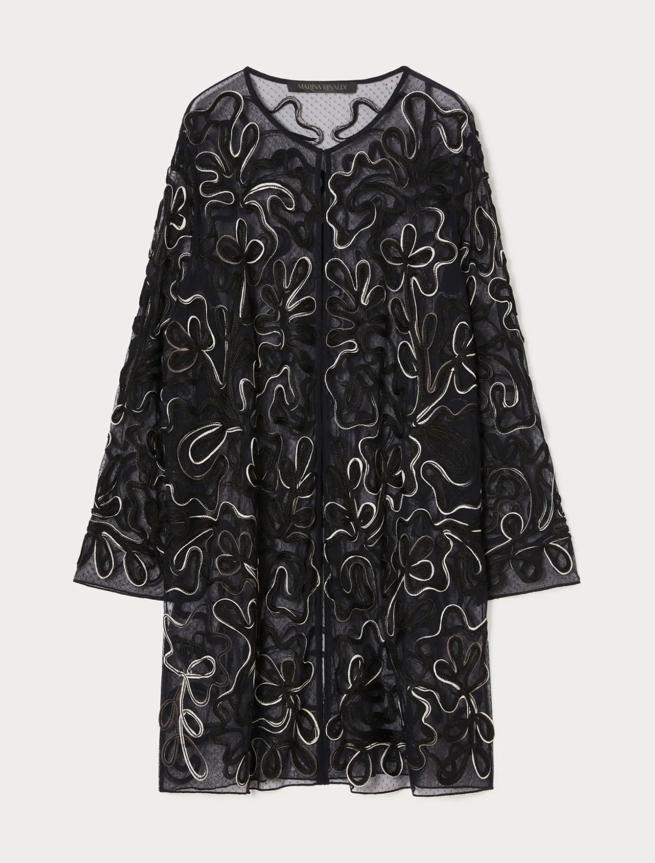Dieser offene Kasack aus Plumetis-Tüll wird von einer speziell für dieses Modell hergestellten und ideal platzierten Cornely-Stickerei und einem Bändchen mit Farbverlauf geziert. Ein kostbares Modell für eine Extraportion Stil.