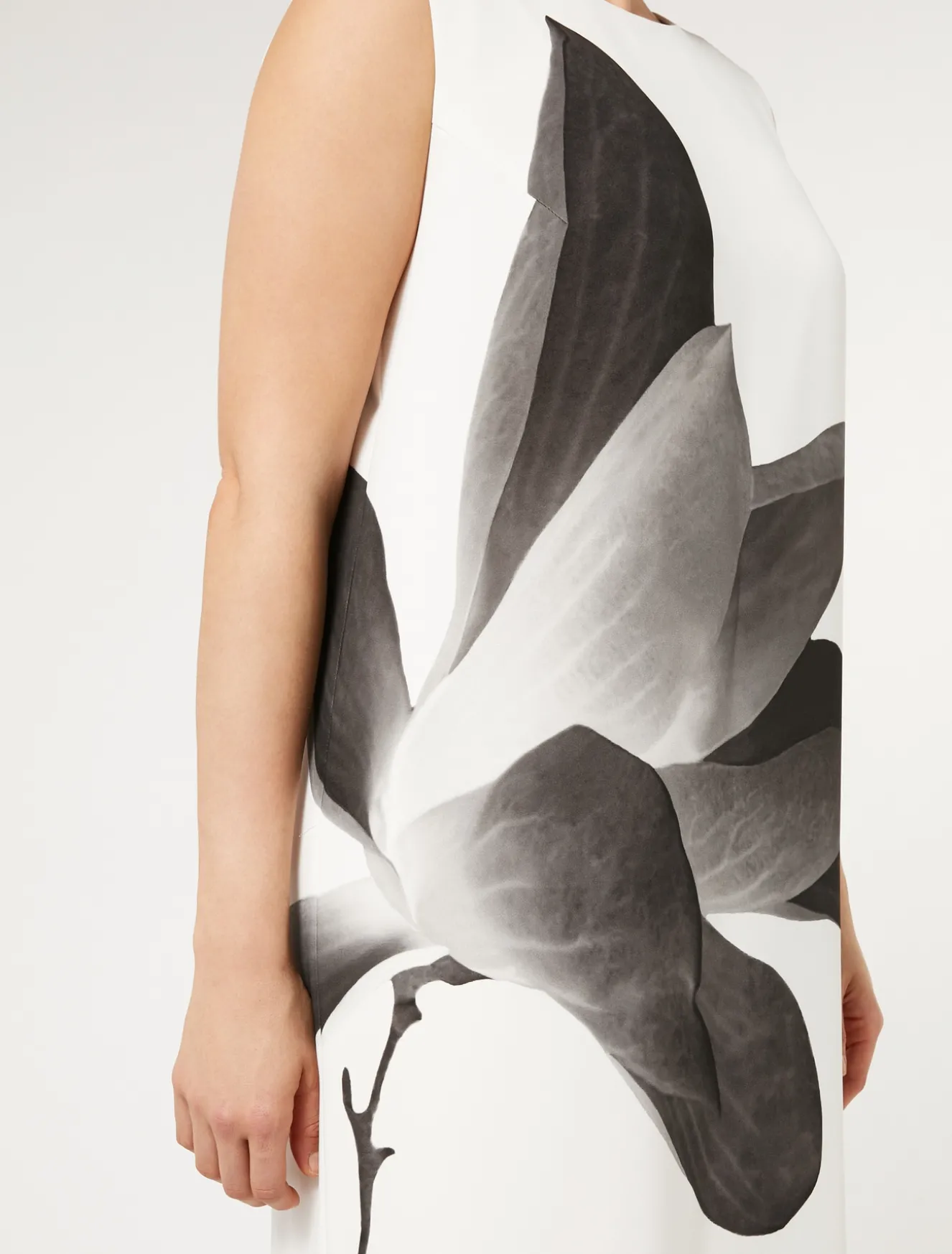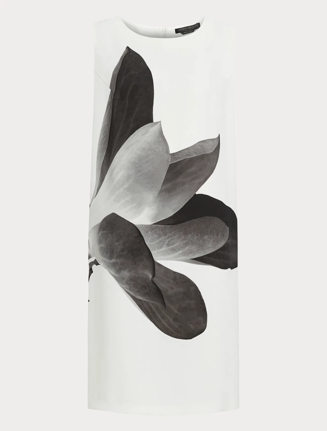 Gerade geschnittenes Kleid aus Cady mit Ton-in-Ton-Maxi-Blumenprint und farblich dazu passender Seite. Ein raffiniertes Modell, auf das die Ärmel unschwer von einem Schneider angebracht werden können.Dieses Modell gehört zur Hauptkollektion von Marina Rinaldi.