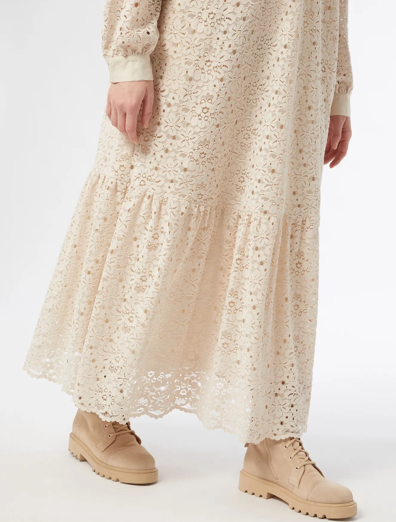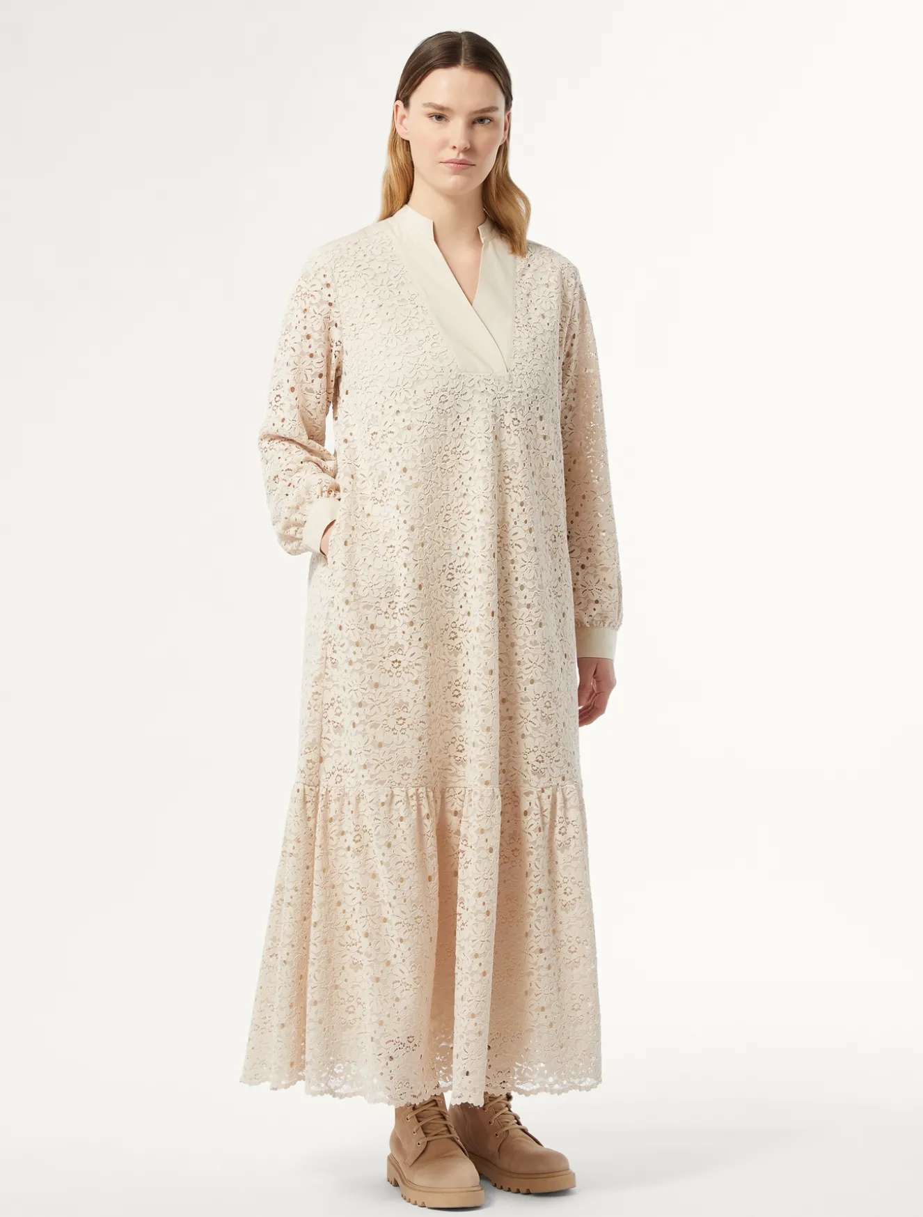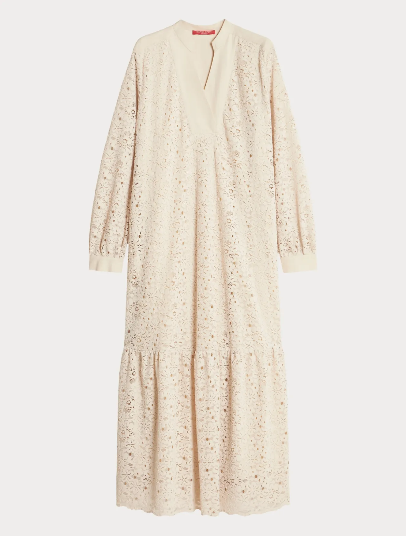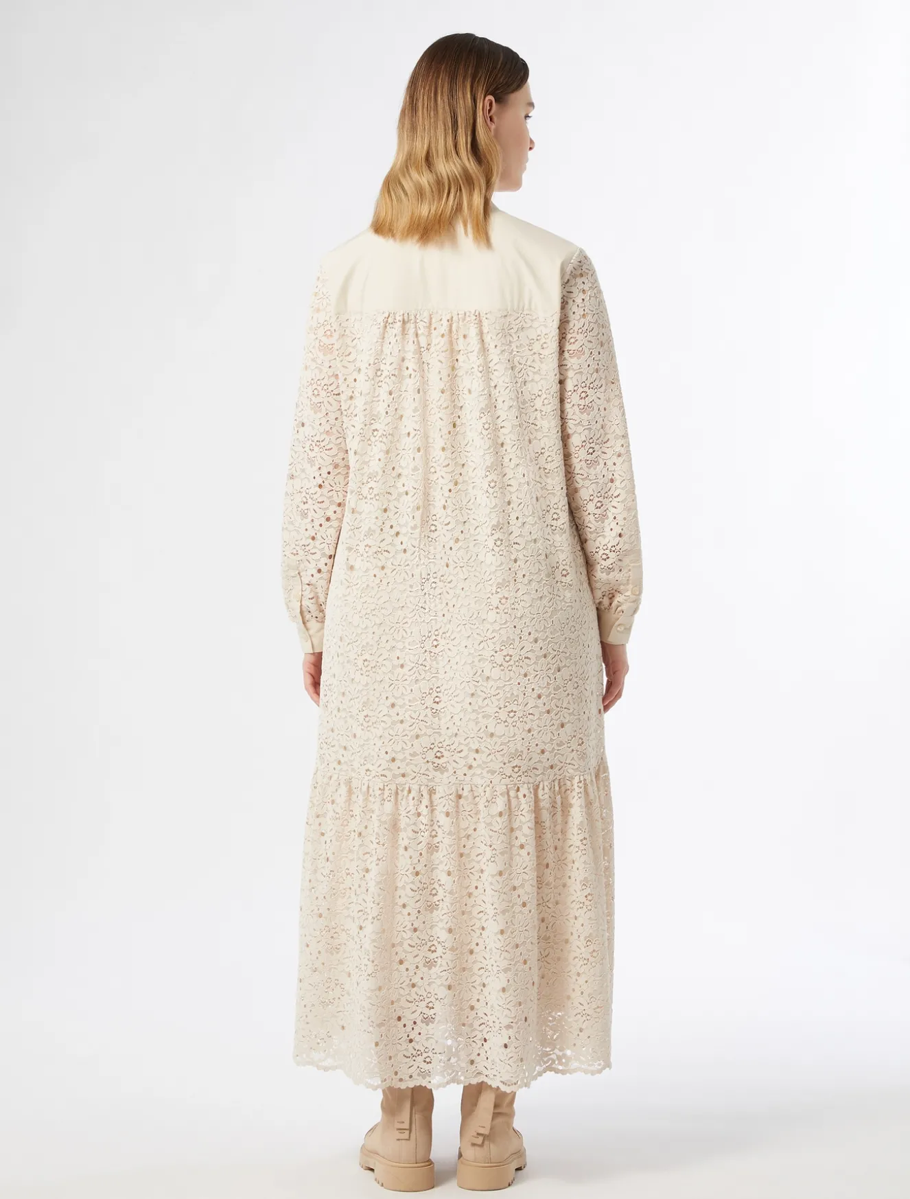 Das Maxikleid aus Chenille-Spitze ist mit farblich abgestimmten Einsätzen aus Baumwollpopeline verziert. Raffiniert und aktuell, um Alltagsoutfits aufzuwerten.Das Kleidungsstück ist Teil der Kollektion Marina Sport.