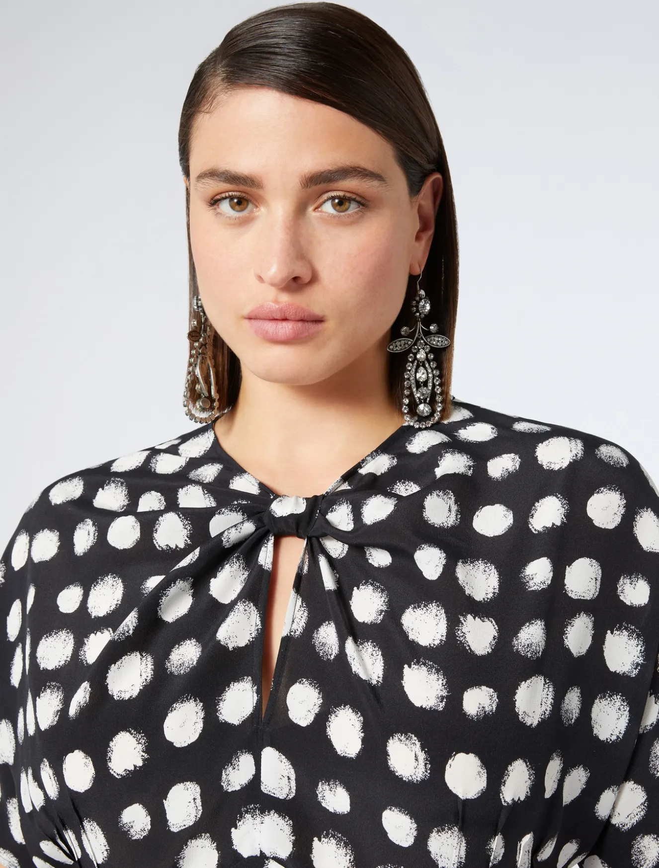 Kleid aus reinem Seiden-Crêpe de Chine mit drapiertem Knotenmuster am Ausschnitt, exklusivem Print und V-Schnitten an der Taille. Grafische Eleganz, um den Style sofort aufzuwerten.