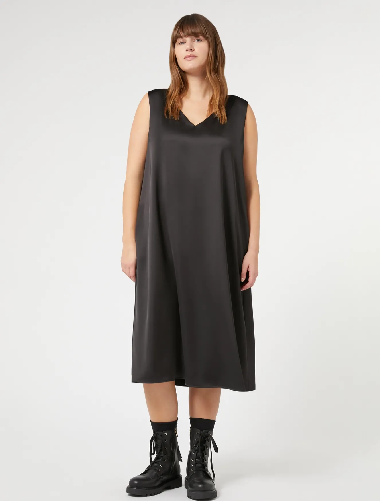 Fließendes Satinkleid mit ausgestellter Silhouette und zeitlosem Appeal. Ein lässig-elegantes Modell, auf das die Ärmel unschwer von einem Schneider angebracht werden können. Dieses Modell gehört zur Hauptkollektion von Marina Rinaldi.
