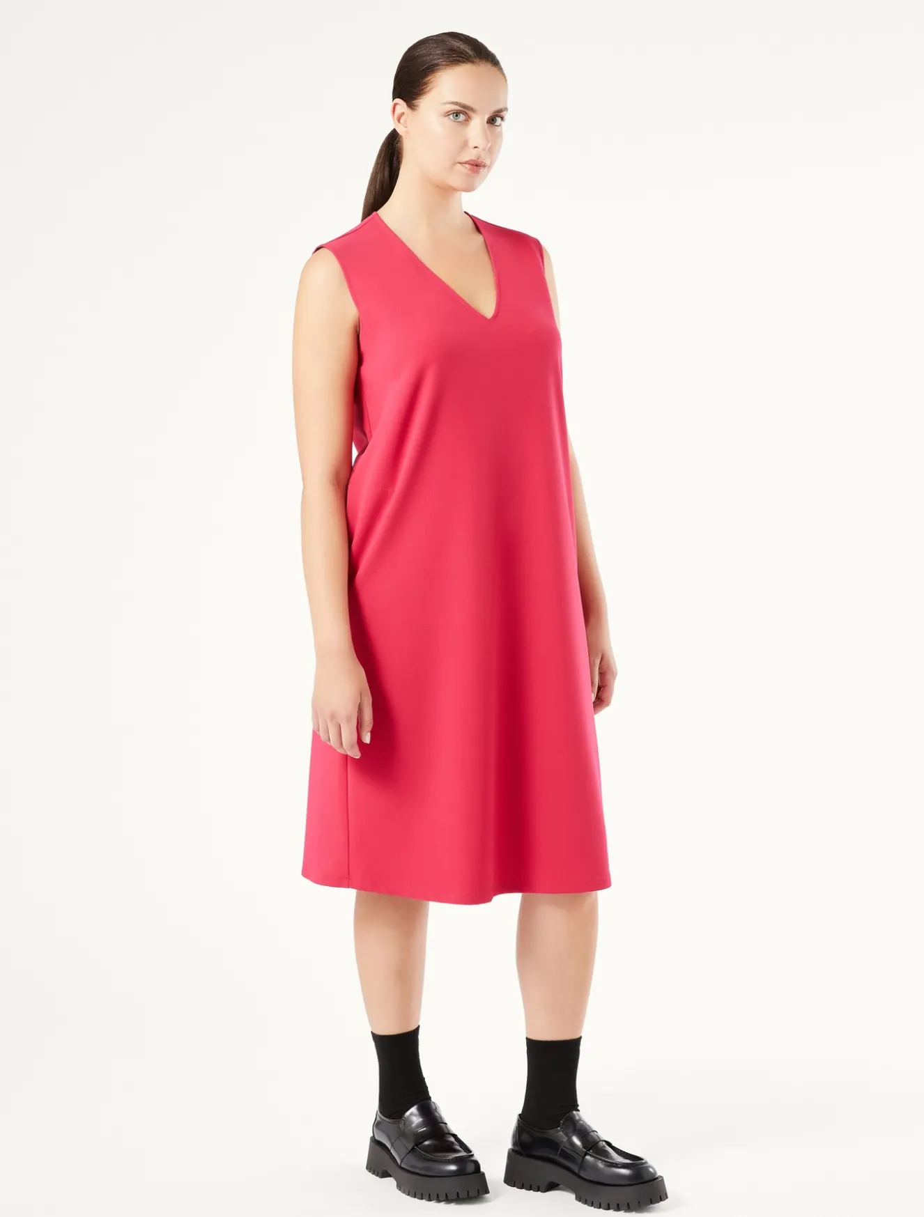 Ein vielseitiges Jerseykleid in ausgestellter Form. Die kurzen Ärmel lassen sich unschwer von einem Schneider anbringen.Das Kleidungsstück ist Teil der N.O.W.