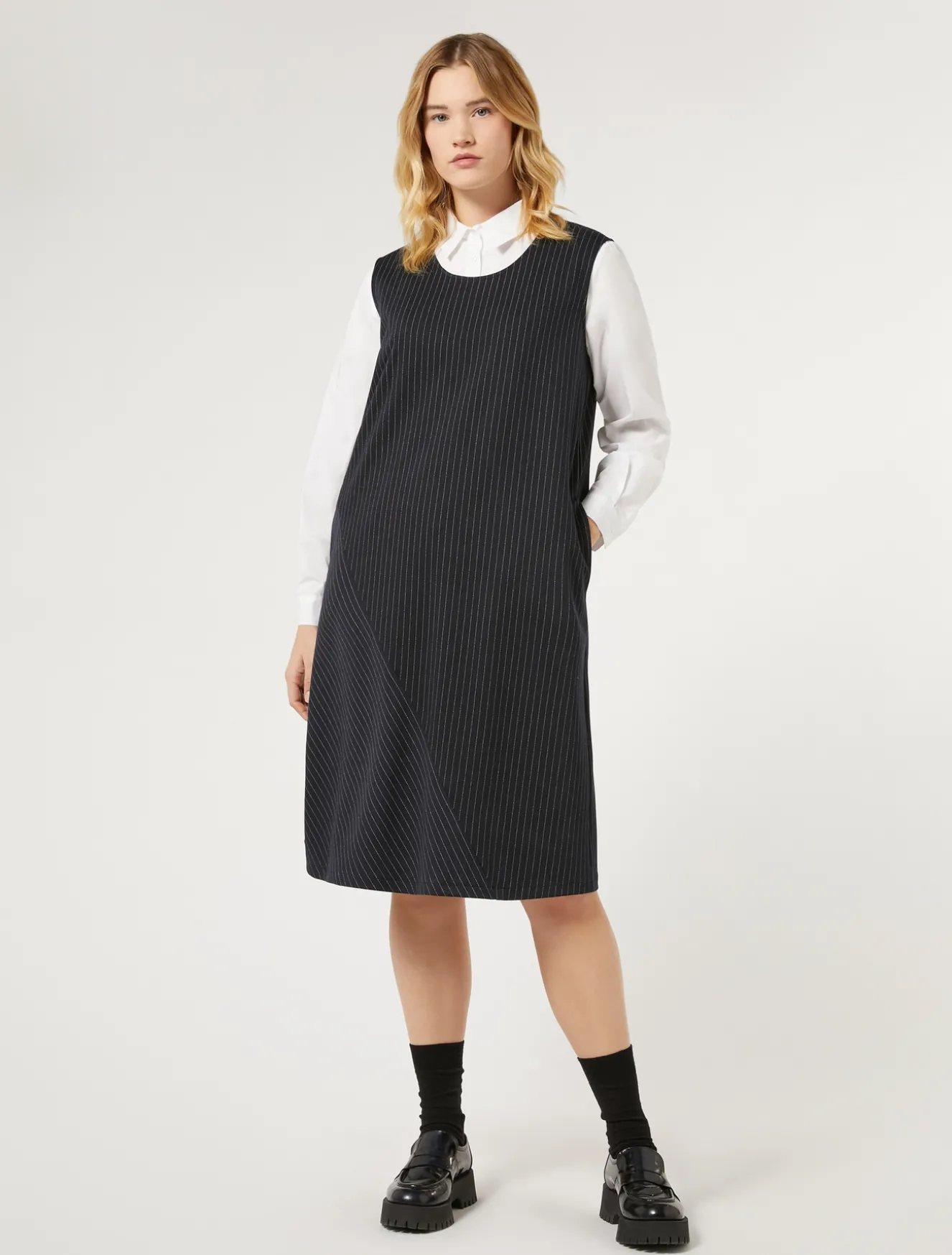 Dieses Kleid aus Punto Milano Gewebe ist einfach zu tragen und verfügt über Nadelstreifen mit asymmetrischem Aufnäher am Saum. Ein saisonaler Evergreen in Kombination mit T-Shirts und Hemdblusen.Das Kleidungsstück ist Teil der Kollektion Persona by Marina Rinaldi.