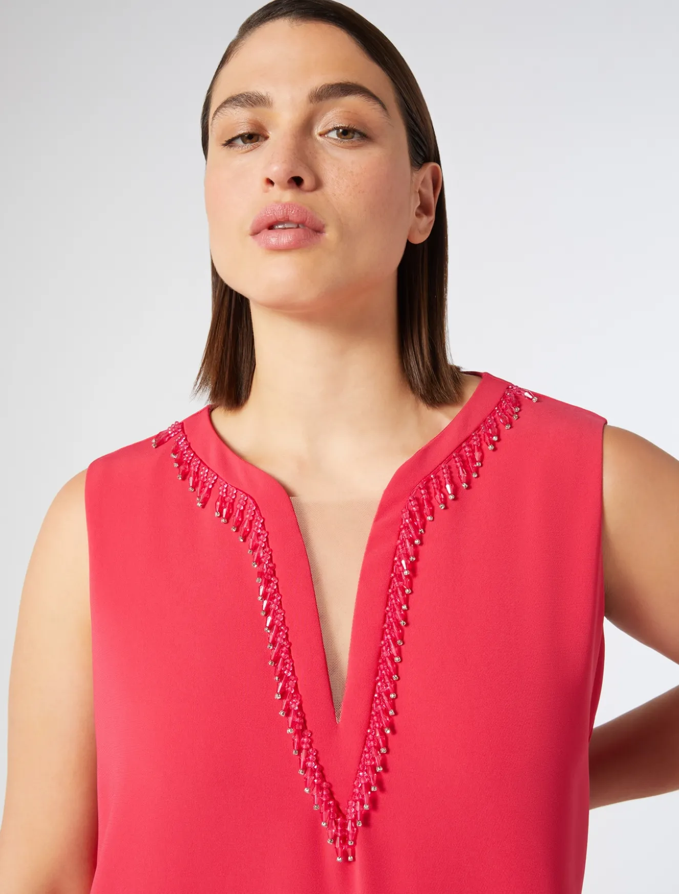 - Figurbetonter V-Ausschnitt mit Tüll