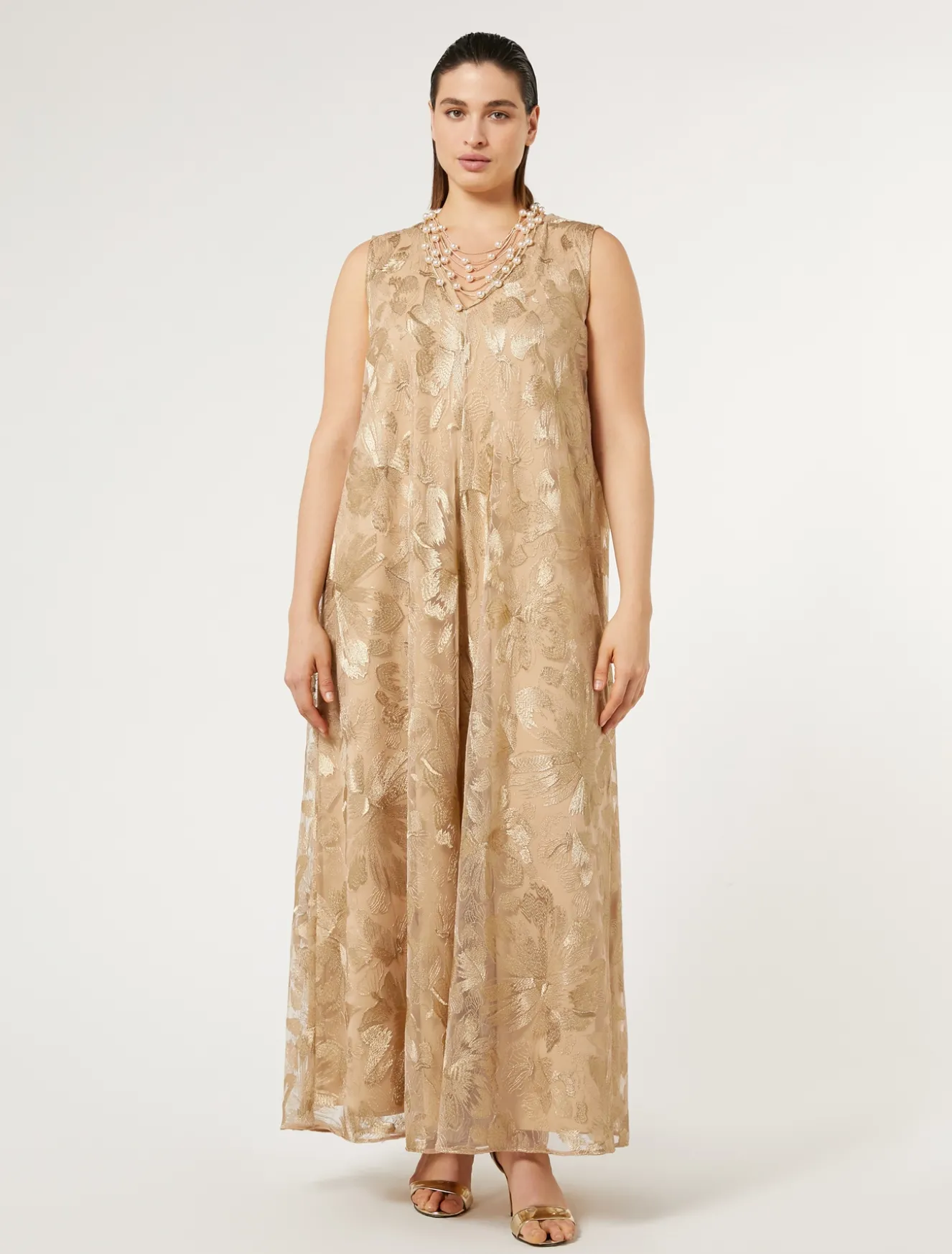 Langes Kleid aus Tüll mit Lamé-Blumenstickerei und tiefem Rückenausschnitt. Die langen Ärmel lassen sich unschwer von einem Schneider anbringen.Das Kleidungsstück ist Teil der Kollektion Elegante.