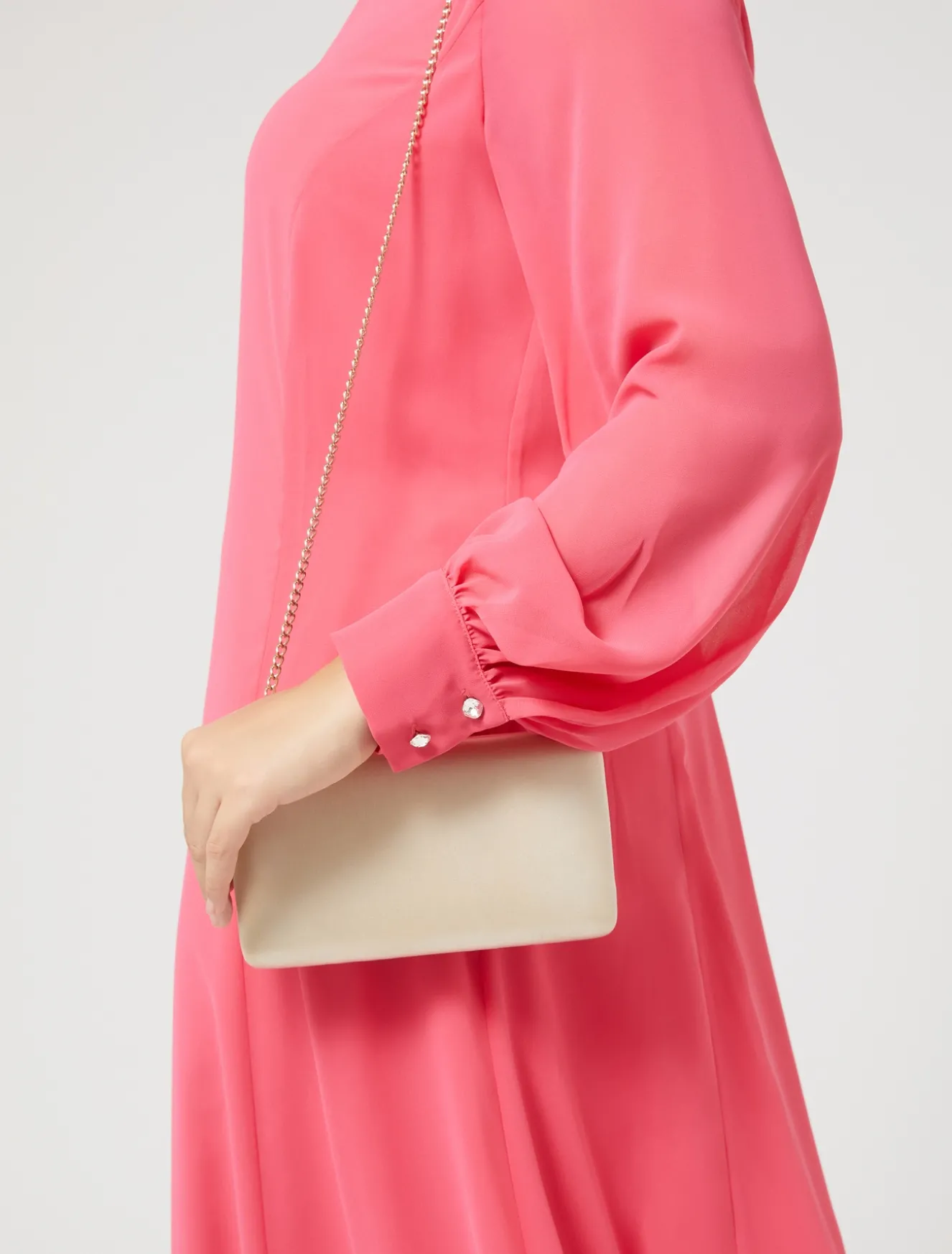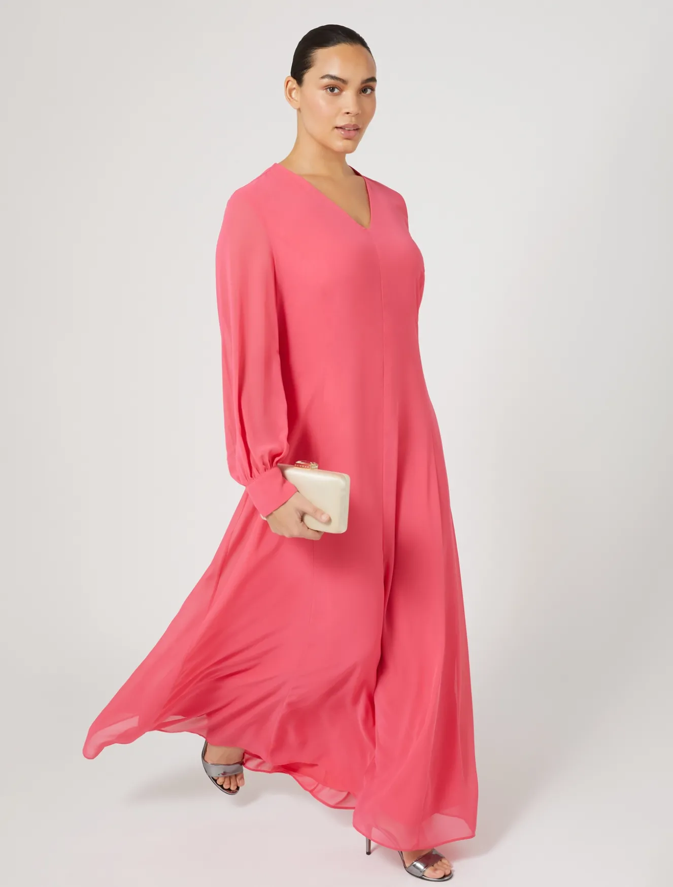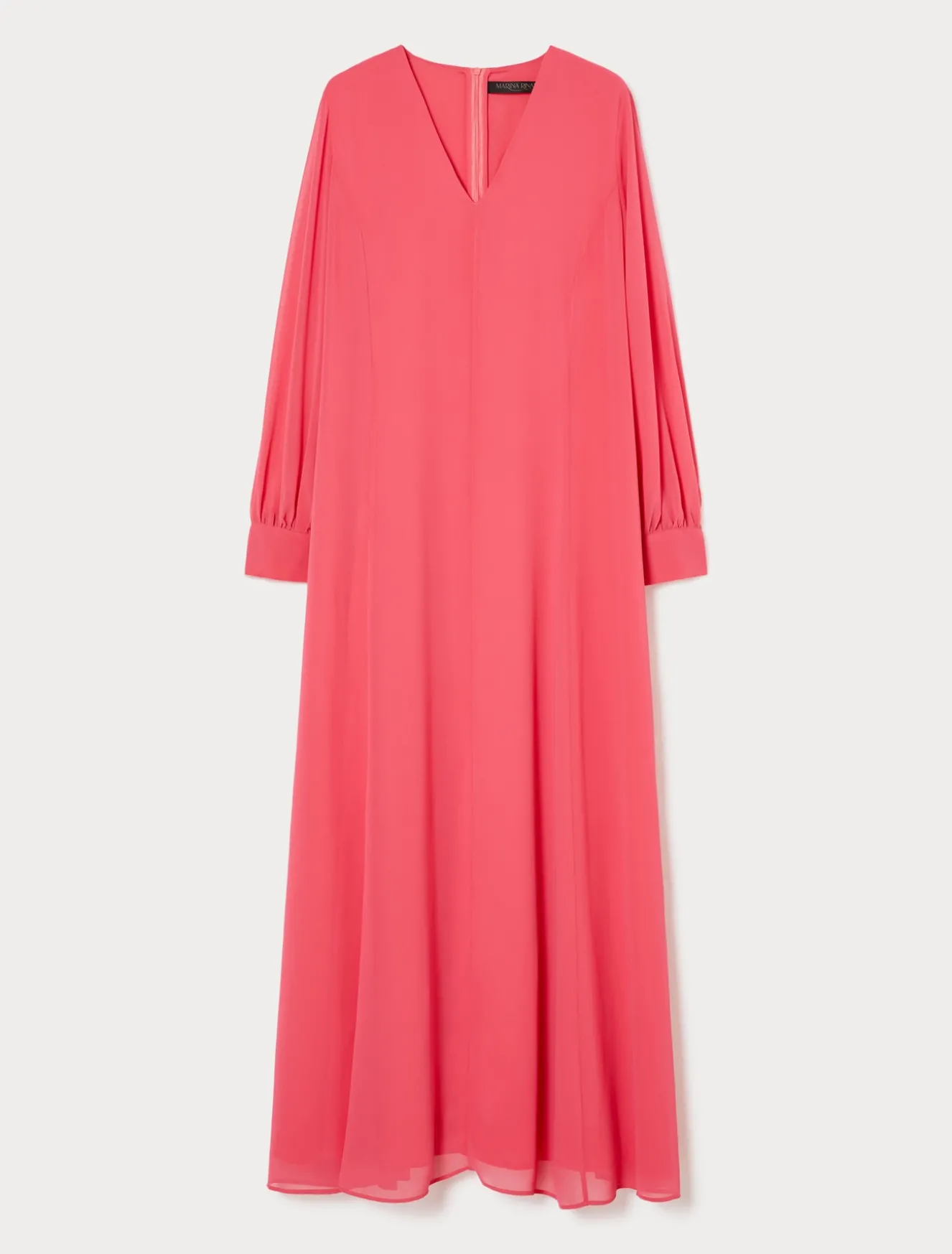 Lange Kleid aus Georgette-Crêpe mit raffinierter ausgestellter Linie. Perfekt mit High Heels und Clutches.Das Modell ist Teil der Kollektion Elegante.