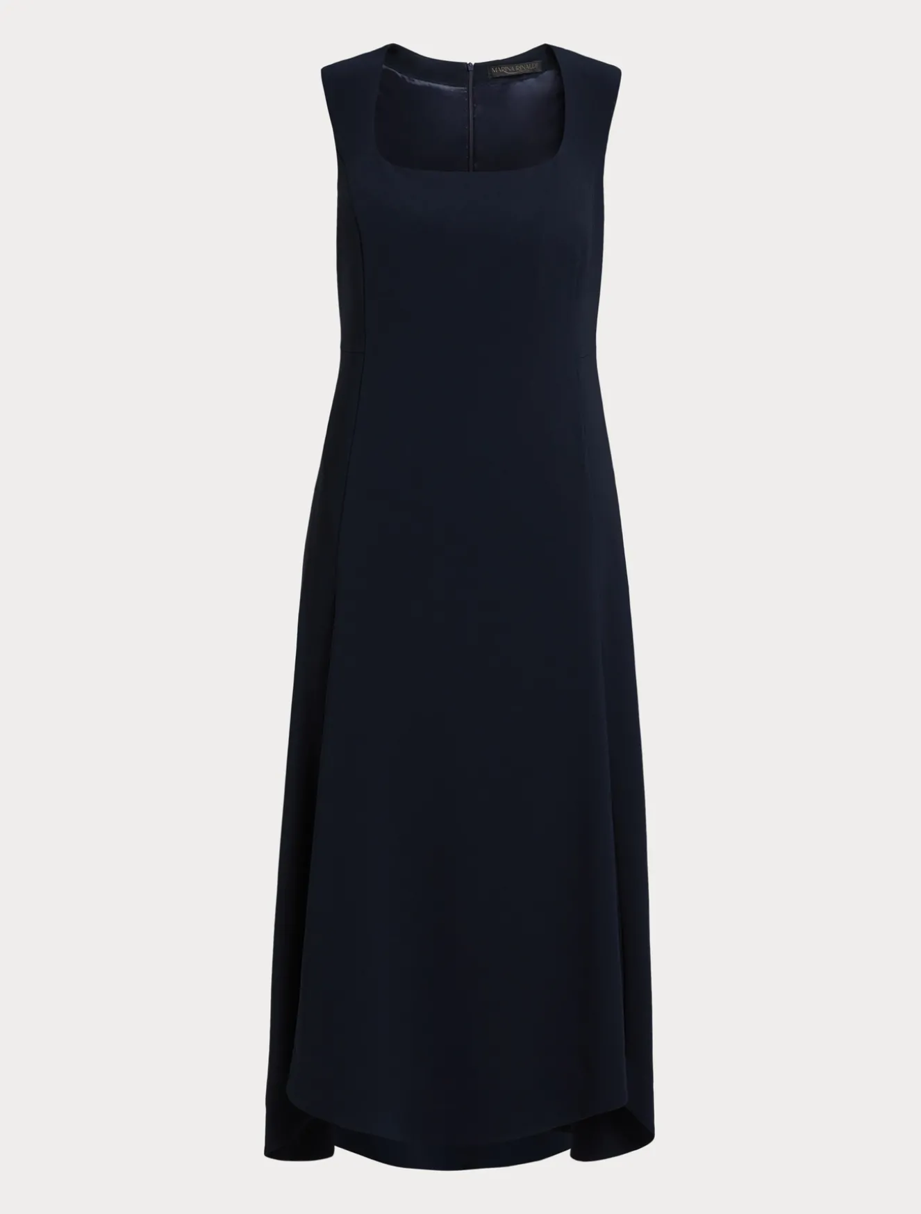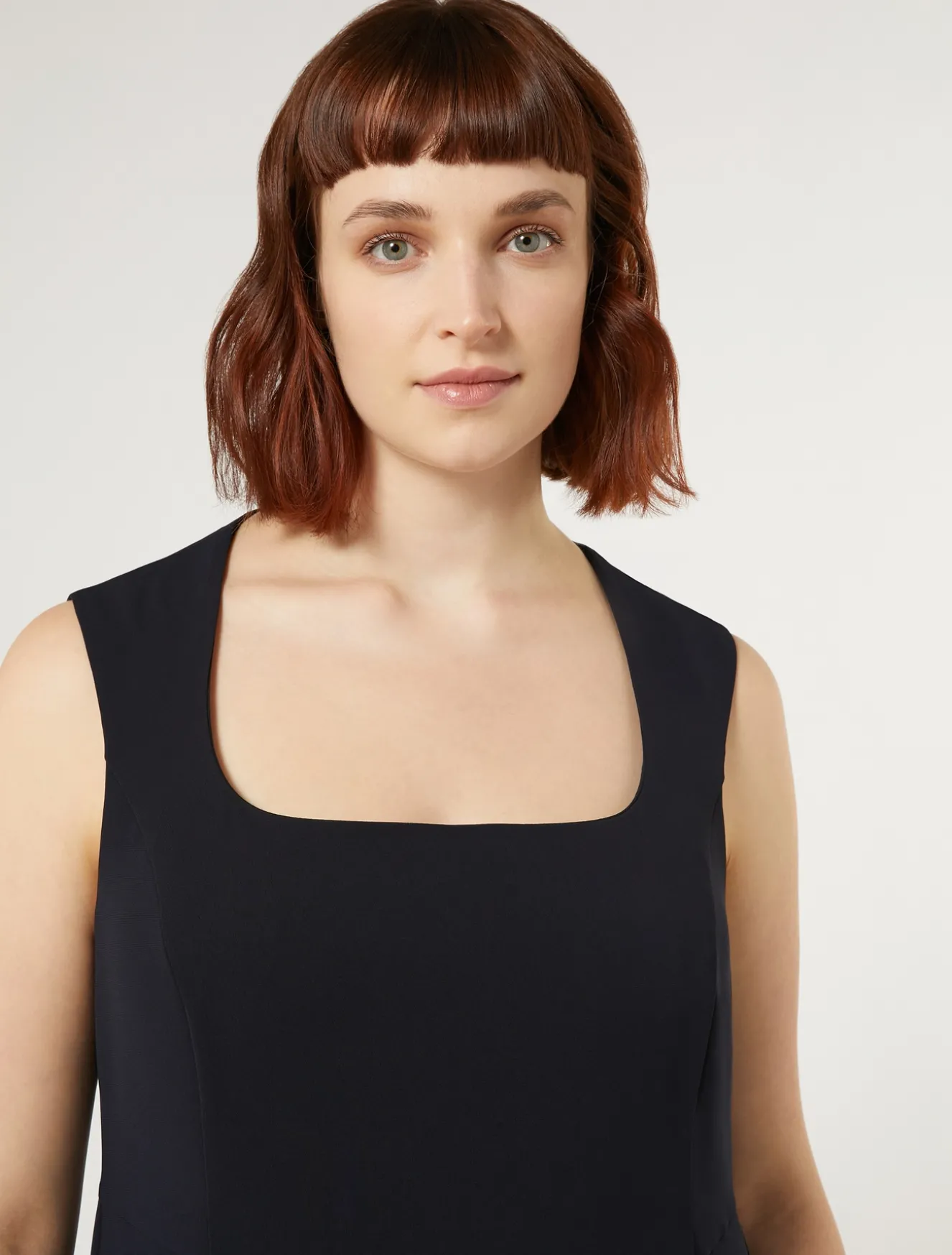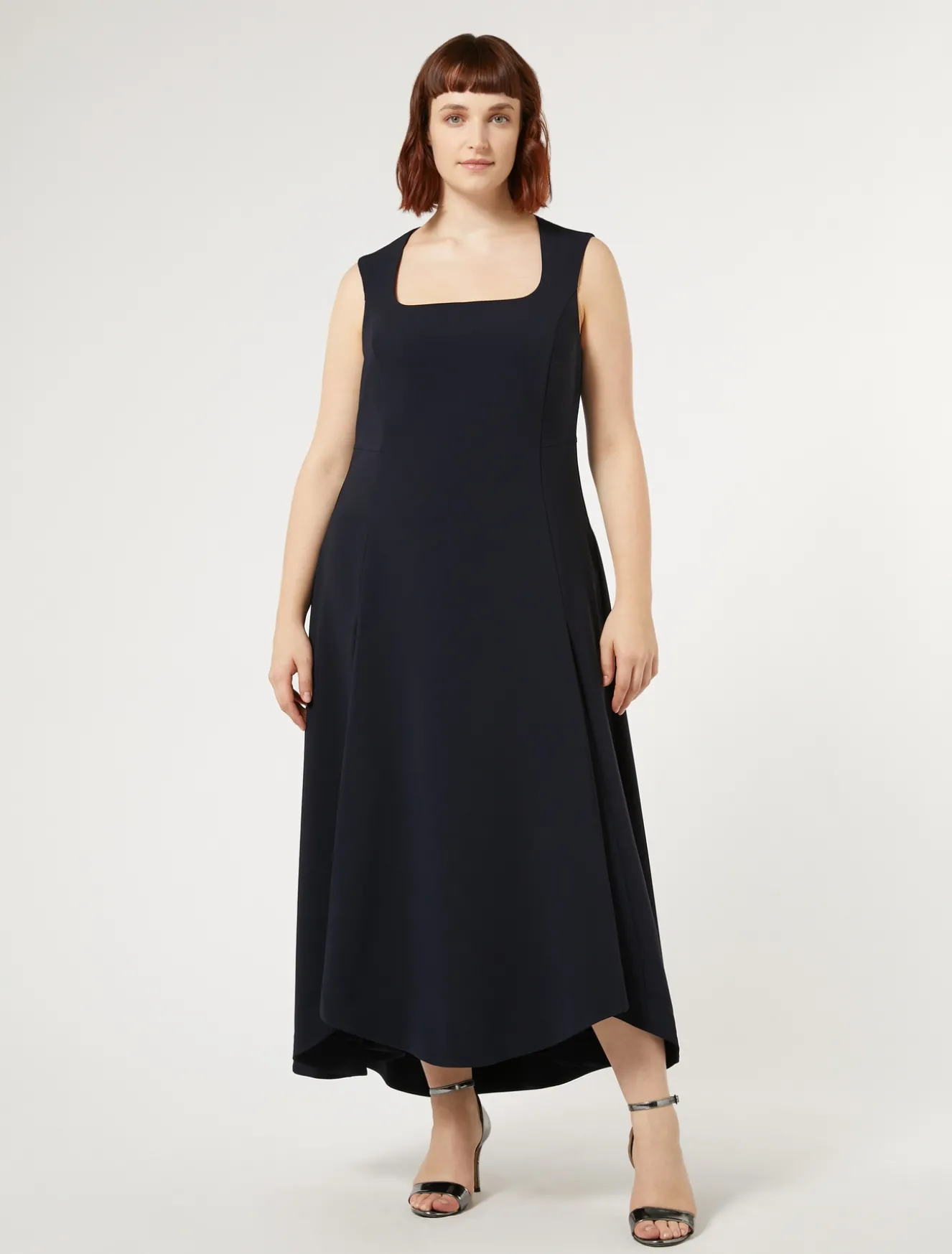 Langes Kleid aus Triacetat-Cady, ein fließendes, pflegeleichtes Material, das Problemzonen kaschiert, mit schmal geschnittener Brustpartie und Blütenrock. Die langen Ärmel lassen sich unschwer von einem Schneider anbringen.Das Kleidungsstück ist Teil der Kollektion Elegante.