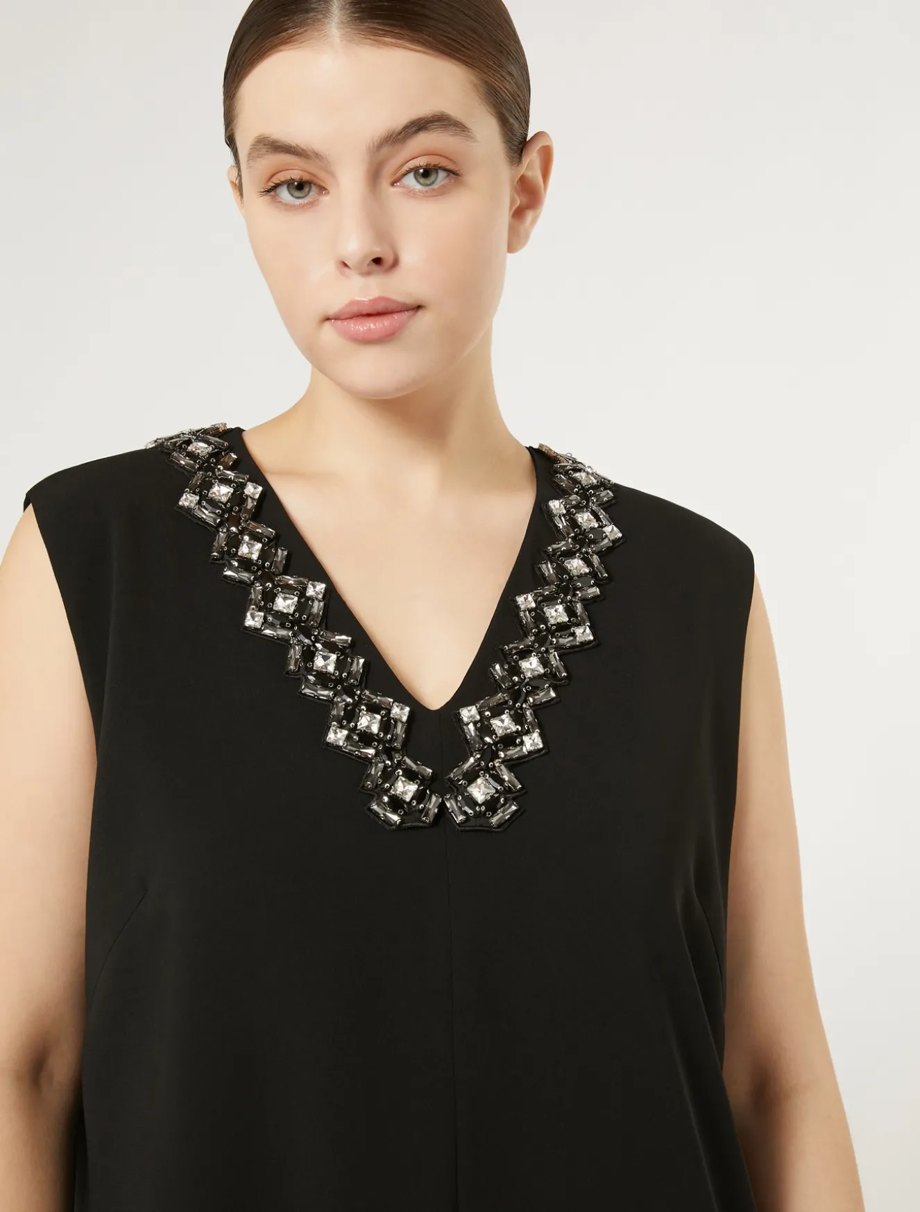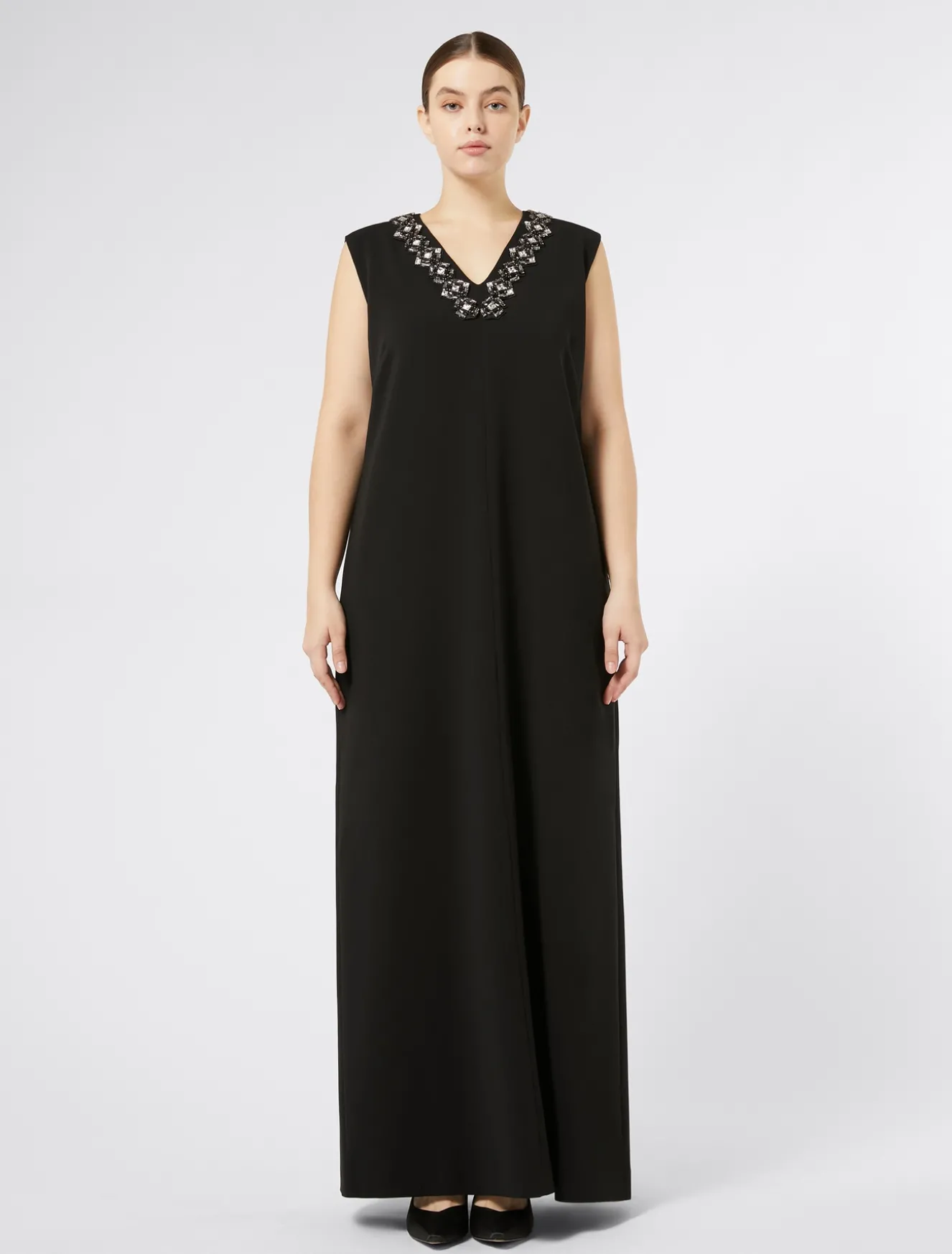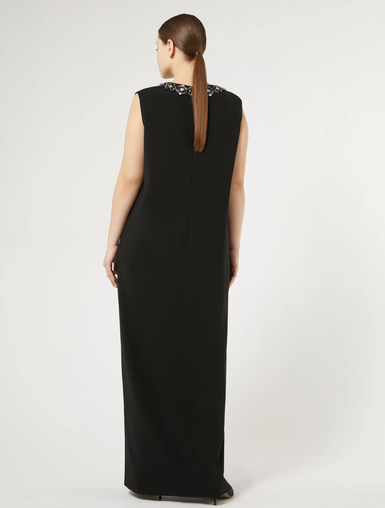 Das Kleid aus Triacetat-Cady, einem fließenden, pflegeleichten Material, das Problemzonen kaschiert, ist mit handbestickten und von Hand angebrachten Kristallen im geometrischen Design verziert. Die langen Ärmel lassen sich unschwer von einem Schneider anbringen.Das Kleidungsstück ist Teil der Kollektion Elegante.