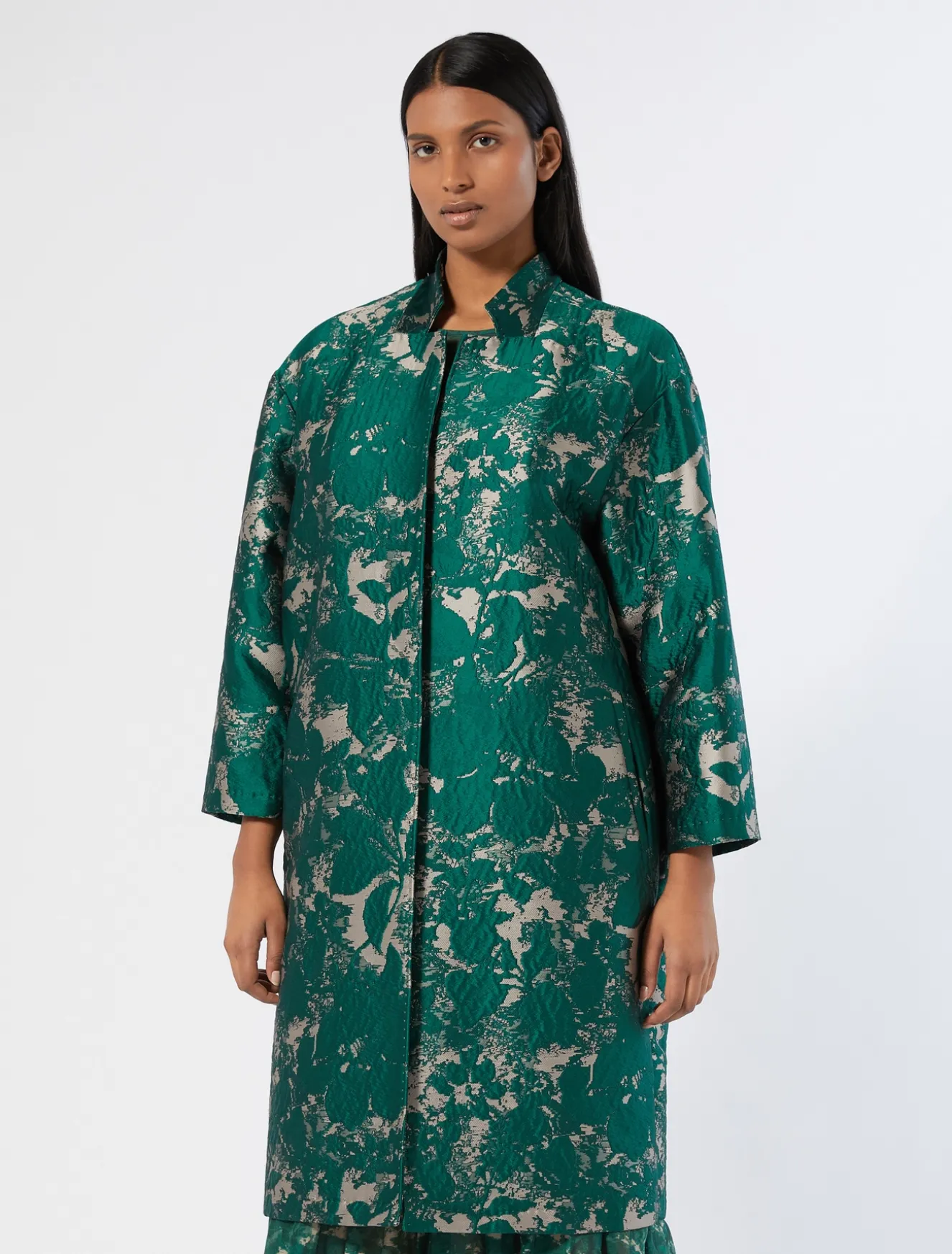 Leichter Mantel mit raffinierter Jacquard-Verarbeitung und Kokon-Passform. Mit handgenähter Ziernaht.