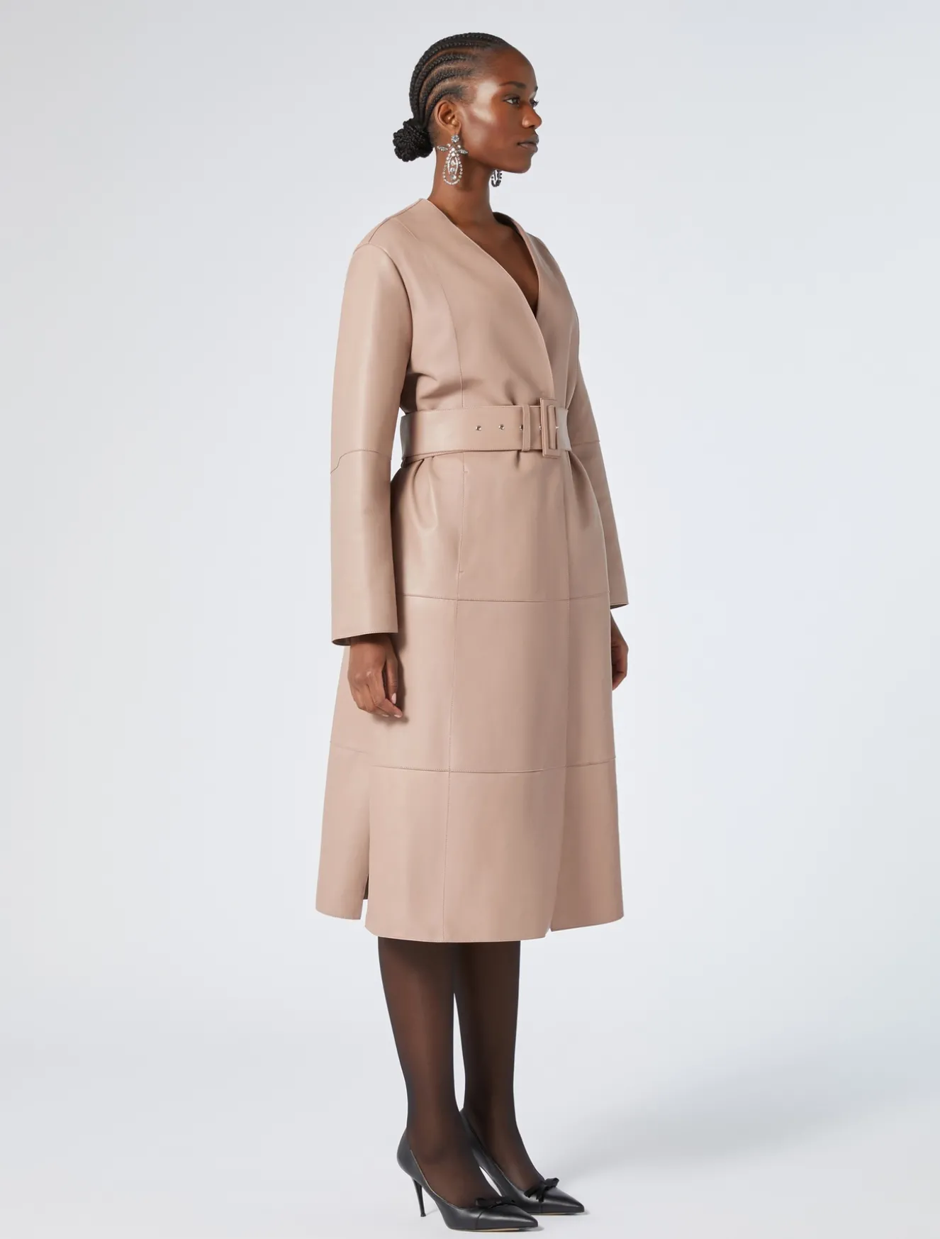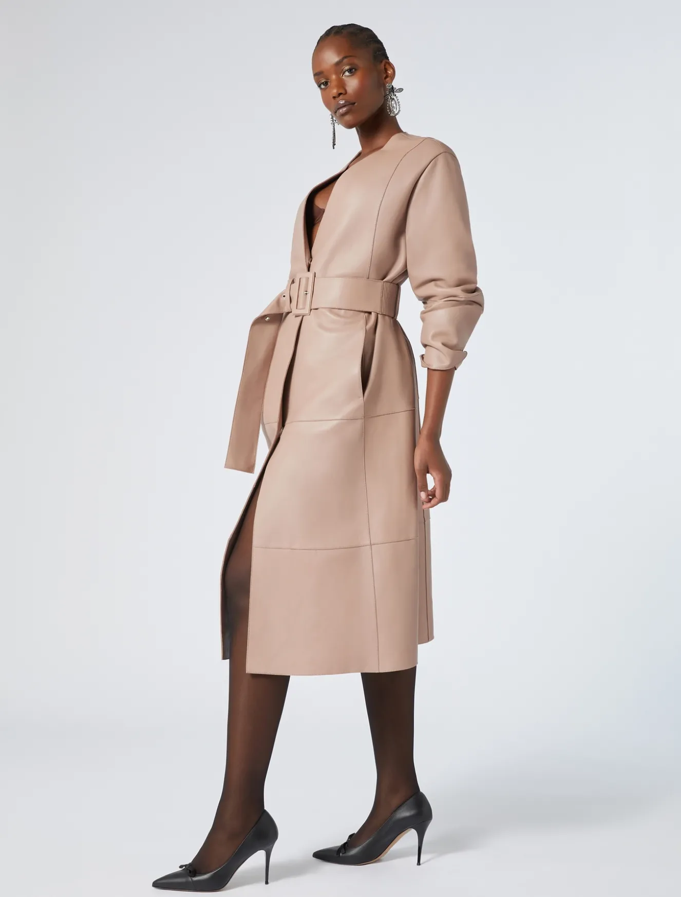 Dieser moderne und komfortable leichter Mantel aus Nappaleder und Jersey zeichnet sich durch ergonomische, kunsthandwerkliche Abnäher aus. Der passende Gürtel aus Nappaleder dient der Weitenregulierung in der Taille.