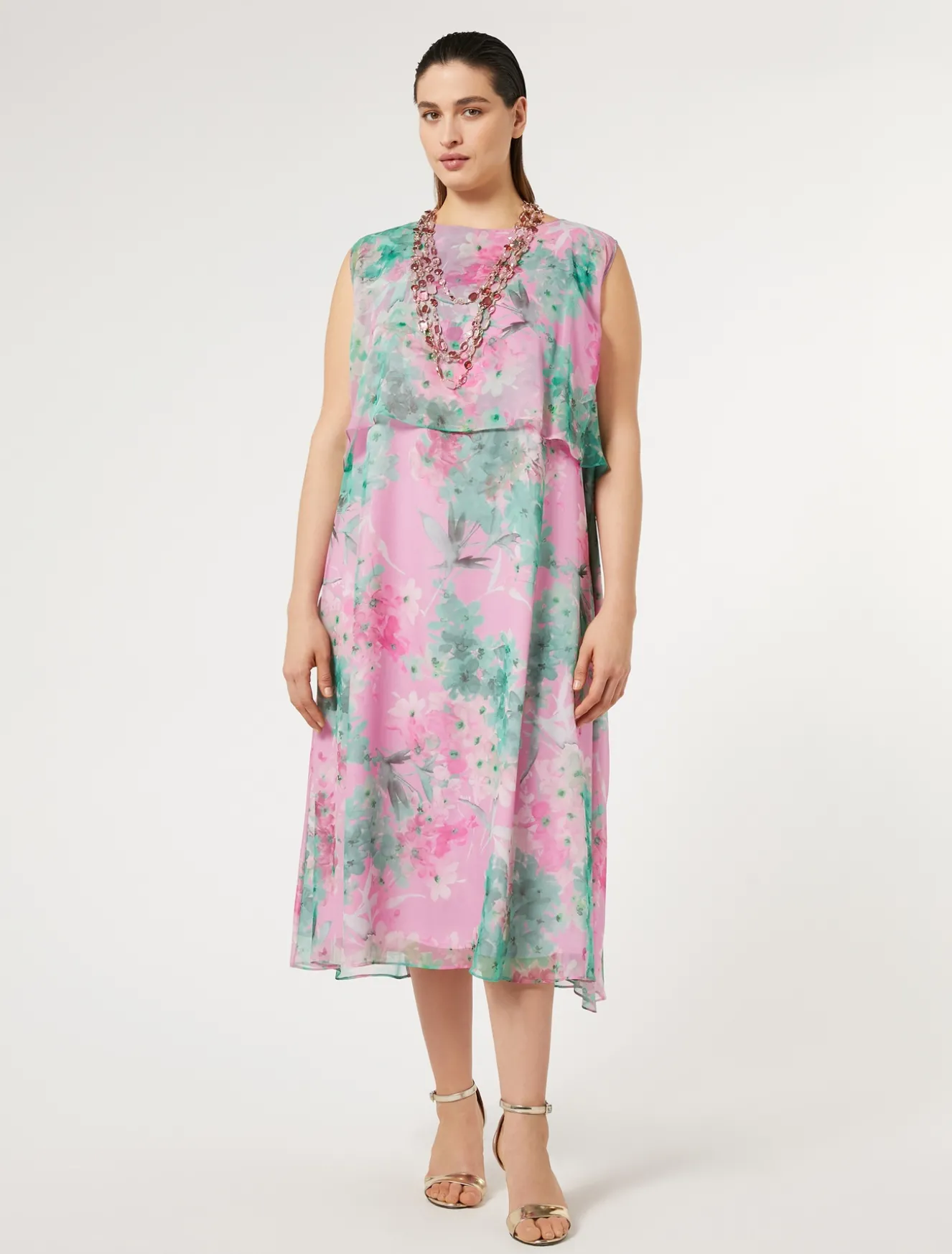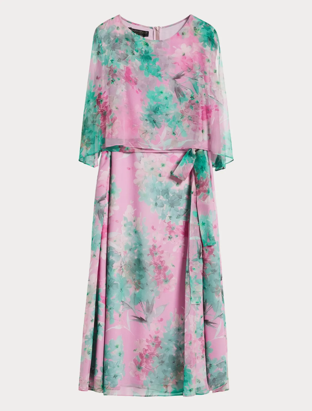 Das Kleid aus reiner Seidengeorgette mit einem exklusivem Blumen-Print kann nach Lust und Laune getragen werden. Dank der doppelten Rüschenkonstruktion können die Arme von den Armlöchern gezogen werden, um einen Cape-Effekt mit Öffnung an den Schultern zu erzielen.Das Kleidungsstück ist Teil der Kollektion Elegante.