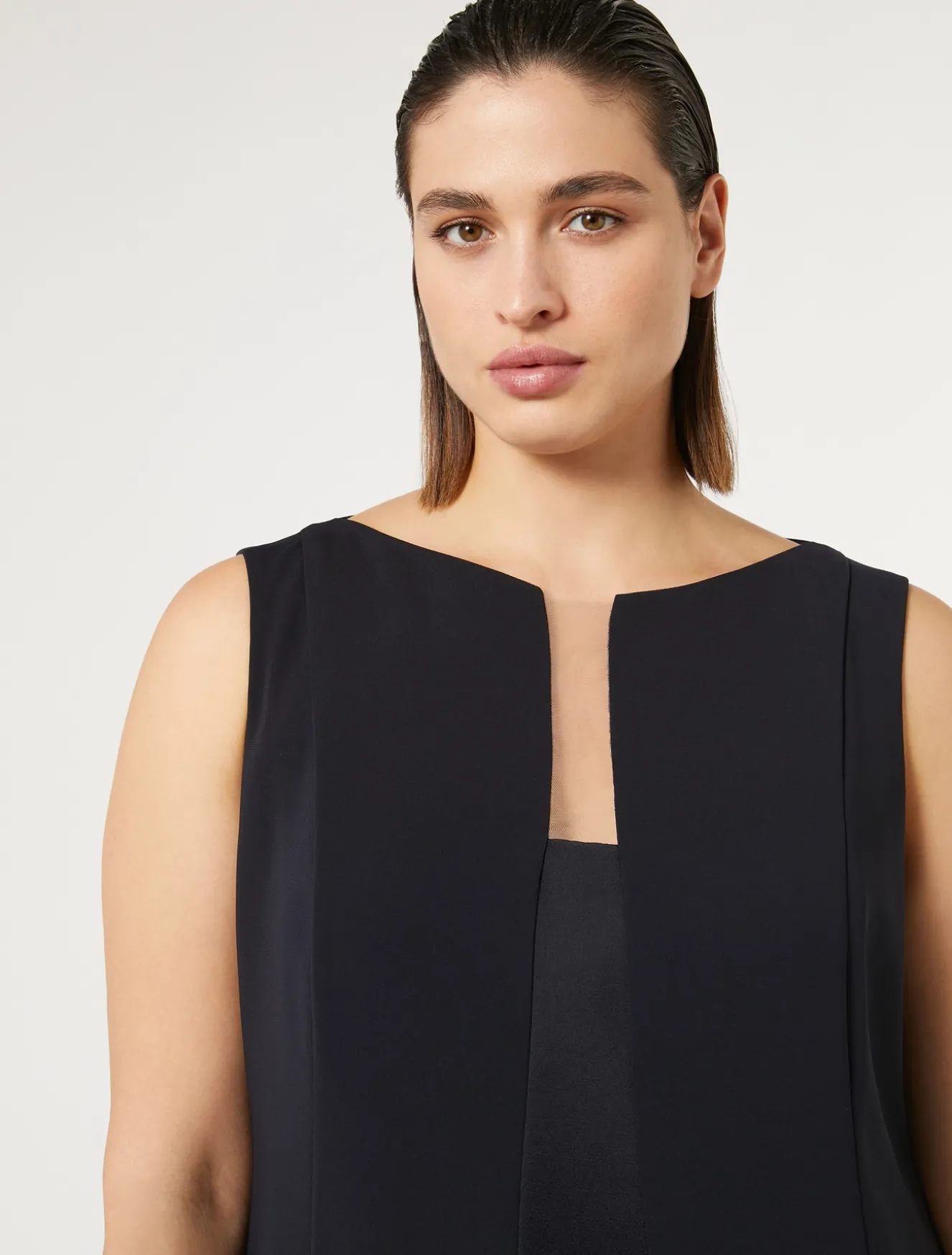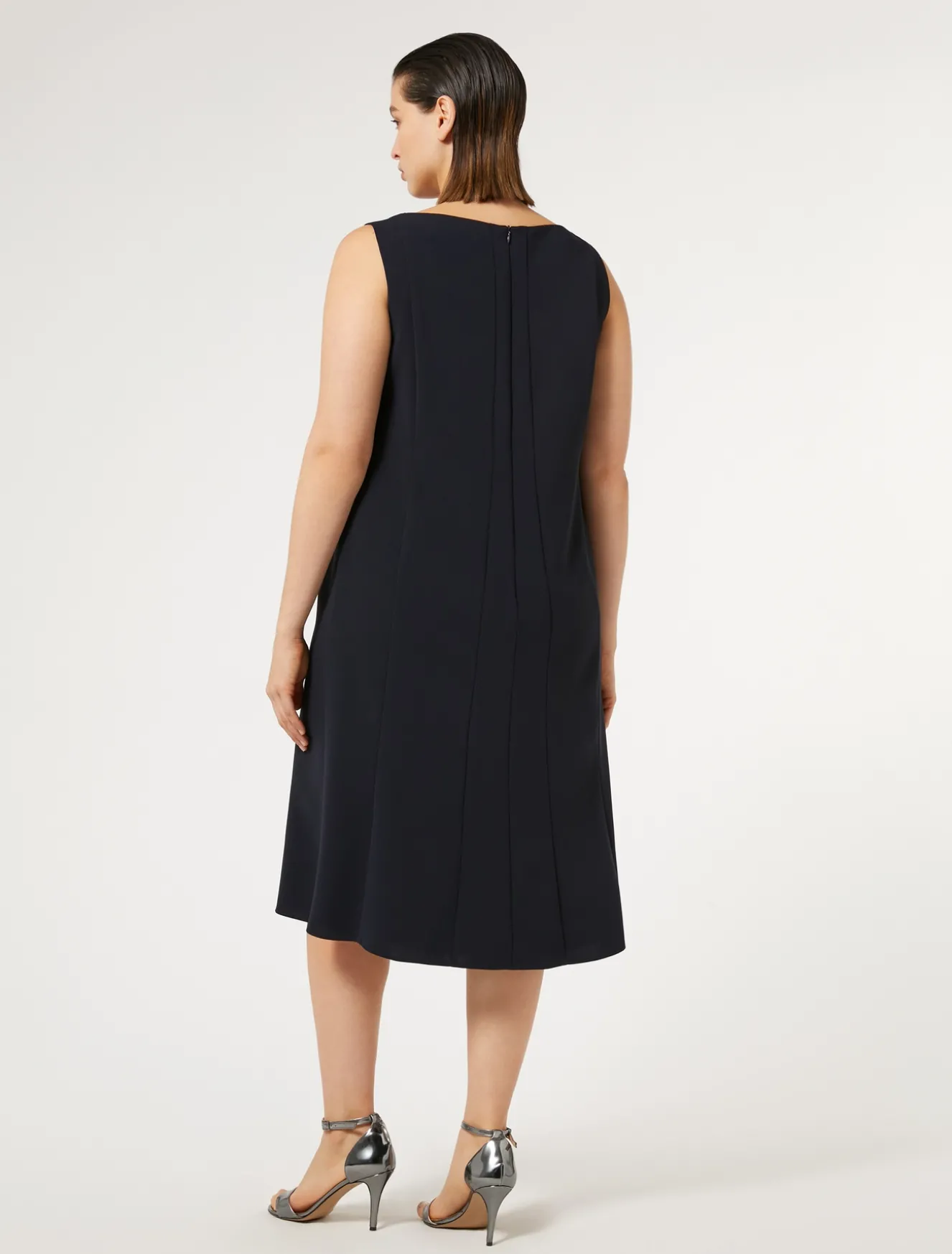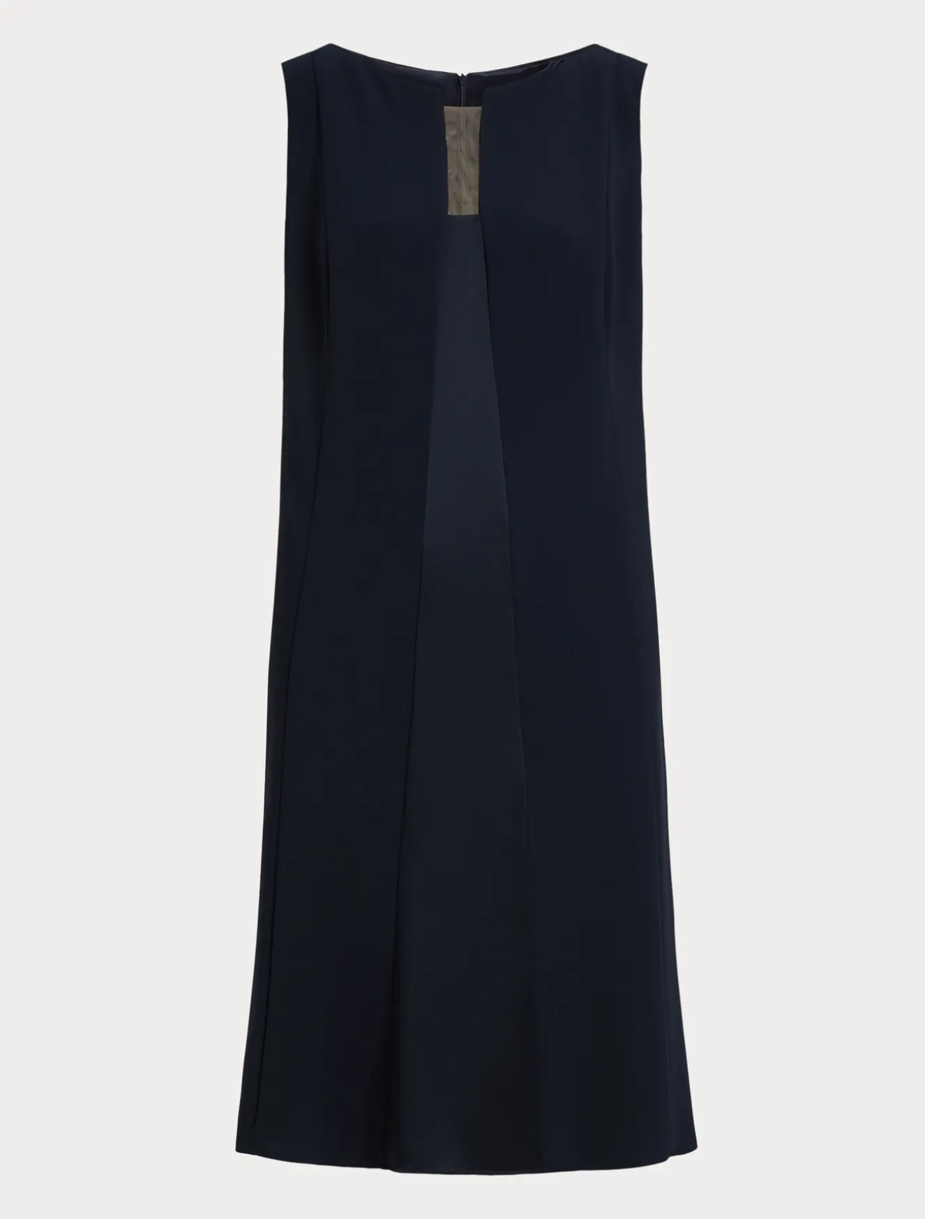 Dieses Midikleid ist aus Triacetat-Crêpe gefertigt und wird durch vertikale, konturierte Nähte vorne und hinten mit einem mittigen Einsatz aus glänzendem Gewebe definiert. Die passenden Ärmel lassen sich unschwer von einem Schneider anbringen. Das Kleidungsstück ist Teil der Kollektion Elegante.