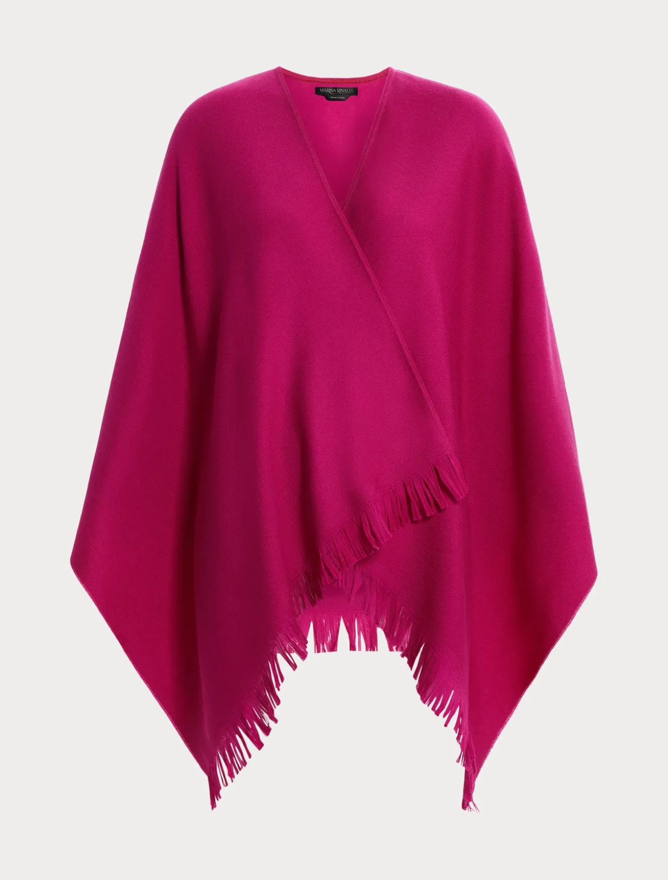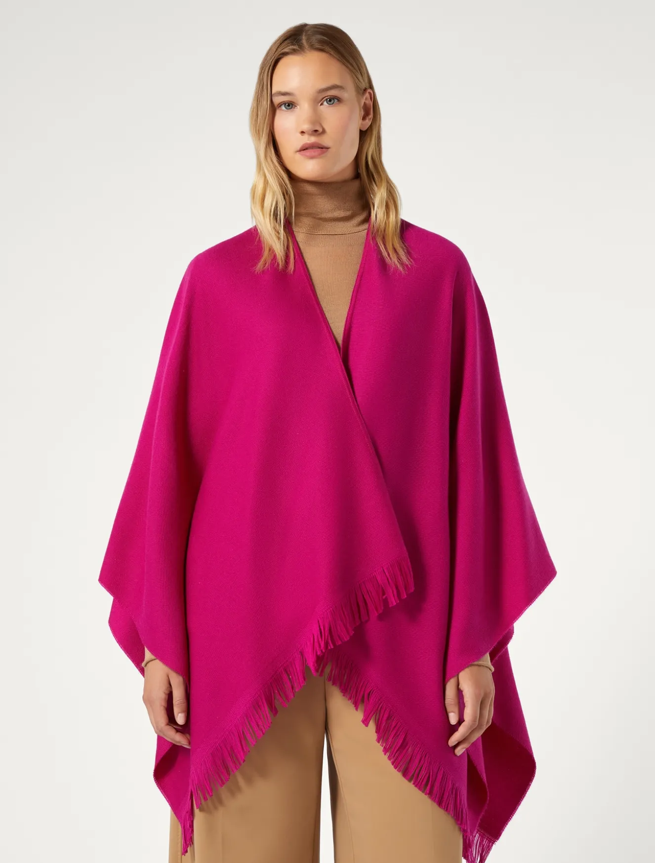 Dieses Cape aus reiner Wolle mit Fransen besetzten Säumen kann solo oder im Lagenlook getragen werden. Dieses Modell gehört zur Hauptkollektion von Marina Rinaldi.