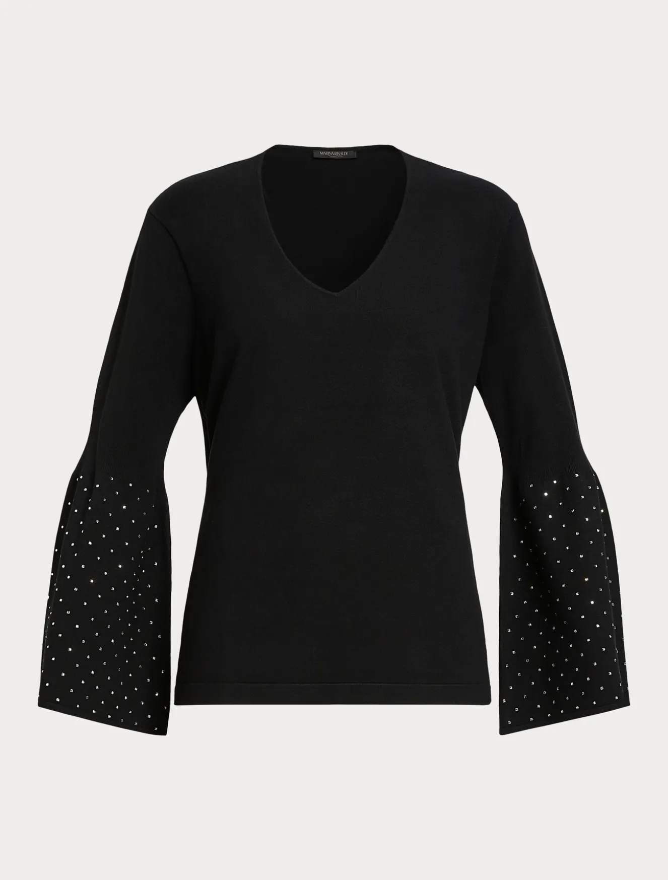 Warmer Pullover aus Viskose-Stretchgarn mit raffinierter Stickerei mit thermoklebende Kristallen an den Bündchen.Das Kleidungsstück ist Teil der Kollektion Elegante.