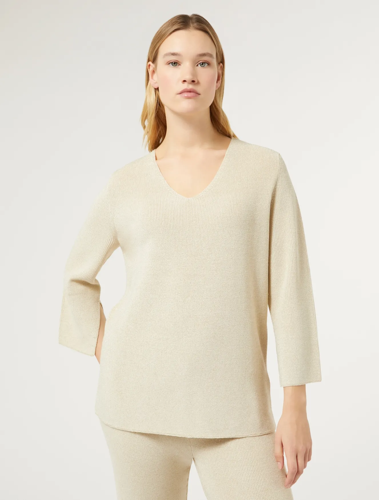 Pullover aus Viskose- und Lurexgarn in Patentmuster-Verarbeitung. Eleganz für jeden Tag.Das Kleidungsstück ist Teil der Kollektion „Voyage“.