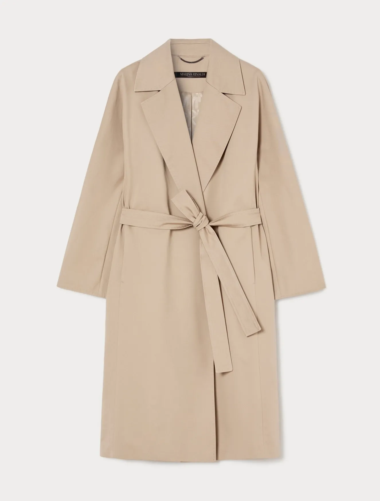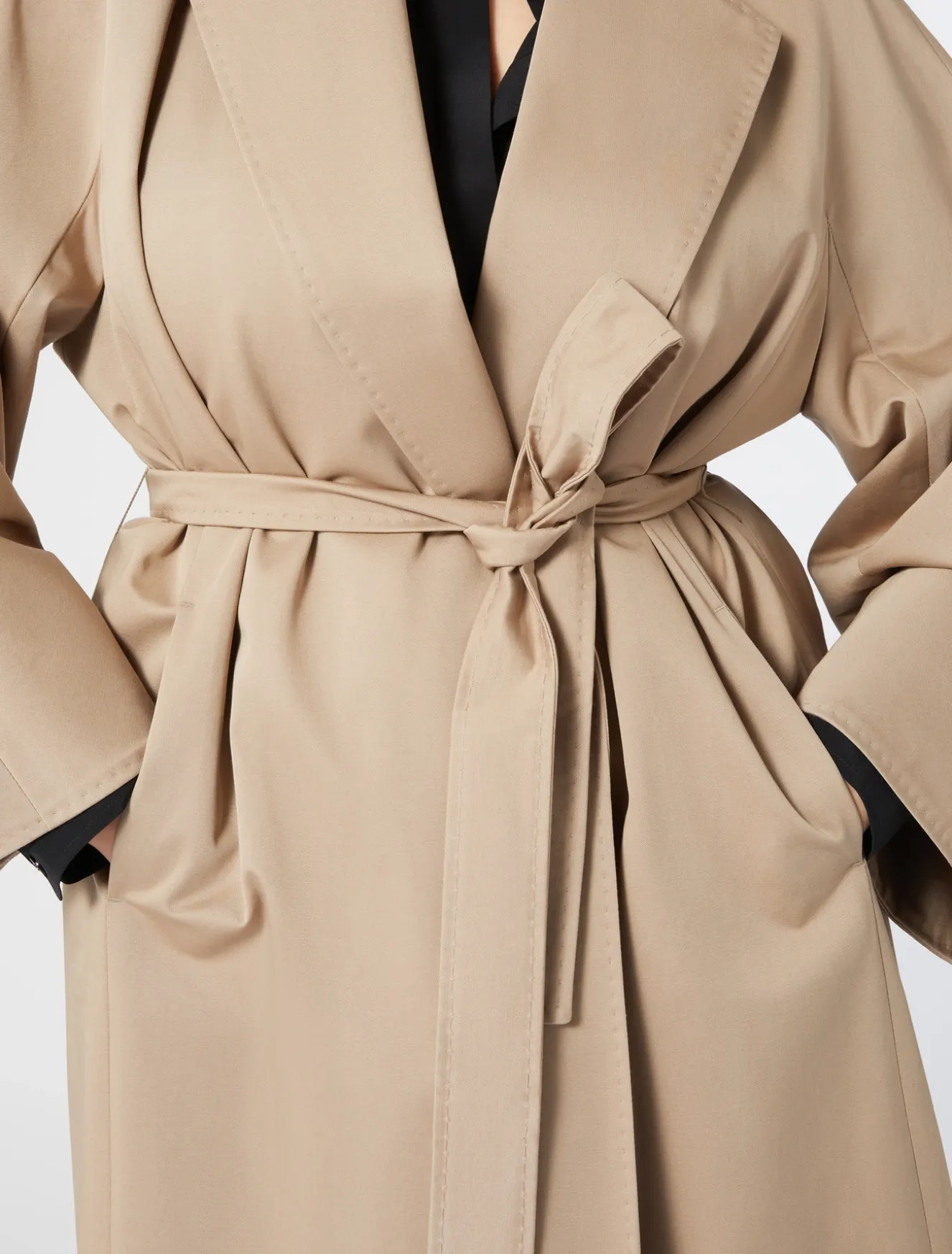 Eleganter und funktioneller Regenmantel aus gewaschener, wasserabweisender Baumwollgabardine mit handgenähter Ziernaht. Der passende Bindegürtel dient der Weitenregulierung in der Taille.