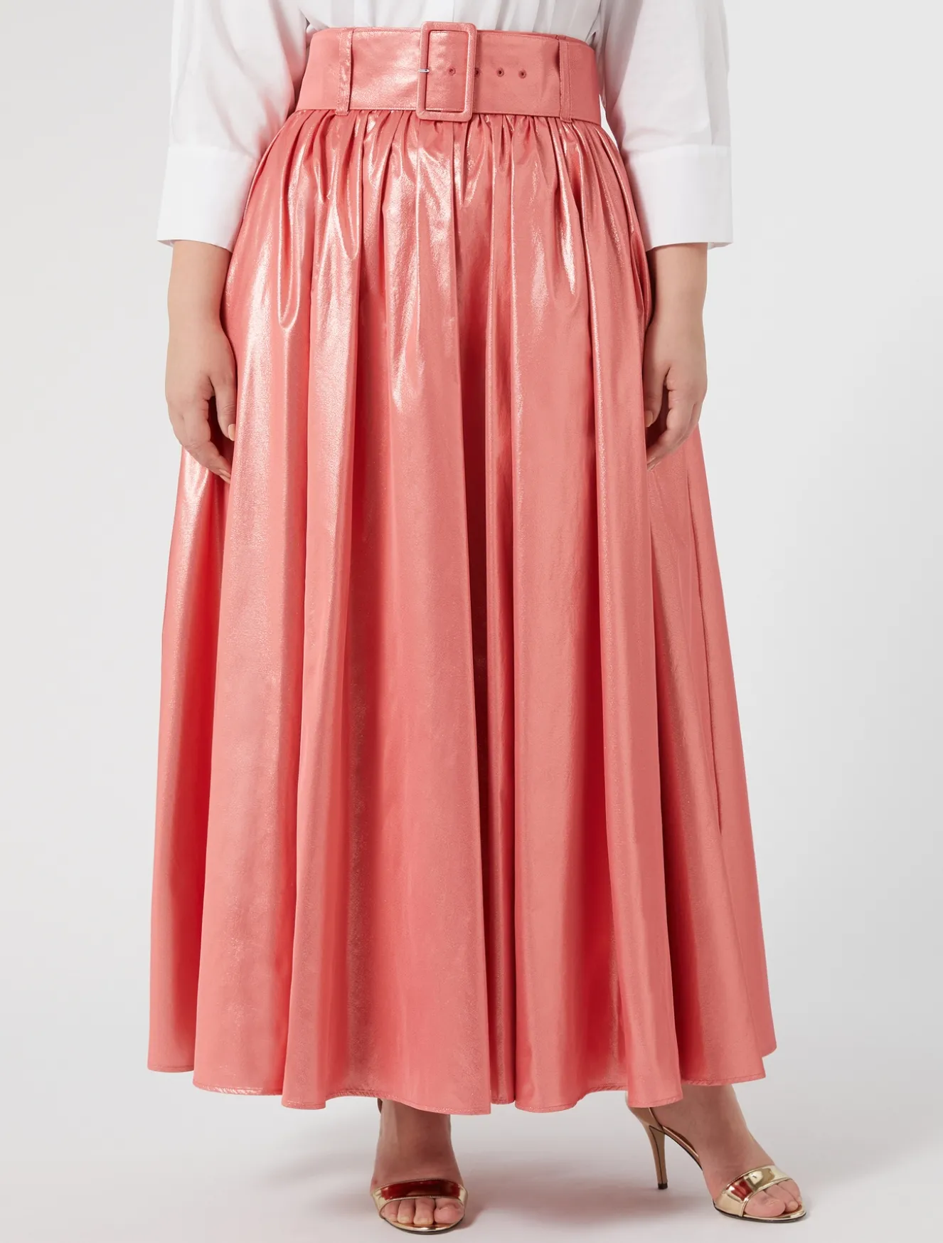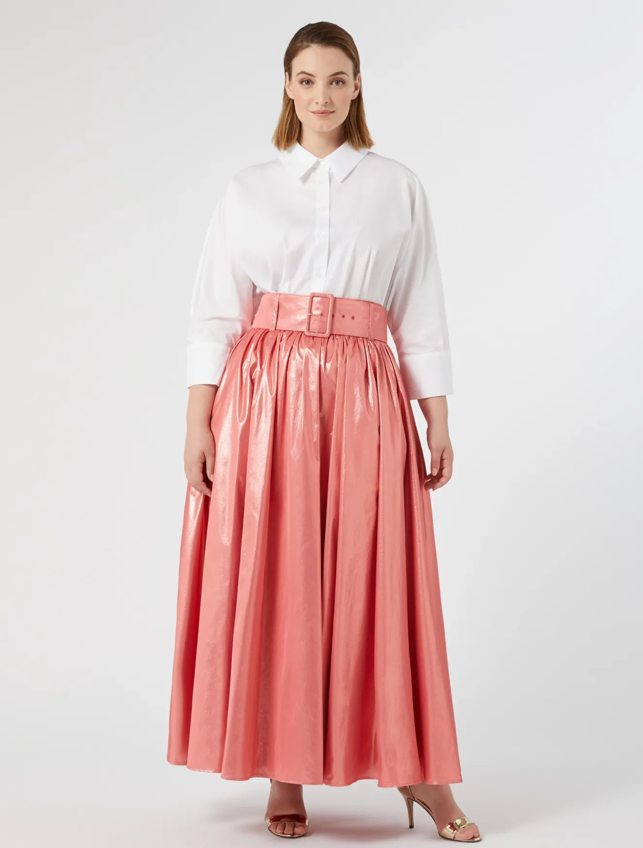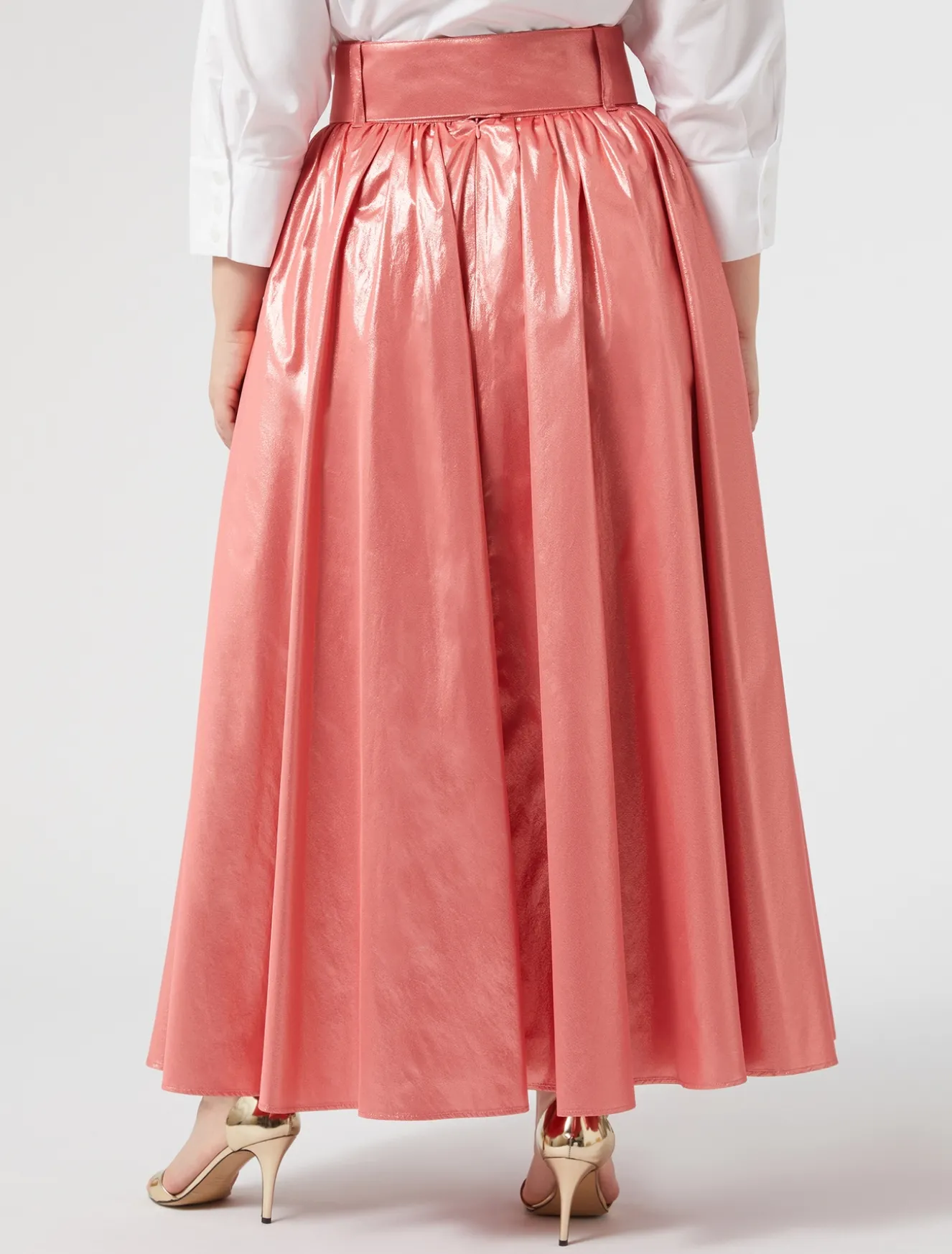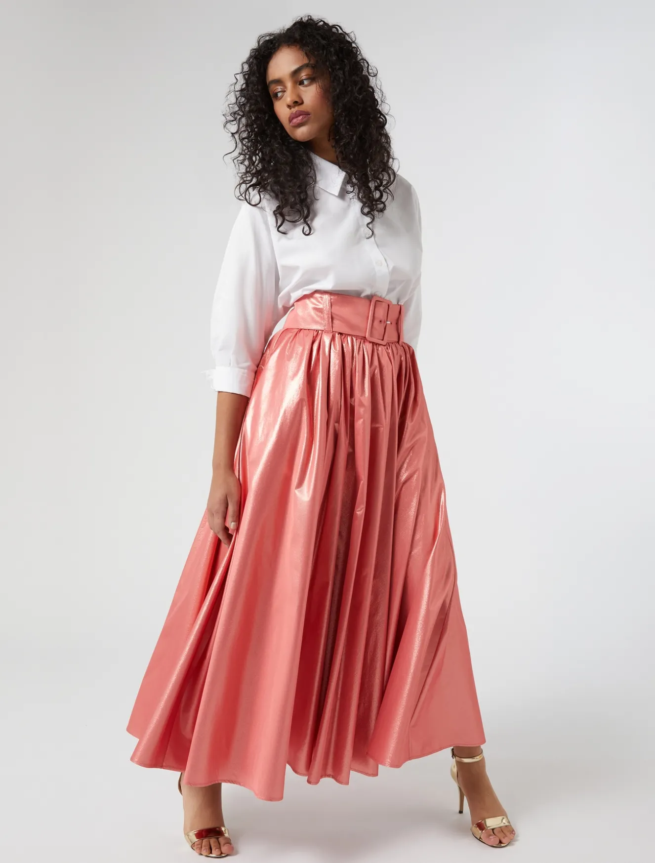 Weiter, halber Tellerrock aus Lurextaft mit Rüschen. Das Modell lässt sich mit dem dazugehörigen Taillengürtel anpassen.Das Kleidungsstück ist Teil der Sonderkollektion von Sara Battaglia für Marina Rinaldi.