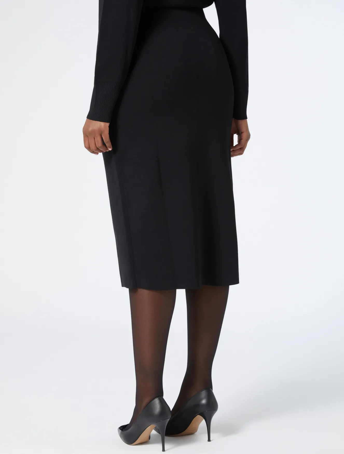 Dieser Bleistiftrock aus einfarbigem Fallmaschenstrick aus matter Comfort-Viskose besticht durch einen schmucksteinbesetzten Knopfverschluss. Tragen Sie ihn einfach, um einen Alltagslock aufzupeppen, auch in Kombination mit dem passenden Pullover.