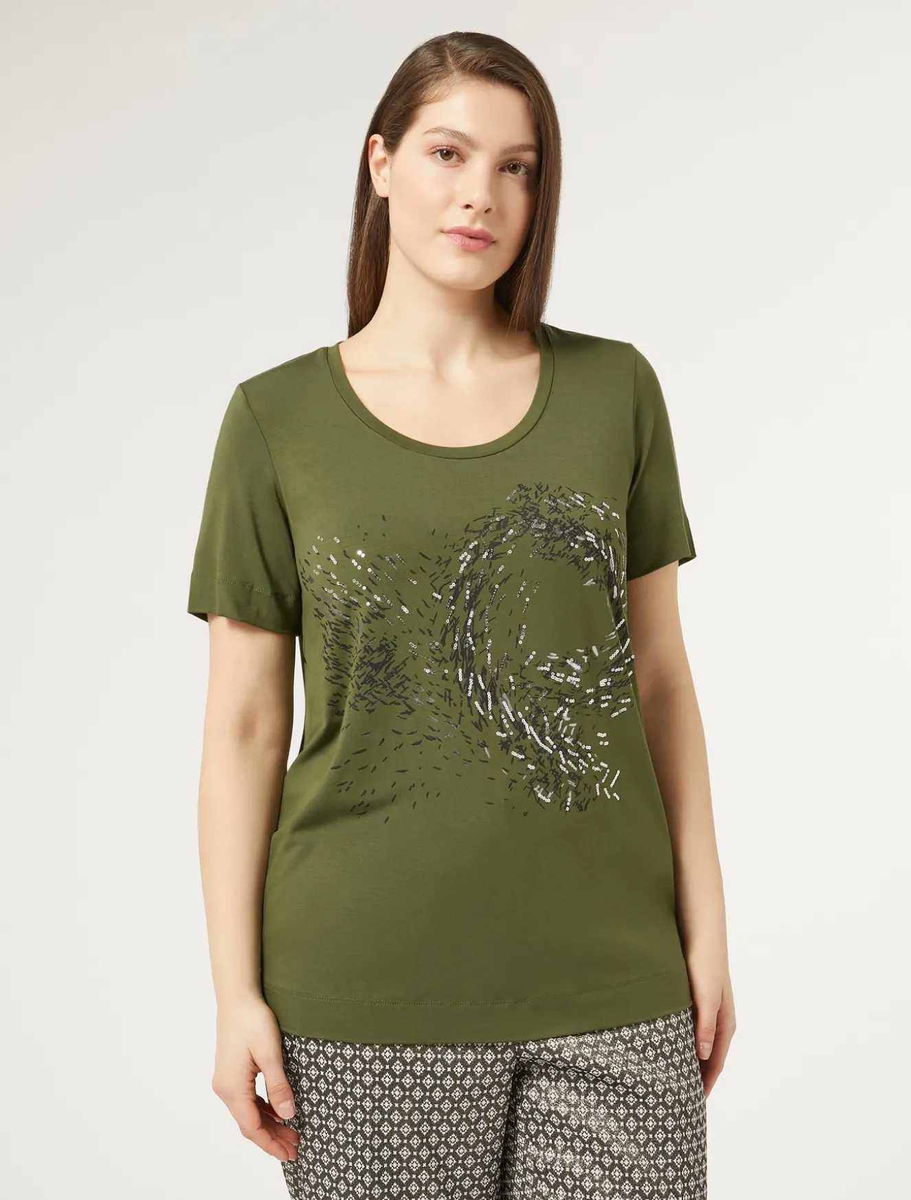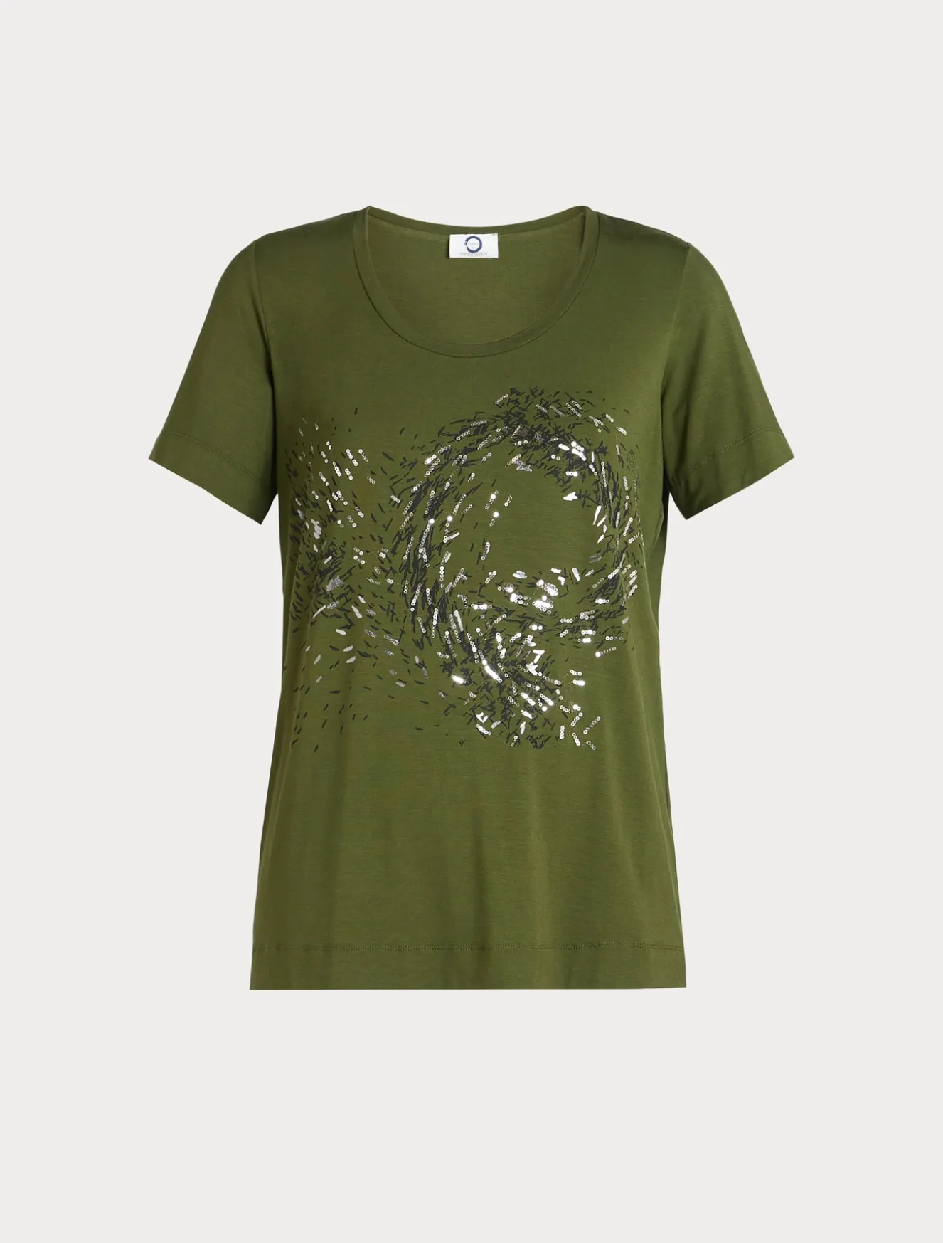 Dieses T-Shirt aus weichem Viskose-Jersey ist mit einer Paillettenstickerei und einem Print verziert. Schlicht und doch schick.Das Kleidungsstück ist Teil der Kollektion „Voyage“.