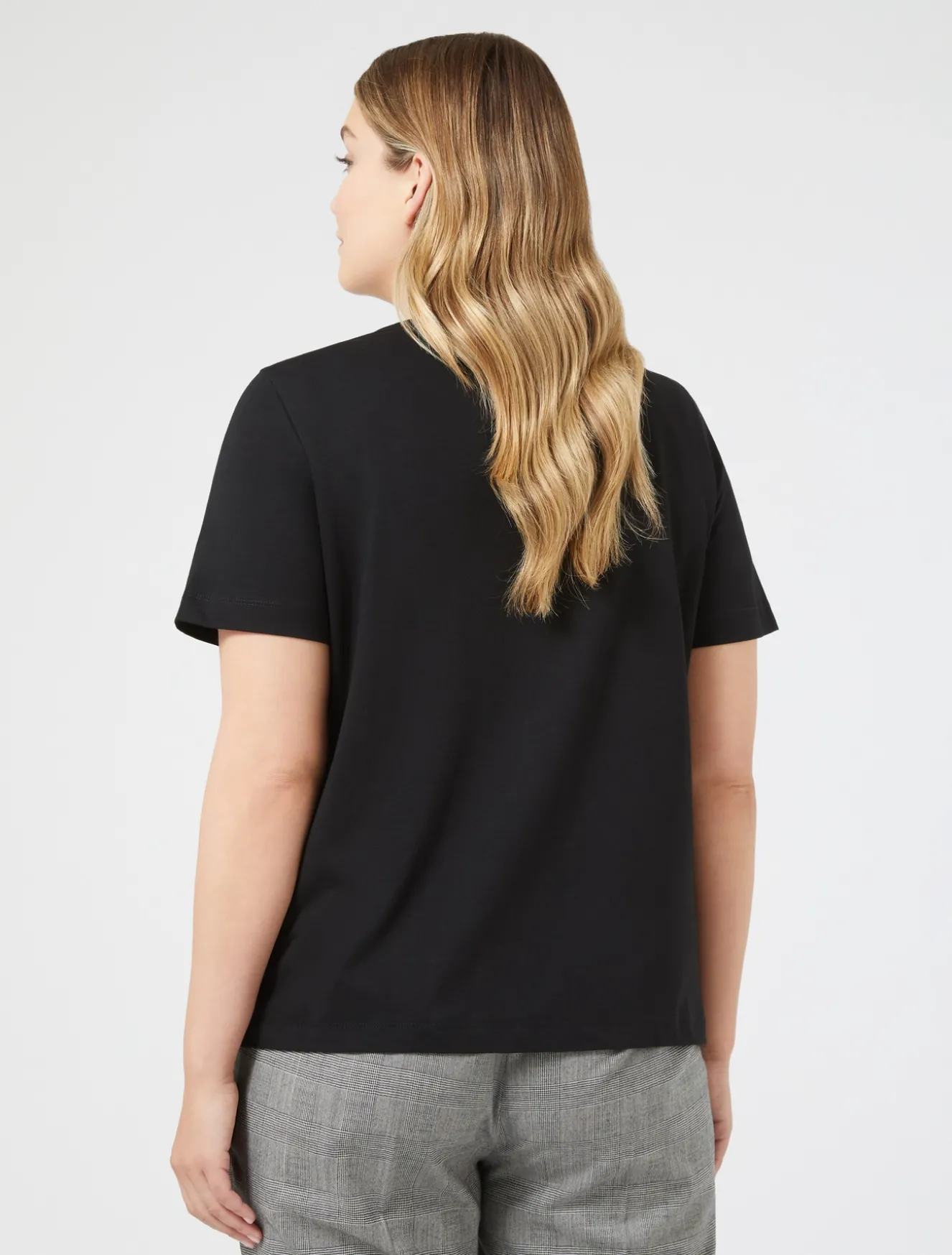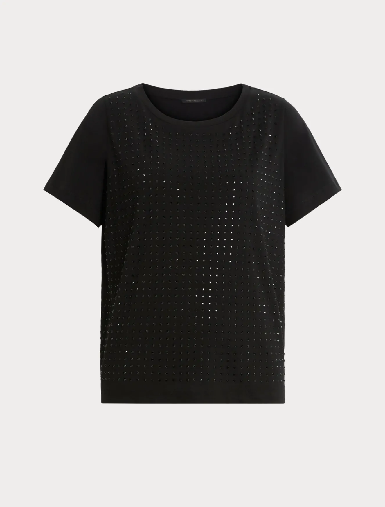 Dieses T-Shirt aus weichem Baumwoll-Jersey ist auf der Vorderseite mit wärmeklebenden Strasssteinen verziert. Schlicht und doch schick.Dieses Modell gehört zur Hauptkollektion von Marina Rinaldi.