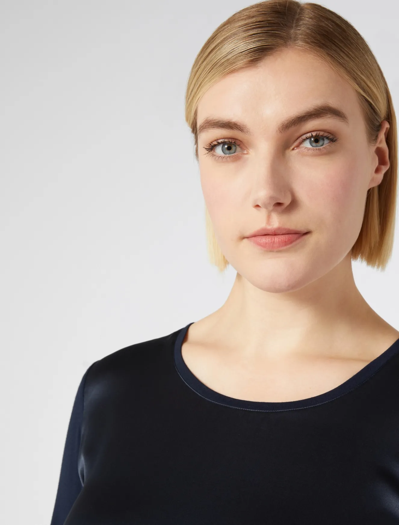 T-Shirt aus Viskose-Jersey und elastischem Seidensatin vorne. Schlichte Eleganz, die sich problemlos mit Ihrer Garderobe kombinieren lässt.