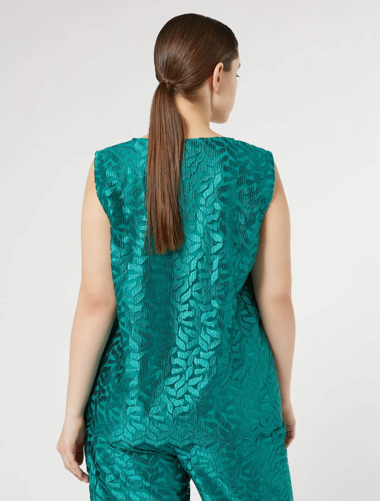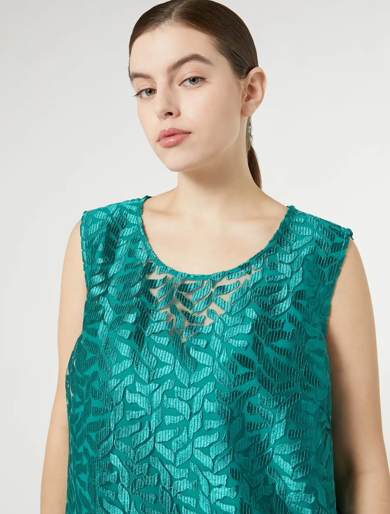 Oberteil aus Tüll mit romantischen Details und stilisierter Blattstickerei. Die Ärmel können unschwer von einem Schneider angebracht werden. Gewellte Säume akzentuieren das Modell mit einem dezenten und raffinierten Touch. Das Kleidungsstück ist Teil der Kollektion Persona by Marina Rinaldi.