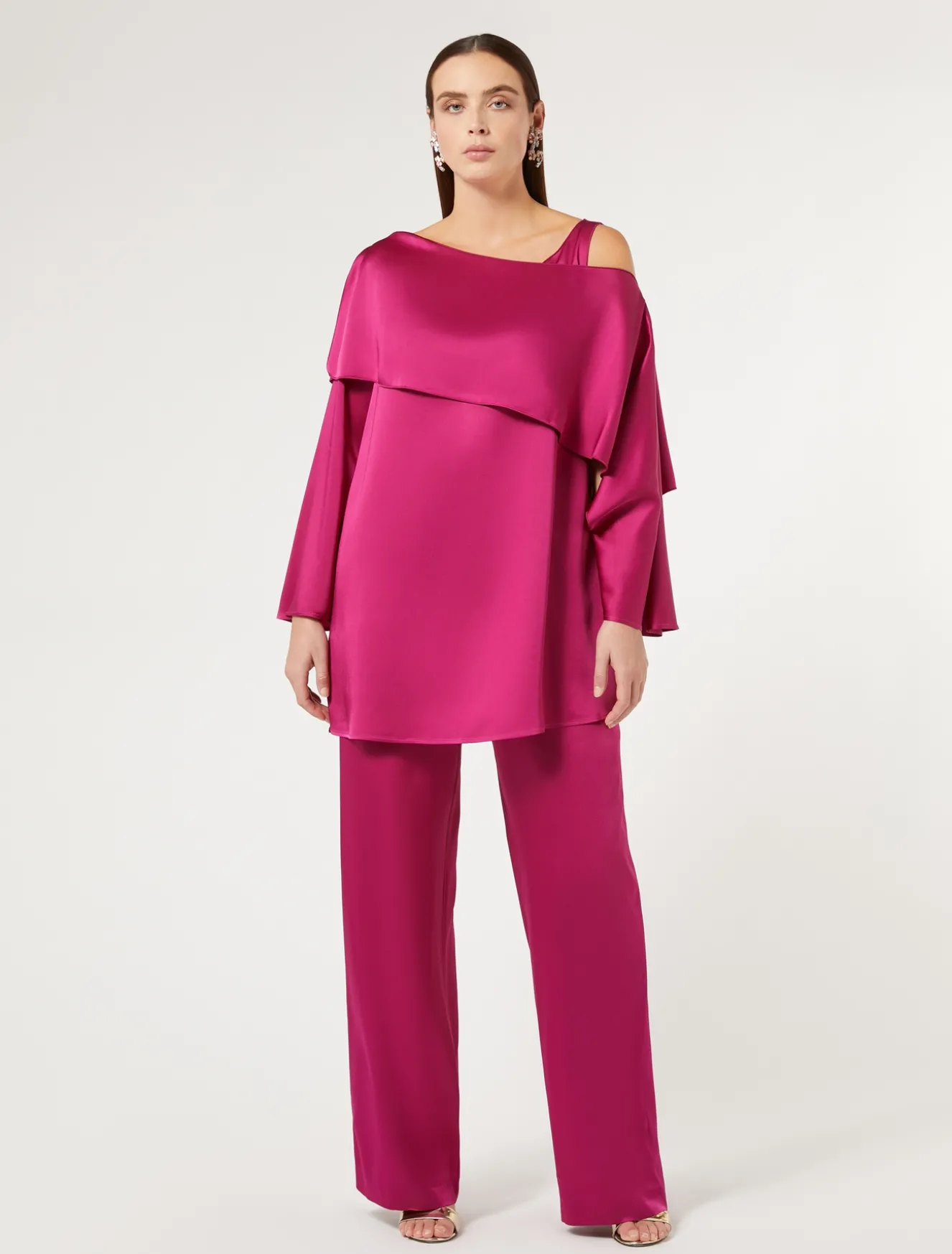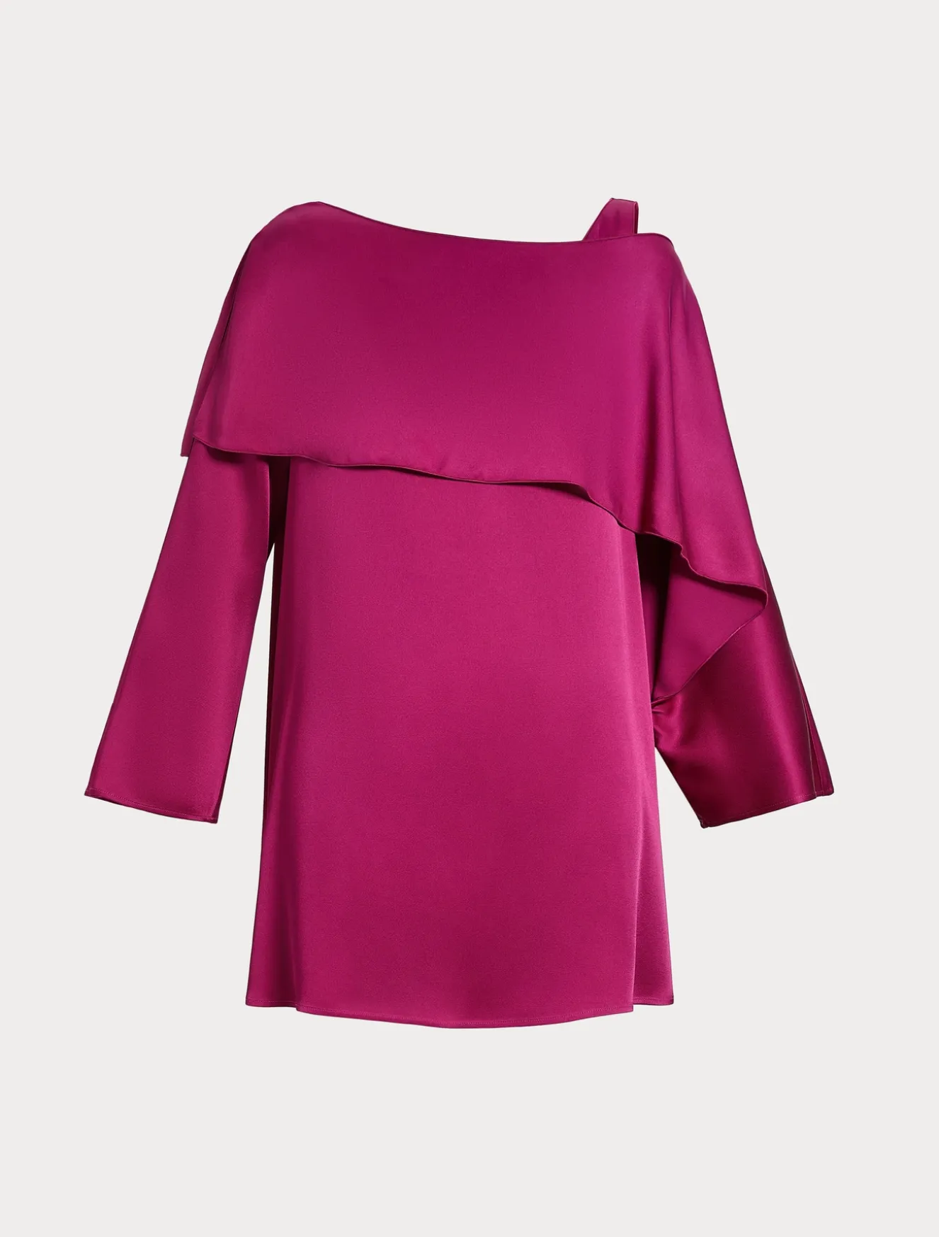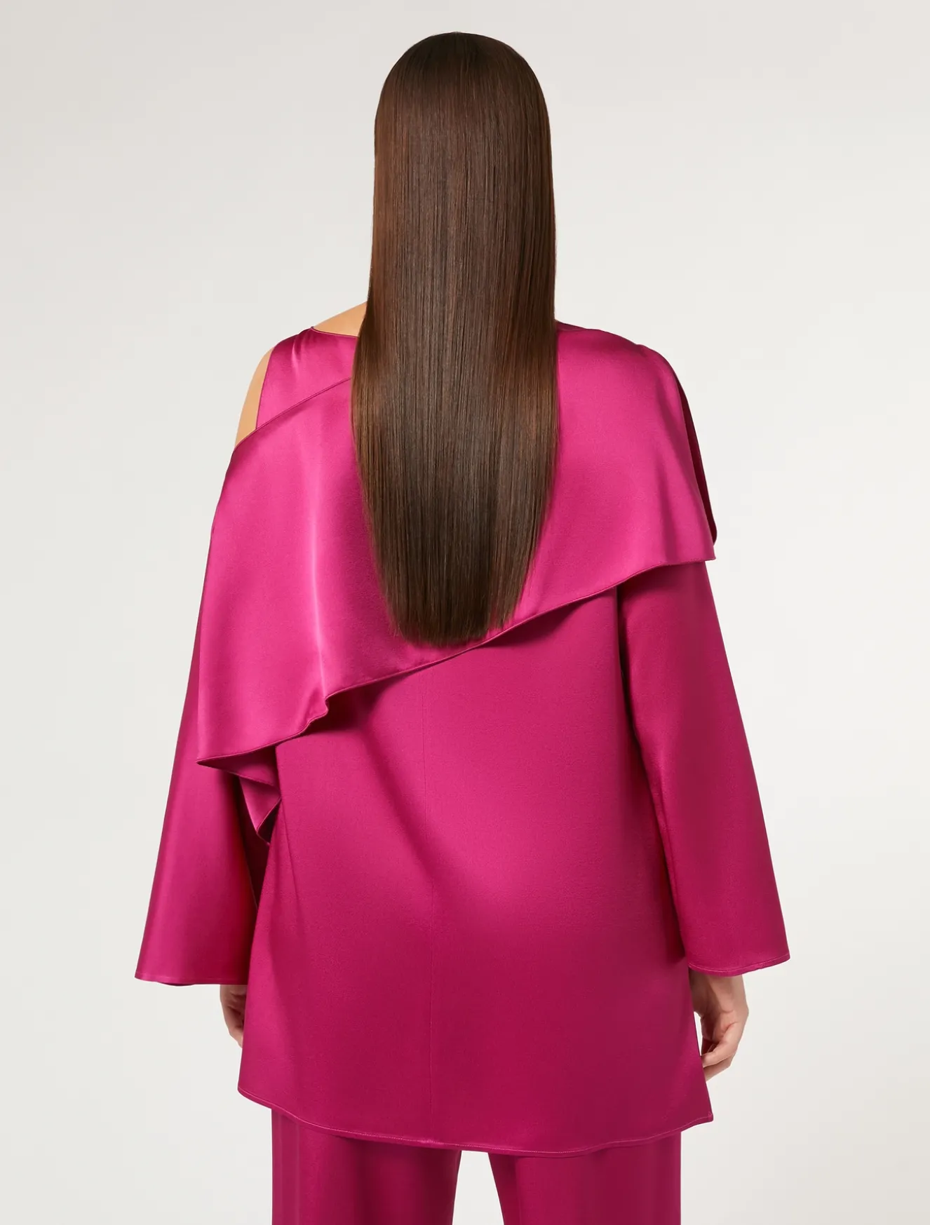Kasack aus glänzendem Crêpe-Envers-Satin mit Trompe-l’œil-Effekt, besonderem asymmetrischem Design und an der Schulter festgenähtem Schultertuch. Ein Must-Have, das sich auch mit der passenden Hose kombinieren lässt.Das Kleidungsstück ist Teil der Kollektion Elegante.
