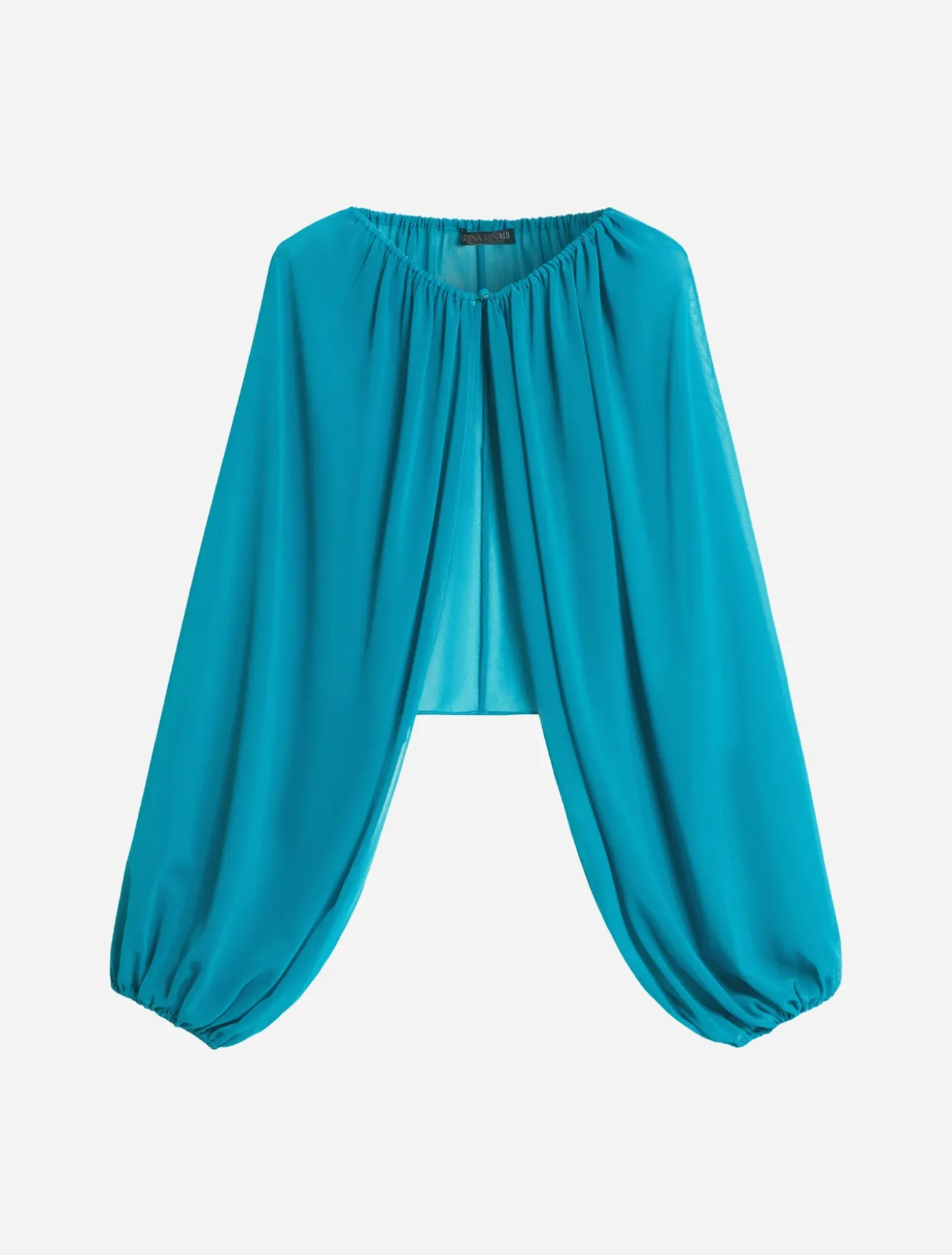 Bolero aus Georgette mit raffiniertem Volumen und weiten Ärmeln, die an Ausschnitt und Bündchen gerafft sind. Perfekt für wichtige Anlässe.Das Kleidungsstück ist Teil der Kollektion Elegante.