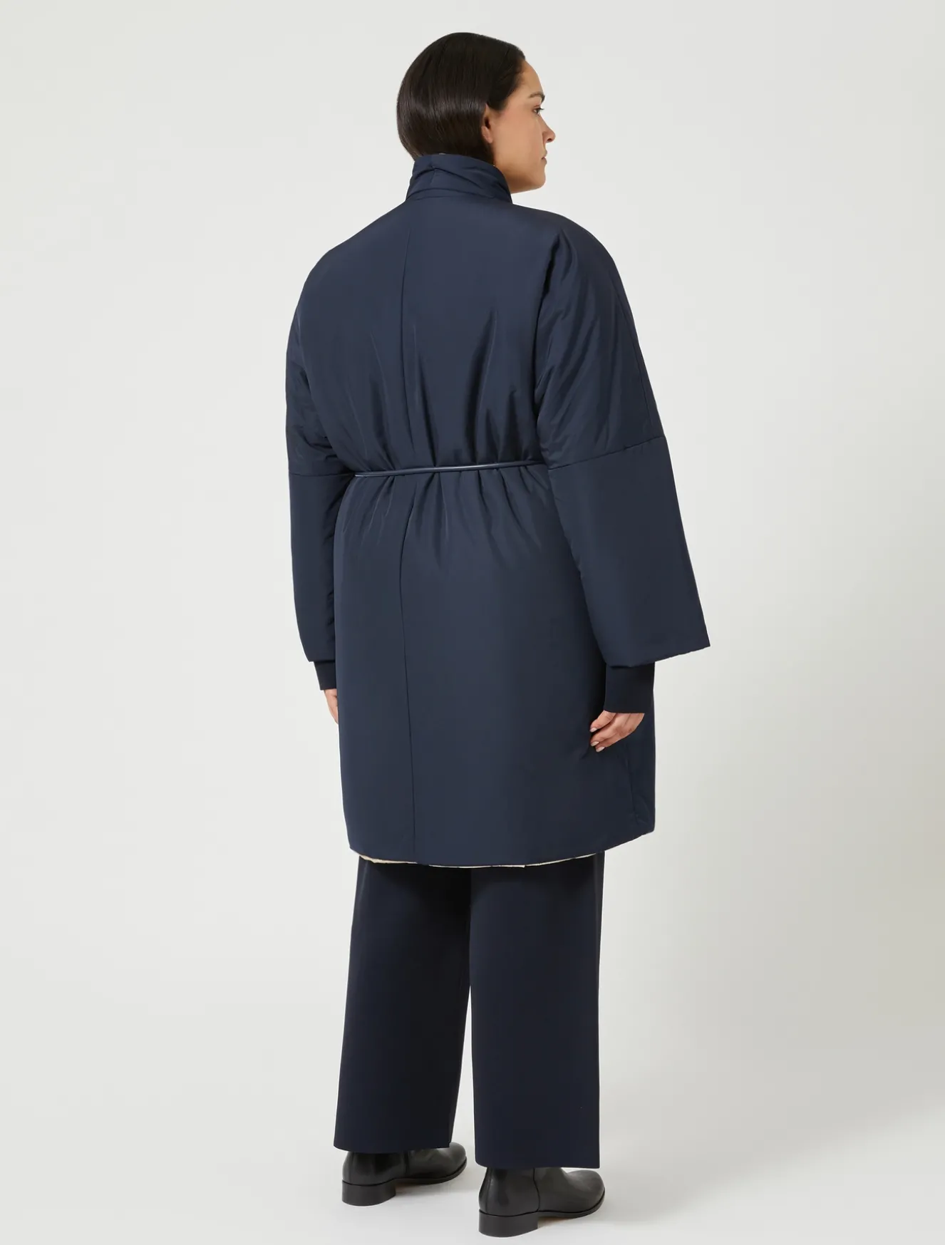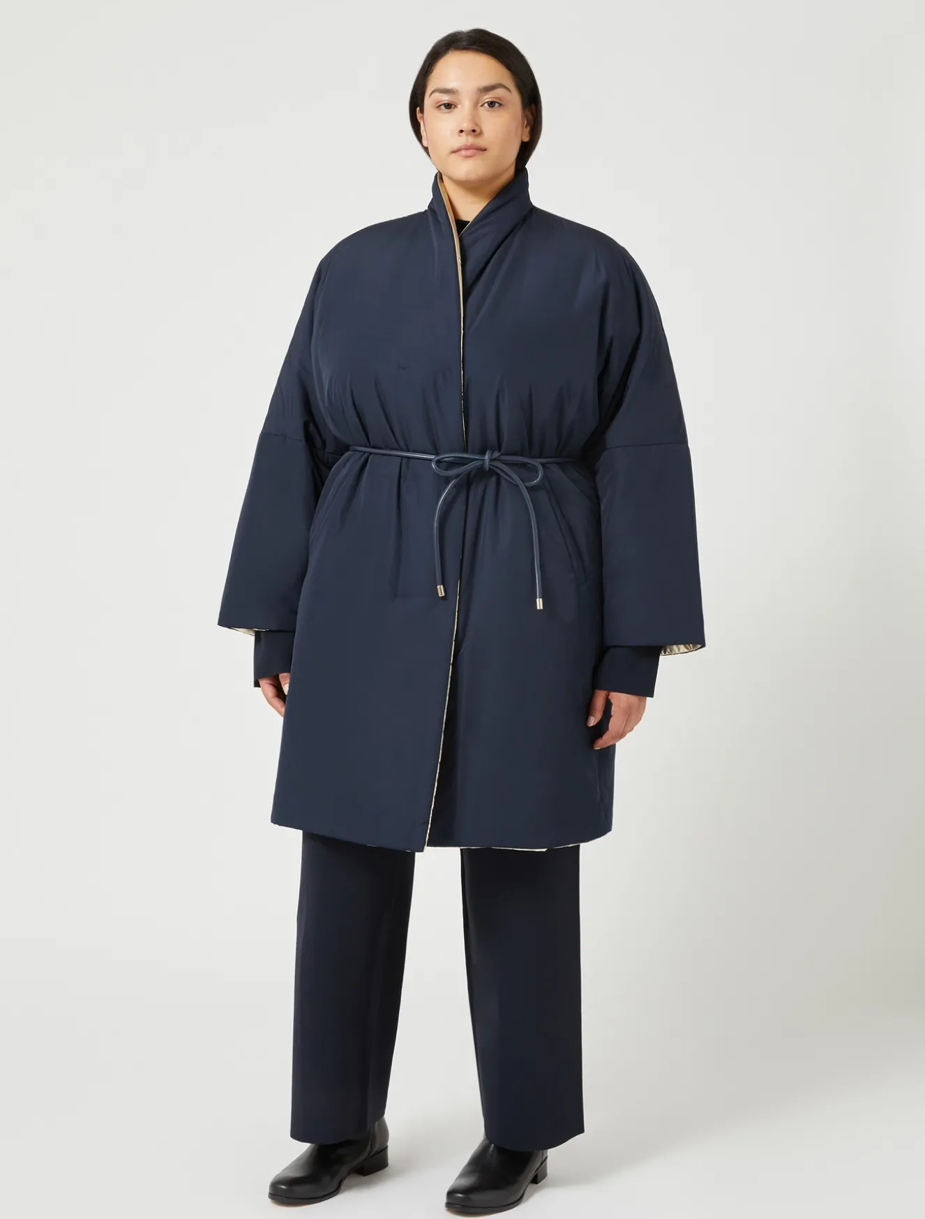 Wattierte Wendejacke aus wasserabweisendem Funktionscanvas auf der einen und einem in Goldfarbenen laminiertem Stoff auf der anderen Seite, die Funktionalität und Glamour gleichzeitig verspricht. Du kannst sie in der Taille mit dem schlauchförmigen Gürtel mit Gürteltasche anpassen.Dieses Modell gehört zur Hauptkollektion von Marina Rinaldi.