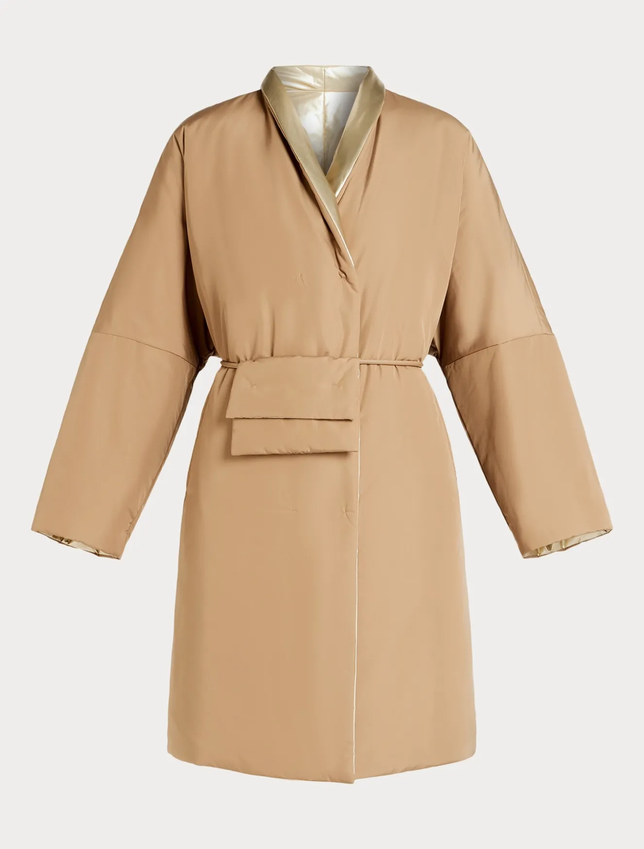 Wattierte Wendejacke aus wasserabweisendem Funktionscanvas auf der einen und einem in Goldfarbenen laminiertem Stoff auf der anderen Seite, die Funktionalität und Glamour gleichzeitig verspricht. Du kannst sie in der Taille mit dem schlauchförmigen Gürtel mit Gürteltasche anpassen.Dieses Modell gehört zur Hauptkollektion von Marina Rinaldi.